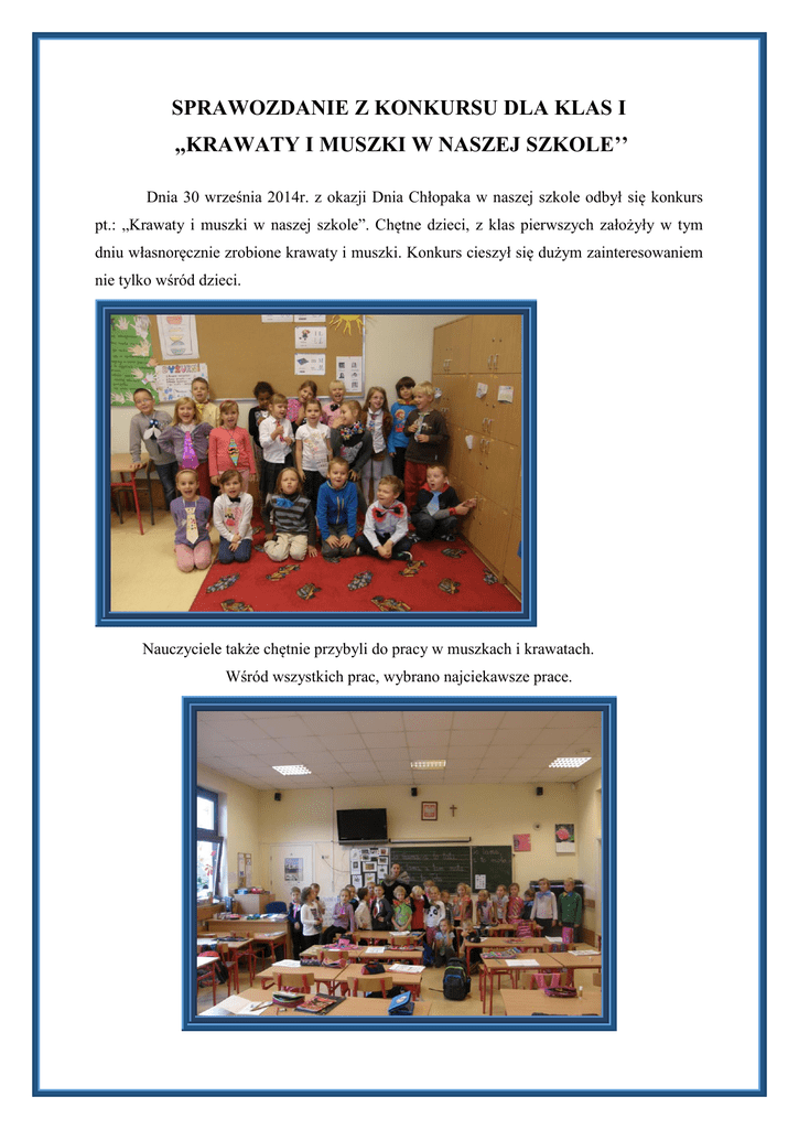 SPRAWOZDANIE Z KONKURSU DLA KLAS I ,,KRAWATY I MUSZKI W NASZEJ SZKOLE’’ Dnia 30 września 2014r. z okazji Dnia Chłopaka w naszej szkole odbył się konkurs pt.: „Krawaty i muszki w naszej szkole”. Chętne dzieci, z klas pierwszych założyły w tym dniu własnoręcznie zrobione krawaty i muszki. Konkurs cieszył się dużym zainteresowaniem nie tylko wśród dzieci. Nauczyciele także chętnie przybyli do pracy w muszkach i krawatach. Wśród wszystkich prac, wybrano najciekawsze prace. WYNIKI KONKURSU Serdecznie dziękujemy za tak liczne przybycie 30 września 2014 we własnoręcznie robionych krawatach i muszkach. Wszystkie pracy zachwyciły nas swoją oryginalnością i pomysłowością, dlatego niezmiernie trudno było wybrać tylko trzy, które zostaną nagrodzone. Po długich i burzliwych naradach, w końcu komisja ustaliła co następuje: I miejsce Kacper Marciniec II miejsce Natalia Sapierzyńska III miejsce Zuzanna Zubrzycka Wyróżnienia: Mateusz Sabala Julia Nowakowska Krzysztof Komor I miejsce w kategorii ilości osób przebranych w klasie otrzymuje: Klasa I b Wyróżnienie w kategorii ilości osób przebranych w klasie: Klasa I d Klasa I f Wielkie brawa i gratulacje dla wszystkich uczestników!