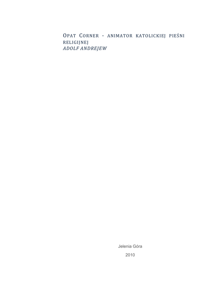 O PAT C ORNER - ANIMATOR KATOLICKIEJ PIEŚNI RELIGIJNEJ ADOLF ANDREJEW Jelenia Góra 2010 Perłę Karkonoszy, jak dawniej określano Jelenią Górę, w odległej przeszłości rozsławili jej znakomici ziomkowie. W ich gronie można było spotkać uczonych europejskiego formatu znawców sztuki lekarskiej, wybitnych uczonych z zakresu prawa, sławnych teologów, mistrzów pióra. Sławę znakomitego muzykologa w okresie kontrreformacji zdobył Dawid Grzegorz Corner. Według najstarszego dziejopisarza Jeleniej Góry Dawida Zellera, Corner urodził się w Jeleniej Górze w roku 1585. Brak przekazów źródłowych nie pozwala na podanie bliższych informacji z najwcześniejszych lat jego życia. Przypuszczać można jedynie, że pierwsze lata swojej edukacji szkolnej spędził w murach jeleniogórskiego gimnazjum renesansowego. W bliżej nieokreślonym czasie młody jeleniogórzanin udał się do Wrocławia celem pogłębienia swoich umiejętności lingwistycznych z zakresu znajomości języka greckiego i łacińskiego na jednej z wrocławskich uczelni. Dalsze swe losy młody Grzegorz związał z Wydziałem Filozoficznym Uniwersytetu w Pradze. Studia na tej uczelni uwieńczył zdobyciem tytułu magistra nauk wyzwolonych i filozofii 28 kwietnia 1609 r. Kolejnym etapem w jego życiu był pobyt w praskim konwikcie jezuickim w latach 1610-14. Czteroletni pobyt w konwikcie Corner wykorzystał na wytężoną pracę nad swą religijnością wyniesioną z domu rodzinnego. Lata spędzone w praskim konwikcie potraktował także jako okres przygotowania się do stanu duchownego. Zasobny miejscowy księgozbiór umożliwił mu zdobycie podstawowej wiedzy z zakresu duszpasterstwa. Wiedzę katechetyczną pogłębił podczas studiów teologicznych w Grazu, u Jezuitów, w latach 1614-18. Po otrzymaniu święceń kapłańskich w roku 1618, podjął pracę duszpasterską, kolejno w Retz, Mautern, Hainfeld i Nalb, na terenie dolnej Austrii. Miał wyjątkową umiejętność łączenia obowiązków duszpasterskich z zainteresowaniami naukowymi z zakresu teologii. Sześcioletnie studia na Uniwersytecie Wiedeńskim ukończył zdobyciem tytułu magistra teologii w 1624 r. Ten 39-letni kapłan uchodził w swym środowisku za wielki autorytet w sprawach naukowych, artystycznych i politycznych. Cesarz Ferdynand II doceniając jego wielką erudycję, głęboką religijność, a także nieprzeciętne uzdolnienia dyplomatyczne, nobilitował go do stanu szlacheckiego wraz z jego dwoma braćmi: Jerzym i Krzysztofem. Monarcha obdarzył go ponadto zaszczytnym tytułem palotyna oraz godnością członka Cesarskiej Rady Nadwornej. Ascetyczne usposobienie Cornera zadecydowało, że młody Ślązak zaczął się interesować życiem monastycznym. Jego wybór padł na Opactwo Benedyktyńskie w Gottweig w dolnej Austrii. Klasztorem tym w latach 1612-31 zarządzał opat Jerzy Falb, znany mecenas, z którym łączyła Cornera wielka przyjaźń. Zafascynowany regułą Św. Benedyktyna 40-letni Corner zdecydował, że dalsze lata swojego życia spędzi w gronie synów Św. Benedykta. 8 września 1625 r. został przyjęty w poczet nowicjuszy benedyktyńskich. Nie dane mu było jednak w zaciszu celi klasztornej przygotowywać się do złożenia profesji zakonnej. Na wiosnę 1626 r. w górnej Austrii wybuchło powstanie chłopskie o podłożu religijnym. Na jego czele stanął Stefan Fadinger. W krótkim czasie cała górna Austria została opanowana przez powstańcze komitety chłopskie. Powstańcy domagali się od cesarza wolności dla osób wyznania ewangelickiego oraz opuszczenia tej części monarchii austriackiej przez zaprzyjaźnione z Cesarzem wojska bawarskie. Po śmierci Fadingera w lipcu 1626 r. atak wojsk bawarskich i cesarskich lancknechtów doprowadził do upadku chłopskiej religii. Dla zaprowadzenia pokoju religijnego na terenach, na których toczyły się walki, cesarz Ferdynand II wyznaczył swojego delegata w osobie opata Falbego. Ten, doceniając wyjątkowość powierzonej sobie misji, wziął ze sobą nowo przyjętego nowicjusza Cornera. Opat Falb za teren swojego działania obrał miasto Linz, w pobliżu którego znajdowała się główna kwatera armii Fadingera. Corner tymczasem działał w górnej Austrii. Przyszło mu prowadzić bardzo trudną pracę misyjną wśród zrewoltowanych ewangelickich mieszczan Freistadtu. Z jego bogatej korespondencji do rodziców wynika, że nie tylko został pozbawiony habitu zakonnego, ale ponadto poddany był licznym duchowym i cielesnym torturom, a nawet pozbawiony na jakiś czas wolności osobistej. Uzyskał ją dopiero po zajęciu Freistadtu przez wojska cesarskie pod koniec sierpnia 1626 r. 8 września tego roku powrócił do opactwa. W tydzień po przybyciu do Gottweig złożył profesję zakonną na ręce opata Falbego. Gruntowna wiedza teologiczna i filozoficzna, znakomita biegłość w zakresie języka greckiego i łacińskiego oraz wrodzone uzdolnienia administracyjne skłoniły opata Falbego do powierzenia mu stanowiska przeora we wspomnianym opactwie. Po śmierci Falbego, ostatniego dnia maja 1631 r., Corner został jednogłośnie wybrany jego następcą Cesarz Ferdynand III uznając wielką erudycję i wrodzone uzdolnienia dyplomatyczne, mianował go swoim osobistym doradcą, zapraszając na posiedzenia Sejmów Krajowych lub na obrady Cesarskiej Rady Nadwornej. Przy podejmowaniu ważnych decyzji Cesarz bardzo często kierował się jego zdaniem. Poważne zasługi Cornera w dziedzinie mecenatu artystycznego oraz posiadanie niekwestionowanego autorytetu w sprawach politycznych i religijnych skłoniło władze Uniwersytetu Wiedeńskiego do powierzenia mu zaszczytnej godności rektora tej uczelni w 1638 r. Corner jako człowiek nauki wielką wagę przywiązywał do stopnia wykształcenia swoich współbraci. Wielu z nich wysłał na renomowane uczelnie europejskie. Opat Corner nie tylko dbał o rozwój Kościoła mistycznego, ale także przywiązywał duże znaczenie do sta
