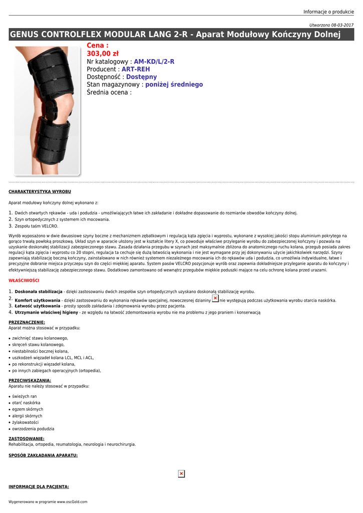 Informacje o produkcie Utworzono 08-03-2017 GENUS CONTROLFLEX MODULAR LANG 2-R - Aparat Modułowy Kończyny Dolnej Cena : 303,00 zł Nr katalogowy : AM-KD/L/2-R Producent : ART-REH Dostępność : Dostępny Stan magazynowy : poniżej średniego Średnia ocena : CHARAKTERYSTYKA WYROBU Aparat modułowy kończyny dolnej wykonano z: 1. Dwóch otwartych rękawów - uda i podudzia - umożliwiających łatwe ich zakładanie i dokładne dopasowanie do rozmiarów obwodów kończyny dolnej. 2. Szyn ortopedycznych z systemem ich mocowania. 3. Zespołu taśm VELCRO. Wyrób wyposażono w dwie dwuosiowe szyny boczne z mechanizmem zębatkowym i regulacją kąta zgięcia i wyprostu, wykonane z wysokiej jakości stopu aluminium pokrytego na gorąco trwałą powłoką proszkową. Układ szyn w aparacie ułożony jest w kształcie litery X, co powoduje właściwe przyleganie wyrobu do zabezpieczonej kończyny i pozwala na uzyskanie doskonałej stabilizacji zabezpieczonego stawu. Zasada działania przegubu w szynach jest maksymalnie zbliżona do anatomicznego ruchu kolana, przegub posiada zakres regulacji kąta zgięcia i wyprostu co 20 stopni, regulacja ta cechuje się dużą łatwością wykonania i nie jest wymagane przy jej dokonywaniu użycie jakichkolwiek narzędzi. Szyny zapewniają stabilizację boczną kończyny, zainstalowano w nich również systemem niezależnego mocowania ich do rękawów uda i podudzia, co umożliwia indywidualne, łatwe i precyzyjne dobranie miejsca przyczepu szyn do części miękkiej aparatu. System pasów VELCRO pozycjonuje wyrób oraz zapewnia dokładniejsze przyleganie aparatu do kończyny i efektywniejszą stabilizację zabezpieczonego stawu. Dodatkowo zamontowano od wewnątrz przegubów miękkie poduszki mające na celu ochronę kolana przed urazami. WŁAŚCIWOŚCI 1. 2. 3. 4. Doskonała stabilizacja - dzięki zastosowaniu dwóch zespołów szyn ortopedycznych uzyskano doskonałą stabilizację wyrobu. Komfort użytkowania - dzięki zastosowaniu do wykonania rękawów specjalnej, nowoczesnej dzianiny Łatwość użytkowania - prosty sposób zakładania i zdejmowania wyrobu przez pacjenta. nie występują podczas użytkowania wyrobu otarcia naskórka. Utrzymanie właściwej higieny - ze względu na łatwość zdemontowania wyrobu nie ma problemu z jego praniem i konserwacją PRZEZNACZENIE: Aparat można stosować w przypadku: ● zwichnięć stawu kolanowego, ● skręceń stawu kolanowego, ● niestabilności bocznej kolana, ● uszkodzeń więzadeł kolana LCL, MCL i ACL, ● po rekonstrukcji więzadeł kolana, ● po innych zabiegach operacyjnych (ortopedia), PRZECIWSKAZANIA: Aparatu nie należy stosować w przypadku: ● świeżych ran ● otarć naskórka ● egzem skórnych ● alergii skórnych ● żylakowatości ● owrzodzenia podudzia ZASTOSOWANIE: Rehabilitacja, ortopedia, reumatologia, neurologia i neurochirurgia. SPOSÓB ZAKŁADANIA APARATU: INFORMACJE DLA PACJENTA: Wygenerowano w programie www.oscGold.com 1. Stosować ściśle według wskazań i pod nadzorem lekarza. 2. Wyrób powinien być po raz pierwszy założony pacjentowi przez lekarza lub przez przeszkolony personel medyczny. 3. Niewłaściwe stosowanie wyrobu lub niewłaściwe dobranie rozmiaru może doprowadzić do upośledzenia krążenia żylnego i tętniczego, traumatyzacji zabezpieczonego stawu, wystąpienia schorzeń skórnych itp. 4. Brak codziennej higieny osobistej lub niewłaściwa konserwacja i pranie wyrobu mogą spowodować otarcia naskórka albo powstanie odczynów alergicznych związanych ze wzmożoną potliwością i rozwojem flory bakteryjnej. GRAFICZNY SCHEMAT ZAKŁADANIA APARATU: KONSERWACJA: 1. 2. 3. 4. Prać ręcznie w letniej wodzie z dodatkiem mydła w temperaturze do 30 stopni. Nie prasować. Nie chlorować. Suszyć z daleka od źródeł ciepła. UWAGA: Przed praniem wymontować szyny boczne wraz z systemem ich mocowania. RODZAJ ZASTOSOWANEJ SZYNY BOCZNEJ Sposób regulacji kąta zgięcia i wyprostu stawu SKŁAD SUROWCOWY: Pianka poliuretanowa, dzianina welurowa, dzianina frotte, szyny ortopedyczne, pasy VELCRO, klamerki poliamidowe, płyta polietylenowa. KODY REFUNDACYJNE NFZ Kod środka Przeznaczenie Odpłatność 9130.14 Aparat na goleń i udo leczenie gruźlicy stawu kolanowego, boczna wiotkość kolana przewlekłe bezpłatnie do zapalenie stawu kolanowego lub po wysokości plastyce operacyjnej stawu limitu kolanowego 9150.19 Orteza na goleń i udo leczenie gruźlicy stawu kolanowego, boczna wiotkość kolana przewlekłe zapalenie stawu kolanowego lub po 30% plastyce operacyjnej stawu kolanowego 9150.18 Orteza stawu kolanowego stabilizująco korygująca leczenie i doleczanie złożonych niestabilności stawu kolanowego 9150.17 Orteza stawu kolanowego stabilizująca z szynami stabilizacja bocznej wiotkości kolana, wzmocnienia przednio-tylnej 30% stabilizacji kolana, rehabilitacja 30% Okres uzywalności raz na trzy lata dysfunkcja stała raz w trakcie leczenia danego schorzenia Lekarze Upoważnieni Limit NFZ ortopeda, chirurg,neurolog, lekarz rehabilitacji medycznej, 650 zł reumatolog ortopeda, chirurg,neurolog, lekarz rehabilitacji medycznej, 650 zł reumatolog dysfunkcja czasowa raz w trakcie leczenia danego schorzenia ortopeda, chirurg,neurolog, lekarz rehabilitacji medycznej, 400 zł reumatolog dysfunkcja czasowa raz w trakcie leczenia danego schorzenia ortopeda, chirurg,neurolog, lekarz rehabilitacji medycznej, 250 zł reumatolog dysfunkcja czasowa Dostepne rozmiary: S, M, L Długość szyny: S - 380 mm M - 470 mm L - 530 mm produkt jest wyposażony w mechanizm zębatkowy Chcesz zadać pytań odnośnie tego produkty naciśnij przycisk (proszę o podanie linku lub nazwy produktu) Informacje o produkcie Chcesz za darmo połączyć się telefonicznie z naszym konsultantem naciśnij zieloną słuchawkę Tagi: Ortezy, Orteza, Stabilizatory Stawu, Stabilizator Stawu, Sklep Medyczny, Sklepy Medyczne, Orteza Stawu Kolanowego, Art-Reh Wygenerowano w programie www.oscGold.com