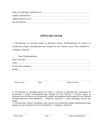 IMIĘ I NAZWISKO ABONENTA ……………………………………………………………. ADRES ABONENTA …………………………………………………………………………. ADRES INSTALACJI ………………………………………………………………………… NR TELEFONU ……………………………………………………………………………….. OŚWIADCZENIE 1. Oświadczam, że wyrażam zgodę na dopisanie mojego Współmałżonka do umowy na świadczenie usługi szerokopasmowego dostępu do sieci Internet przez Firmę Handlowo – Usługową „Intersieć”. Dane Współmałżonka: Imię i nazwisko ………………………………………………………………………………… Adres …………………………………………………………………………………………… Nr dowodu osobistego ……………….……………………………………………………….... PESEL ………………………………………………………………………………………….. …………………. Miejscowość ………………. Data …………………………………………. Podpis Abonenta 2. Oświadczam, że posiadam prawo do lokalu, w którym są zainstalowane urządzenia do korzystania z usługi szerokopasmowego dostępu do sieci Internet i wyrażam zgodę na dopisanie mnie do umowy na świadczenie usługi szerokopasmowego dostępu do sieci Internet świadczonej przez Firmę Handlowo – Usługową „Intersieć” i w pełni akceptuję zawarte tam zapisy. 3. Oświadczenie stanowi integralną część umowy na świadczenie usługi szerokopasmowego dostępu do sieci Internet przez Firmę Handlowo – Usługową „Intersieć”. …………………… Miejscowość …………….. Data …...……………………………. Podpis Współmałżonka