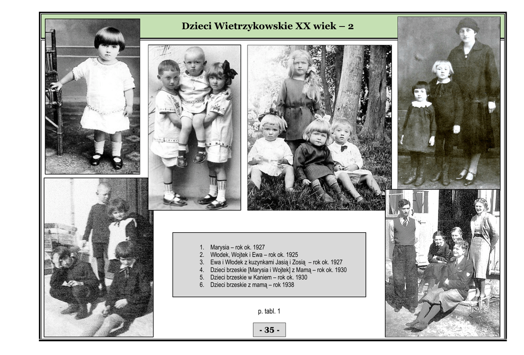 Dzieci Wietrzykowskie XX wiek – 2 1. 2. 3. 4. 5. 6. Marysia – rok ok. 1927 Włodek, Wojtek i Ewa – rok ok. 1925 Ewa i Włodek z kuzynkami Jasią i Zosią – rok ok. 1927 Dzieci brzeskie [Marysia i Wojtek] z Mamą – rok ok. 1930 Dzieci brzeskie w Kaniem – rok ok. 1930 Dzieci brzeskie z mamą – rok 1938 p. tabl. 1 - 35 -