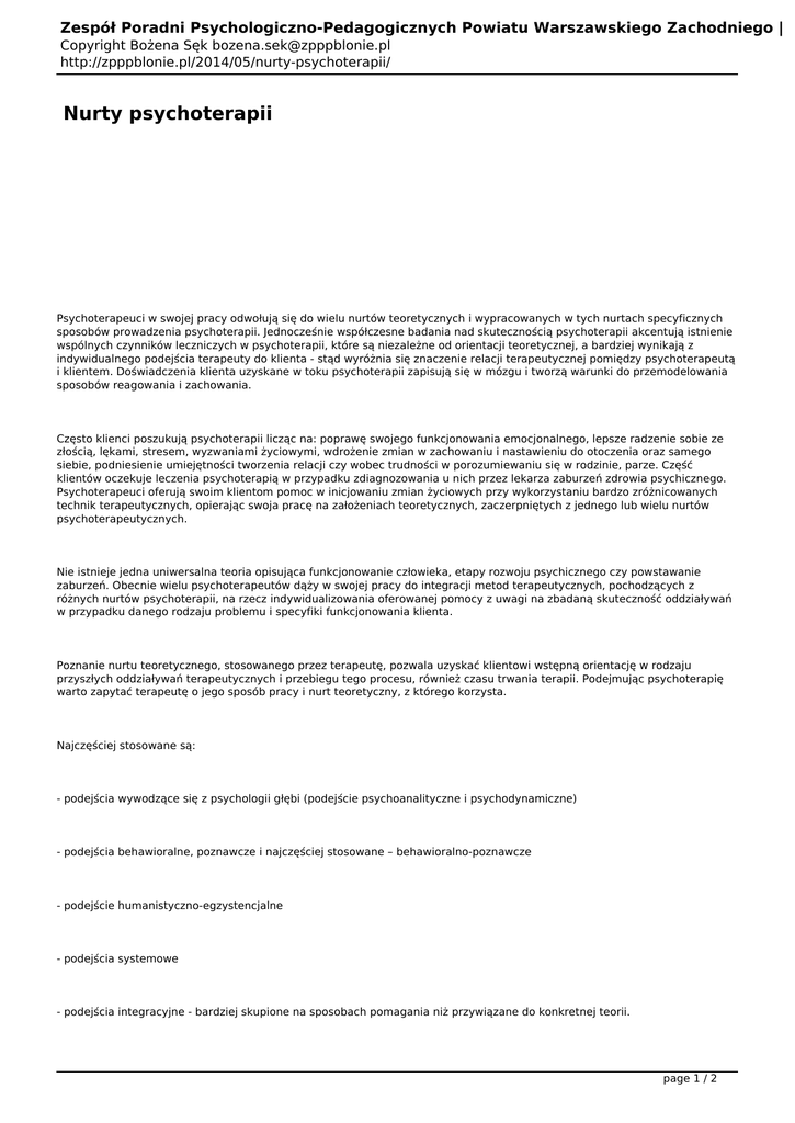 Zespół Poradni Psychologiczno-Pedagogicznych Powiatu Warszawskiego Zachodniego | N Copyright Bożena Sęk [email protected] http://zpppblonie.pl/2014/05/nurty-psychoterapii/ Nurty psychoterapii Psychoterapeuci w swojej pracy odwołują się do wielu nurtów teoretycznych i wypracowanych w tych nurtach specyficznych sposobów prowadzenia psychoterapii. Jednocześnie współczesne badania nad skutecznością psychoterapii akcentują istnienie wspólnych czynników leczniczych w psychoterapii, które są niezależne od orientacji teoretycznej, a bardziej wynikają z indywidualnego podejścia terapeuty do klienta - stąd wyróżnia się znaczenie relacji terapeutycznej pomiędzy psychoterapeutą i klientem. Doświadczenia klienta uzyskane w toku psychoterapii zapisują się w mózgu i tworzą warunki do przemodelowania sposobów reagowania i zachowania. Często klienci poszukują psychoterapii licząc na: poprawę swojego funkcjonowania emocjonalnego, lepsze radzenie sobie ze złością, lękami, stresem, wyzwaniami życiowymi, wdrożenie zmian w zachowaniu i nastawieniu do otoczenia oraz samego siebie, podniesienie umiejętności tworzenia relacji czy wobec trudności w porozumiewaniu się w rodzinie, parze. Część klientów oczekuje leczenia psychoterapią w przypadku zdiagnozowania u nich przez lekarza zaburzeń zdrowia psychicznego. Psychoterapeuci oferują swoim klientom pomoc w inicjowaniu zmian życiowych przy wykorzystaniu bardzo zróżnicowanych technik terapeutycznych, opierając swoja pracę na założeniach teoretycznych, zaczerpniętych z jednego lub wielu nurtów psychoterapeutycznych. Nie istnieje jedna uniwersalna teoria opisująca funkcjonowanie człowieka, etapy rozwoju psychicznego czy powstawanie zaburzeń. Obecnie wielu psychoterapeutów dąży w swojej pracy do integracji metod terapeutycznych, pochodzących z różnych nurtów psychoterapii, na rzecz indywidualizowania oferowanej pomocy z uwagi na zbadaną skuteczność oddziaływań w przypadku danego rodzaju problemu i specyfiki funkcjonowania klienta. Poznanie nurtu teoretycznego, stosowanego przez terapeutę, pozwala uzyskać klientowi wstępną orientację w rodzaju przyszłych oddziaływań terapeutycznych i przebiegu tego procesu, również czasu trwania terapii. Podejmując psychoterapię warto zapytać terapeutę o jego sposób pracy i nurt teoretyczny, z którego korzysta. Najczęściej stosowane są: - podejścia wywodzące się z psychologii głębi (podejście psychoanalityczne i psychodynamiczne) - podejścia behawioralne, poznawcze i najczęściej stosowane – behawioralno-poznawcze - podejście humanistyczno-egzystencjalne - podejścia systemowe - podejścia integracyjne - bardziej skupione na sposobach pomagania niż przywiązane do konkretnej teorii. page 1 / 2 Zespół Poradni Psychologiczno-Pedagogicznych Powiatu Warszawskiego Zachodniego | N Copyright Bożena Sęk [email protected] http://zpppblonie.pl/2014/05/nurty-psychoterapii/ Terapia psychoanalityczna ma za cel zmianę wewnętrznych struktur osobowości jednostki. Służyć temu ma doprowadzenie treści nieświadomych do świadomości osoby, proces zmiany nieświadomych impulsów i rozwiązywanie nieuświadomionych konfliktów emocjonalnych. Psychoanalitycy uważają, ze zmianie służy uwolnienie tłumionych uczuć, zyskanie wglądu i nabycie umiejętności do rozróżniania tego co jest fantazją od tego co jest rzeczywiste. Starają się powiązać teraźniejszość z przeszłością osoby, stosując interpretację, pozostając neutralnym, obiektywnym i zdystansowanym wobec klienta. Klasyczna psychoanaliza może trwać kilka lat i wymagać kilku sesji w tygodniu. Terapie w podejściu psychodynamicznym (stosowane obecnie znacznie częściej) są krótsze i za cel stawiają sobie okazanie klientowi pomocy w przezwyciężeniu jego największych trudności, przy wyodrębnieniu określonego konfliktu, kryzysu relacji i poświęceniu uwagi właśnie tym aspektom . Powyższe nurty psychoterapii stosowane często w leczeniu zaburzeń nerwicowych i zaburzeń osobowości. Terapia poznawcza (kognitywna) dąży do zmiany nieprawidłowych przekonań i błędów myślenia, które opisuje jako przyczynę zaburzeń emocjonalnych i zaburzeń w zachowaniu. Metoda ta skłania klienta do rozważań nad swoim sposobem myślenia. Znajduje często zastosowanie w leczeniu łagodnych postaci depresji, w zaburzeniach lękowych i uzależnieniach. Terapia behawioralna ma za zadanie zmianę zachowania, które jest efektem wyuczonego sposobu funkcjonowania. Nie odnosi się ani do procesów nieświadomych ani w analizy myślenia jednostki. Wykorzystuje obserwację i analizę zachowania dążąc do zmiany. Terapeuta autorytarnie kieruje postępowaniem klienta i stawia mu określone wymagania. Ten rodzaj terapii bywa wykorzystywany często w leczeniu min: fobii, zaburzeń zachowania. Obecnie podejście poznawcze i behawioralne najczęściej są scalane w obrębie terapii poznawczo-behawioralnej. Terapie humanistyczno-egzystencjalne (w tym terapia Gestalt) koncentrują się na stworzeniu klientowi możliwości do doświadczania samego siebie, dokonywaniu wyborów, zgodnych z pragnieniami osoby. Terapeuta zwykle niedyrektywnie koncentruje pacjenta na emocjach i doświadczeniach, dąży do stworzenia pacjentowi możliwości do rozwoju, by ten sam mógł zrozumieć swoje problemy i wprowadzić zmiany życiowe, które staną się jego wyborem. Psychoterapeuta nie przyjmuje tu pozycji eksperta, raczej towarzyszy klientowi w procesie. Ten nurt terapii często jest stosowany również w psychoterapii grupowej. Terapie w podejściu systemowym służą zwykle rozwiązywaniu problemów rodziny. Podejścia systemowe zakładają, że jednostka podlega licznym oddziaływaniom bliskich i funkcjonuje w zależnościach emocjonalnych z nimi jako cześć systemu rodzinnego. Stąd, by uleczyć problem manifestowany przez jedną osobę (np.: problem dziecka) niezbędne są oddziaływania 