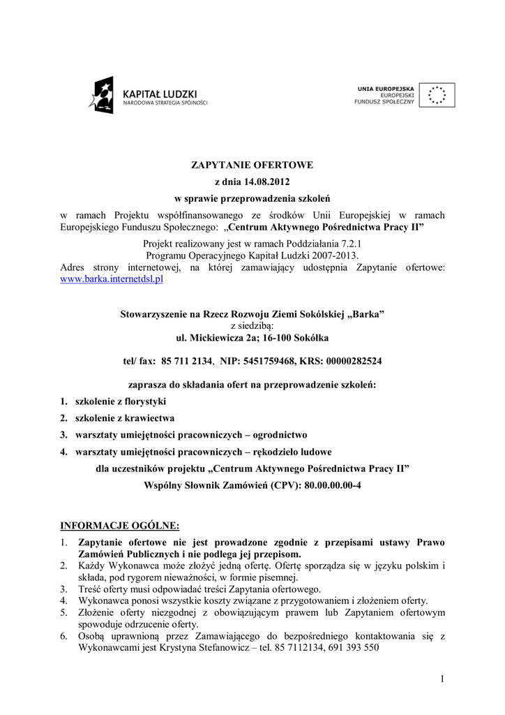 ZAPYTANIE OFERTOWE z dnia 14.08.2012 w sprawie przeprowadzenia szkoleń w ramach Projektu współfinansowanego ze środków Unii Europejskiej w ramach Europejskiego Funduszu Społecznego: „Centrum Aktywnego Pośrednictwa Pracy II” Projekt realizowany jest w ramach Poddziałania 7.2.1 Programu Operacyjnego Kapitał Ludzki 2007-2013. Adres strony internetowej, na której zamawiający udostępnia Zapytanie ofertowe: www.barka.internetdsl.pl Stowarzyszenie na Rzecz Rozwoju Ziemi Sokólskiej „Barka” z siedzibą: ul. Mickiewicza 2a; 16-100 Sokółka tel/ fax: 85 711 2134, NIP: 5451759468, KRS: 00000282524 zaprasza do składania ofert na przeprowadzenie szkoleń: 1. szkolenie z florystyki 2. szkolenie z krawiectwa 3. warsztaty umiejętności pracowniczych – ogrodnictwo 4. warsztaty umiejętności pracowniczych – rękodzieło ludowe dla uczestników projektu „Centrum Aktywnego Pośrednictwa Pracy II” Wspólny Słownik Zamówień (CPV): 80.00.00.00-4 INFORMACJE OGÓLNE: 1. 2. 3. 4. 5. 6. Zapytanie ofertowe nie jest prowadzone zgodnie z przepisami ustawy Prawo Zamówień Publicznych i nie podlega jej przepisom. Każdy Wykonawca może złożyć jedną ofertę. Ofertę sporządza się w języku polskim i składa, pod rygorem nieważności, w formie pisemnej. Treść oferty musi odpowiadać treści Zapytania ofertowego. Wykonawca ponosi wszystkie koszty związane z przygotowaniem i złożeniem oferty. Złożenie oferty niezgodnej z obowiązującym prawem lub Zapytaniem ofertowym spowoduje odrzucenie oferty. Osobą uprawnioną przez Zamawiającego do bezpośredniego kontaktowania się z Wykonawcami jest Krystyna Stefanowicz – tel. 85 7112134, 691 393 550 1 PRZEDMIOT ZAPYTANIA: Przedmiotem Zapytania ofertowego jest usługa: przeprowadzenie szkolenia z florystyki, szkolenia z krawiectwa, warsztatów umiejętności pracowniczych-ogrodnictwo, warsztatów umiejętności pracowniczych-rękodzieło ludowe dla uczestników projektu „Centrum Aktywnego Pośrednictwa Pracy II” zgodnie z poniższą specyfikacją: I. Uczestnikami szkoleń będzie 13 osób w wieku 19-55 lat. II. Zamówienie obejmuje: 1. opracowanie i realizację programu 48-godzinnego szkolenia z florystyki, uwzględniającego następującą tematykę: teoria barw i kompozycji, florystyczne zasady kompozycyjne, narzędzia florysty – materiałoznawstwo, materiał roślinny, florystyka okolicznościowa, sztuka układania kwiatów w naczyniach, 2. opracowanie i realizację programu 36-godzinnego szkolenia z krawiectwa, uwzględniającego następującą tematykę: podstawowe techniki szycia oraz zasady wykonywania wykrojów, rodzaje tkanin, ich właściwości i zastosowanie, 3. opracowanie i realizację programu 48-godzinnych warsztatów umiejętności pracowniczych-ogrodnictwo, uwzględniających następującą tematykę: założenie hodowli ziół i roślin ozdobnych, prace pielęgnacyjne na zieleńcach i rabacie kwiatowej, sadzenie roślin ozdobnych do skrzynek, zwalczanie szkodników, 4. opracowanie i realizację programu 48-godzinnych warsztatów umiejętności pracowniczych-rękodzieło ludowe, uwzględniających następującą tematykę: malowane na szkle, ozdoby wykonywane techniką karczochową, technika decoupage, kwiaty z bibuły, 5. przygotowanie materiałów szkoleniowych dla wszystkich uczestników szkoleń, 6. ustne informowanie uczestników o współfinansowaniu szkolenia przez Unię Europejską w ramach Europejskiego Funduszu Społecznego. III. Zamawiający zapewni trenerowi/trenerom sale szkoleniowe wyposażone w komputer, rzutnik multimedialny, flipchart, flamastry, materiały i narzędzia do prowadzenia zajęć, 2 maszyny do szycia. IV. Zamawiający dopuszcza możliwość składania ofert częściowych, np. na realizację szkolenia z florystyki. TERMIN I MIEJSCE REALIZACJI: Szkolenia należy zrealizować w terminach: 1. szkolenie z florystyki: 01.10.2012r. – 31.01.2013r., jeden raz w tygodniu w godzinach 16.00-19.00 ul. Mickiewicza 2a 16-100 Sokółka 2. szkolenie z krawiectwa: 01.02.2013r. – 30.04.2013r., jeden raz w tygodniu w godzinach 16.00-19.00 ul. Mickiewicza 2a 16-100 Sokółka 3. warsztaty umiejętności pracowniczych - ogrodnictwo: 01.04.2013r. – 30.06.2013r., 01.09.2013r. – 30.09.2013r. jeden raz w tygodniu w godzinach 16.00-19.00 ul. Mickiewicza 2a 16-100 Sokółka 4. warsztaty umiejętności pracowniczych – rękodzieło ludowe: 01.09.2013r. – 31.12.2013r., jeden raz w tygodniu w godzinach 16.00-19.00 ul. Mickiewicza 2a 16100 Sokółka 2 WARUNKI UDZIAŁU W POSTĘPOWANIU I. O udzielenie zamówienia mogą ubiegać się Wykonawcy, którzy: 1. posiadają kwalifikacje zawodowe w zakresie objętym szkoleniami, 2. posiadają uprawnienia pedagogiczne. II. Ocena spełnienia warunków udziału w postępowaniu zostanie dokonana według formuły spełnia-nie spełnia, w oparciu o informacje zawarte w Formularzu ofertowym. OPIS SPOSOBU PRZYGOTOWANIA OFERT: 1. 2. 3. 4. 5. 6. 7. Oferta powinna być sporządzona w formie pisemnej, w języku polskim, na formularzu ofertowym załączonym do niniejszego zapytania. Do formularza ofertowego należy dołączyć własnoręcznie podpisane oświadczenie Oferenta o braku powiązań osobowych lub kapitałowych ze Stowarzyszeniem na Rzecz Rozwoju Ziemi Sokólskiej ”Barka” (wzór oświadczenia do pobrania razem z formularzem ofertowym). Oferta musi zostać złożona w formie papierowej. Zaoferowana cena musi być wyrażona jako cena brutto w złotych polskich i określać wartość przedmiotu zamówienia w sposób kompletny i jednoznaczny. Oferta musi być podpisana własnoręcznie przez Wykonawcę. Wykonawca ponosi wszelkie koszty związane z przygotowaniem i złożeniem oferty. Zaleca się, aby: - ewentualne poprawki i skreślenia lub zmiany w tekście oferty były parafowane przez Wykonawcę - każda zapisana strona oferty była parafowana i ponumerowana kolejnymi numerami, - kartki oferty były spięte. SPOSÓB I TERMIN ZŁOŻENIA OFERTY ORAZ OTWARCIA OFER