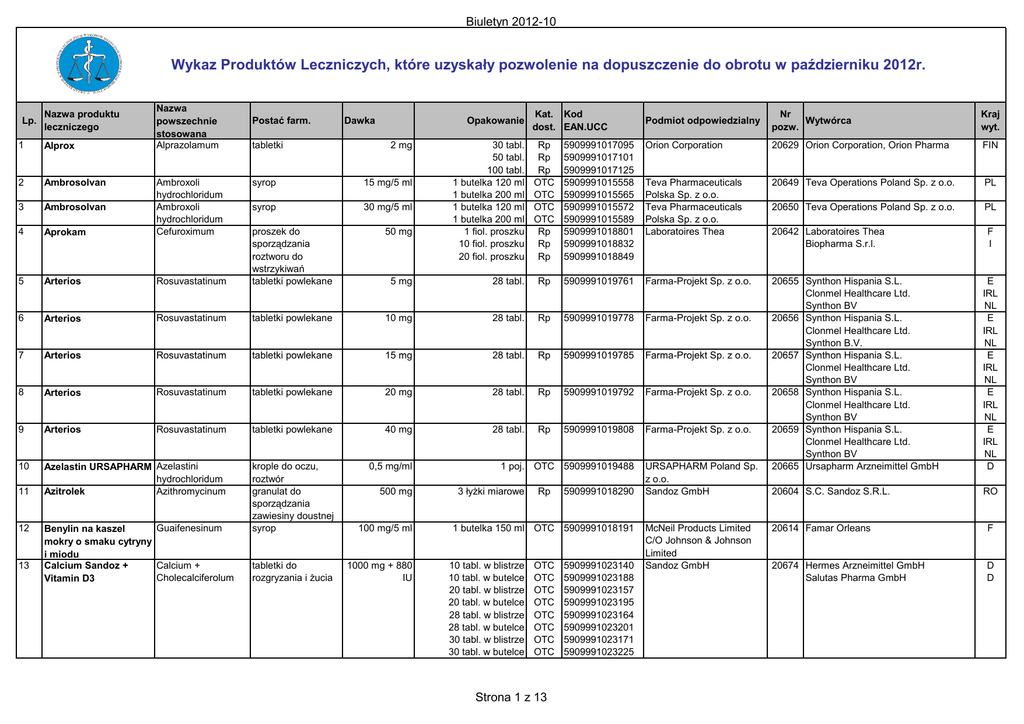 Biuletyn 2012-10 Wykaz Produktów Leczniczych, które uzyskały pozwolenie na dopuszczenie do obrotu w październiku 2012r. CZ ÓJ OB YCH URZĄ DR EJ E Lp. I PRODUKT CH ÓW NY BI CZ PRODUKTÓW CJI LE RA C ST YROBÓ W CH W ME ZY IC DY ZN Nazwa produktu leczniczego Nazwa powszechnie stosowana Alprazolamum 1 Alprox 2 Ambrosolvan 3 Ambrosolvan 4 Aprokam Ambroxoli hydrochloridum Ambroxoli hydrochloridum Cefuroximum 5 Arterios 6 Postać farm. tabletki Dawka Opakowanie 2 mg syrop 15 mg/5 ml syrop 30 mg/5 ml 30 tabl. 50 tabl. 100 tabl. 1 butelka 120 ml 1 butelka 200 ml 1 butelka 120 ml 1 butelka 200 ml 1 fiol. proszku 10 fiol. proszku 20 fiol. proszku Kat. Kod dost. EAN.UCC Podmiot odpowiedzialny Nr Wytwórca pozw. Kraj wyt. Rp Rp Rp OTC OTC OTC OTC Rp Rp Rp 5909991017095 5909991017101 5909991017125 5909991015558 5909991015565 5909991015572 5909991015589 5909991018801 5909991018832 5909991018849 Orion Corporation 20629 Orion Corporation, Orion Pharma FIN Teva Pharmaceuticals Polska Sp. z o.o. Teva Pharmaceuticals Polska Sp. z o.o. Laboratoires Thea 20649 Teva Operations Poland Sp. z o.o. PL 20650 Teva Operations Poland Sp. z o.o. PL 20642 Laboratoires Thea Biopharma S.r.l. F I 20655 Synthon Hispania S.L. Clonmel Healthcare Ltd. Synthon BV 20656 Synthon Hispania S.L. Clonmel Healthcare Ltd. Synthon B.V. 20657 Synthon Hispania S.L. Clonmel Healthcare Ltd. Synthon BV 20658 Synthon Hispania S.L. Clonmel Healthcare Ltd. Synthon BV 20659 Synthon Hispania S.L. Clonmel Healthcare Ltd. Synthon BV 20665 Ursapharm Arzneimittel GmbH E IRL NL E IRL NL E IRL NL E IRL NL E IRL NL D 20604 S.C. Sandoz S.R.L. RO 50 mg Rosuvastatinum proszek do sporządzania roztworu do wstrzykiwań tabletki powlekane 5 mg 28 tabl. Rp 5909991019761 Farma-Projekt Sp. z o.o. Arterios Rosuvastatinum tabletki powlekane 10 mg 28 tabl. Rp 5909991019778 Farma-Projekt Sp. z o.o. 7 Arterios Rosuvastatinum tabletki powlekane 15 mg 28 tabl. Rp 5909991019785 Farma-Projekt Sp. z o.o. 8 Arterios Rosuvastatinum tabletki powlekane 20 mg 28 tabl. Rp 5909991019792 Farma-Projekt Sp. z o.o. 9 Arterios Rosuvastatinum tabletki powlekane 40 mg 28 tabl. Rp 5909991019808 Farma-Projekt Sp. z o.o. 10 Azelastin URSAPHARM Azelastini hydrochloridum Azithromycinum Azitrolek krople do oczu, roztwór granulat do sporządzania zawiesiny doustnej syrop 0,5 mg/ml 100 mg/5 ml tabletki do rozgryzania i żucia 1000 mg + 880 IU 11 12 13 Guaifenesinum Benylin na kaszel mokry o smaku cytryny i miodu Calcium + Calcium Sandoz + Cholecalciferolum Vitamin D3 500 mg 1 poj. OTC 5909991019488 3 łyżki miarowe Rp 5909991018290 1 butelka 150 ml OTC 5909991018191 10 tabl. w blistrze 10 tabl. w butelce 20 tabl. w blistrze 20 tabl. w butelce 28 tabl. w blistrze 28 tabl. w butelce 30 tabl. w blistrze 30 tabl. w butelce OTC OTC OTC OTC OTC OTC OTC OTC Strona 1 z 13 5909991023140 5909991023188 5909991023157 5909991023195 5909991023164 5909991023201 5909991023171 5909991023225 URSAPHARM Poland Sp. z o.o. Sandoz GmbH McNeil Products Limited C/O Johnson & Johnson Limited Sandoz GmbH 20614 Famar Orleans F 20674 Hermes Arzneimittel GmbH Salutas Pharma GmbH D D Biuletyn 2012-10 Nazwa produktu Lp. leczniczego 14 15 Capecitabine Intas Capecitabine Intas Nazwa powszechnie stosowana Capecitabinum Capecitabinum Postać farm. tabletki powlekane tabletki powlekane Dawka Opakowanie 150 mg 500 mg 16 Clopidogrel USV Europe Clopidogrelum tabletki powlekane 75 mg 17 Co-Olimestra Olmesartanum medoxomilum + Hydrochlorothiazidu m tabletki powlekane 20 mg + 12,5 mg 18 Co-Olimestra Olmesartanum medoxomilum + Hydrochlorothiazidu m tabletki powlekane 20 mg + 25 mg Kat. Kod dost. EAN.UCC 30 tabl. Rp 60 tabl. Rp 120 tabl. Rp 30 tabl. Rp 60 tabl. Rp 120 tabl. Rp 7 tabl. 14 tabl. 28 tabl. 30 tabl. 84 tabl. w blistrze 84 tabl. w pojemniku 90 tabl. w blistrze 90 tabl. w pojemniku 100 tabl. w blistrze 100 tabl. w pojemniku 500 tabl. 1000 tabl. 14 tabl. 28 tabl. 30 tabl. 56 tabl. 60 tabl. 84 tabl. 90 tabl. 98 tabl. 100 tabl. 14 tabl. 28 tabl. 30 tabl. 56 tabl. 60 tabl. 84 tabl. 90 tabl. 98 tabl. 100 tabl. Rp Rp Rp Rp Rp Rp Rp Rp Rp Rp Rp Rp Rp Rp Rp Rp Rp Rp Rp Rp Rp Rp Rp Rp Rp Rp Rp Rp Rp Rp Strona 2 z 13 5909991020897 5909991020941 5909991020958 5909991020903 5909991020965 5909991020934 5909991020972 5909991021009 5909991021023 5909991020989 5909991021030 5909991020996 5909991022860 5909991022877 5909991022884 5909991022891 5909991022907 5909991022952 5909991022938 5909991022969 5909991022945 5909991022976 5909991022983 5909991022990 5909991018955 5909991018962 5909991018979 5909991018986 5909991018993 5909991019006 5909991019020 5909991019037 5909991019044 5909991019051 5909991019068 5909991019075 5909991019082 5909991019099 5909991019105 5909991019129 5909991019136 5909991019143 Podmiot odpowiedzialny Nr Wytwórca pozw. Kraj wyt. Intas Pharmaceuticals Limited 20666 Accord Healthcare Ltd Pharmacare Premium Ltd. GB MT Intas Pharmaceuticals Limited 20667 Accord Healthcare Ltd Pharmacare Premium Ltd. GB MT USV Europe Limited 20709 Accord Healthcare Ltd GB Miklich Laboratorios S.L. 20635 Tad Pharma GmbH Krka, d.d., Novo mesto D SLO Miklich Laboratorios S.L. 20634 Tad Pharma GmbH Krka d.d. D SLO Biuletyn 2012-10 Nazwa produktu Lp. leczniczego 19 Co-Olimestra 20 Co-Olimestra 21 Nazwa powszechnie stosowana Olmesartanum medoxomilum + Hydrochlorothiazidu m Postać farm. Dawka Opakowanie tabletki powlekane 40 mg + 12,5 mg Olmesartanum medoxomilum + Hydrochlorothiazidu m tabletki powlekane 40 mg + 25 mg Crosuvo Rosuvastatinum tabletki powlekane 5 mg 22 Crosuvo Rosuvastatinum tabletki powlekane 10 mg 23 Crosuvo Rosuvastatinum tabletki powlekane 20 mg 24 Crosuvo Rosuvastatinum tabletki powlekane 40 mg 25 Dacarbazin Lipomed Dacarbazinum 26 Desloratadine Arrow Desloratadinum proszek do sporządzania roztworu do wstrzykiwań lub infuzji roztwór doustny 27 Desloratadine Arrow Desloratadinum tabletki powlekane 200 mg 0,5 mg/ml 5 mg Kat. Kod dost. EAN.UCC Podmiot odpowiedzialny Nr Wytwórca pozw. Kraj wyt. 14 tabl. 28 tabl. 30 tabl