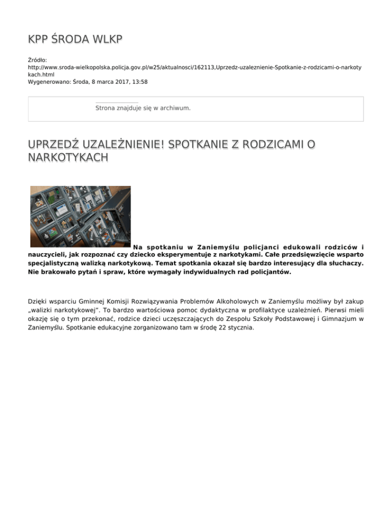 KPP ŚRODA WLKP Źródło: http://www.sroda-wielkopolska.policja.gov.pl/w25/aktualnosci/162113,Uprzedz-uzaleznienie-Spotkanie-z-rodzicami-o-narkoty kach.html Wygenerowano: Środa, 8 marca 2017, 13:58 Strona znajduje się w archiwum. UPRZEDŹ UZALEŻNIENIE! SPOTKANIE Z RODZICAMI O NARKOTYKACH Na spotkaniu w Zaniemyślu policjanci edukowali rodziców i nauczycieli, jak rozpoznać czy dziecko eksperymentuje z narkotykami. Całe przedsięwzięcie wsparto specjalistyczną walizką narkotykową. Temat spotkania okazał się bardzo interesujący dla słuchaczy. Nie brakowało pytań i spraw, które wymagały indywidualnych rad policjantów. Dzięki wsparciu Gminnej Komisji Rozwiązywania Problemów Alkoholowych w Zaniemyślu możliwy był zakup „walizki narkotykowej”. To bardzo wartościowa pomoc dydaktyczna w profilaktyce uzależnień. Pierwsi mieli okazję się o tym przekonać, rodzice dzieci uczęszczających do Zespołu Szkoły Podstawowej i Gimnazjum w Zaniemyślu. Spotkanie edukacyjne zorganizowano tam w środę 22 stycznia. Pomysłodawczyni całego przedsięwzięcia – dyrektor szkoły Małgorzata Fertała, kierując słowa wstępu do zgromadzonych podkreślała, że w miłości rodzicielskiej zaufanie i kontrolowanie dziecka powinno się odpowiednio równoważyć. Wskazywała, że interesowanie się tym, gdzie i co robi pociecha jest dbaniem o bezpieczeństwo i prawidłowy rozwój dziecka. Główny trzon spotkania stanowiło wystąpienie zaproszonych na wykład policjantów. Mundurowi z Komendy Powiatowej Policji w Środzie Wlkp. bazując na zawartości specjalistycznej walizki, omawiali poszczególne substancje odurzające i wskazywali co powinno rodziców i nauczycieli zaniepokoić. Prezentowano słuchaczom akcesoria jakimi posługują się eksperymentujące z narkotykami nastolatki. Podkreślano również, że najczęściej źródłem zaciekawienia środkami zabronionymi jest grupa rówieśnicza oraz Internet. Policjanci pokazywali zgromadzonym najpopularniejsze testy na wykrywanie narkotyków w organizmie. Zaprezentowali również mobilne urządzenie Drager, które funkcjonariusze wykorzystują do badania kierowców podejrzewanych o prowadzenie pojazdu pod wpływem narkotyków. Cały wykład spotkał się z bardzo dużym zaciekawieniem ze strony rodziców. Po spotkaniu można było zadać pytania policjantom oraz nawiązać bezpośredni kontakt telefoniczny i meilowy z funkcjonariuszami. Policjanci zachęcali opiekunów do sygnalizowania wszelkich niepokojących ich spraw. Mundurowi ze Środy planują już kolejne podobne spotkania z wykorzystaniem specjalistycznej walizki. Najbliższe w czwartek 30 stycznia w Krzykosach. Ocena: 0/5 (0) Tweetnij