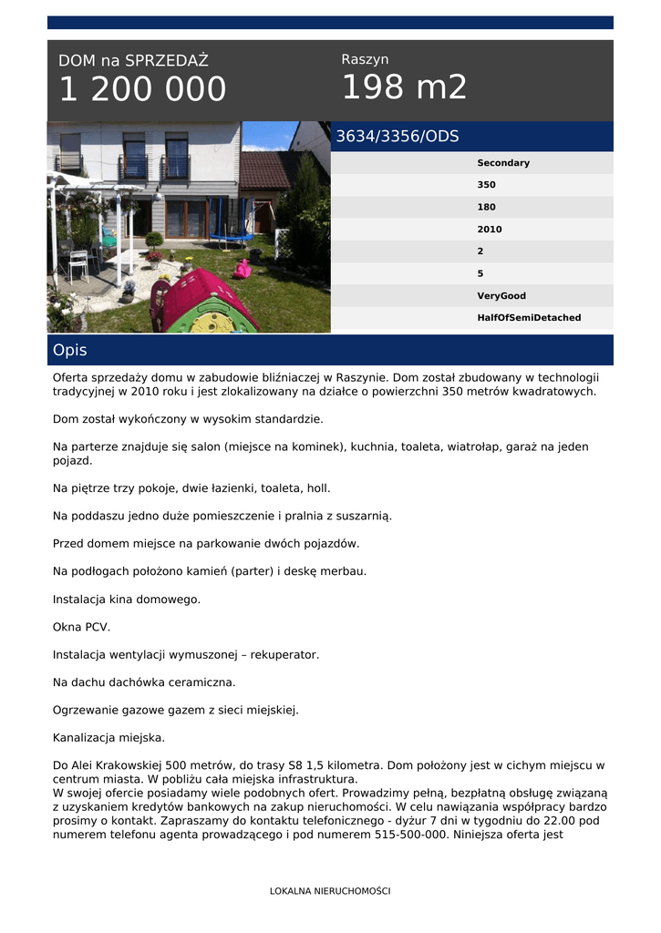 Raszyn DOM na SPRZEDAŻ 198 m2 1 200 000 3634/3356/ODS Secondary 350 180 2010 2 5 VeryGood HalfOfSemiDetached Opis Oferta sprzedaży domu w zabudowie bliźniaczej w Raszynie. Dom został zbudowany w technologii tradycyjnej w 2010 roku i jest zlokalizowany na działce o powierzchni 350 metrów kwadratowych. Dom został wykończony w wysokim standardzie. Na parterze znajduje się salon (miejsce na kominek), kuchnia, toaleta, wiatrołap, garaż na jeden pojazd. Na piętrze trzy pokoje, dwie łazienki, toaleta, holl. Na poddaszu jedno duże pomieszczenie i pralnia z suszarnią. Przed domem miejsce na parkowanie dwóch pojazdów. Na podłogach położono kamień (parter) i deskę merbau. Instalacja kina domowego. Okna PCV. Instalacja wentylacji wymuszonej – rekuperator. Na dachu dachówka ceramiczna. Ogrzewanie gazowe gazem z sieci miejskiej. Kanalizacja miejska. Do Alei Krakowskiej 500 metrów, do trasy S8 1,5 kilometra. Dom położony jest w cichym miejscu w centrum miasta. W pobliżu cała miejska infrastruktura. W swojej ofercie posiadamy wiele podobnych ofert. Prowadzimy pełną, bezpłatną obsługę związaną z uzyskaniem kredytów bankowych na zakup nieruchomości. W celu nawiązania współpracy bardzo prosimy o kontakt. Zapraszamy do kontaktu telefonicznego - dyżur 7 dni w tygodniu do 22.00 pod numerem telefonu agenta prowadzącego i pod numerem 515-500-000. Niniejsza oferta jest LOKALNA NIERUCHOMOŚCI informacją handlową i nie może być uznawana za ofertę w rozumieniu art. 66 ustęp 1 Kodeksu Cywilnego. Wojciech Raducha tel. 515-200-004 tel. 22 702 55 55 email: [email protected] LOKALNA NIERUCHOMOŚCI Powered by TCPDF (www.tcpdf.org)