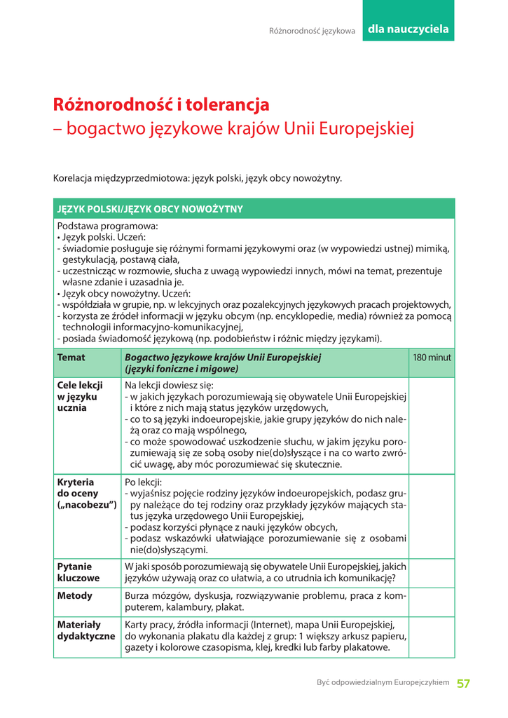 Różnorodność językowa dla nauczyciela Różnorodność i tolerancja – bogactwo językowe krajów Unii Europejskiej Korelacja międzyprzedmiotowa: język polski, język obcy nowożytny. JĘZYK POLSKI/JĘZYK OBCY NOWOŻYTNY Podstawa programowa: • Język polski. Uczeń: - świadomie posługuje się różnymi formami językowymi oraz (w wypowiedzi ustnej) mimiką, gestykulacją, postawą ciała, - uczestnicząc w rozmowie, słucha z uwagą wypowiedzi innych, mówi na temat, prezentuje własne zdanie i uzasadnia je. • Język obcy nowożytny. Uczeń: -w spółdziała w grupie, np. w lekcyjnych oraz pozalekcyjnych językowych pracach projektowych, - korzysta ze źródeł informacji w języku obcym (np. encyklopedie, media) również za pomocą technologii informacyjno-komunikacyjnej, - posiada świadomość językową (np. podobieństw i różnic między językami). Temat Bogactwo językowe krajów Unii Europejskiej (języki foniczne i migowe) Cele lekcji w języku ucznia Na lekcji dowiesz się: - w jakich językach porozumiewają się obywatele Unii Europejskiej i które z nich mają status języków urzędowych, - co to są języki indoeuropejskie, jakie grupy języków do nich należą oraz co mają wspólnego, - co może spowodować uszkodzenie słuchu, w jakim języku porozumiewają się ze sobą osoby nie( do)słyszące i na co warto zwrócić uwagę, aby móc porozumiewać się skutecznie. 180 minut Kryteria Po lekcji: do oceny - wyjaśnisz pojęcie rodziny języków indoeuropejskich, podasz gru(„nacobezu”) py należące do tej rodziny oraz przykłady języków mających status języka urzędowego Unii Europejskiej, - podasz korzyści płynące z nauki języków obcych, - podasz wskazówki ułatwiające porozumiewanie się z osobami nie(do)słyszącymi. Pytanie kluczowe W jaki sposób porozumiewają się obywatele Unii Europejskiej, jakich języków używają oraz co ułatwia, a co utrudnia ich komunikację? Metody Burza mózgów, dyskusja, rozwiązywanie problemu, praca z komputerem, kalambury, plakat. Materiały Karty pracy, źródła informacji (Internet), mapa Unii Europejskiej, dydaktyczne do wykonania plakatu dla każdej z grup: 1 większy arkusz papieru, gazety i kolorowe czasopisma, klej, kredki lub farby plakatowe. Być odpowiedzialnym Europejczykiem 57 dla nauczyciela Różnorodność językowa I lekcja – przebieg Część wstępna Czynności organizacyjne. Część nawiązująca 3 minuty Wprowadzenie do tematu: 12 minut Uczniowie w parach przypominają sobie nazwy znanych im języków obcych. Następnie całą klasą w oparciu o kartę pracy nr 1 (Języki Unii Europejskiej) sporządzają listę języków krajów należących do Unii Europejskiej. Nazwy zapisywane są na tablicy i jednocześnie wpisywane przez każdego z uczniów do tabeli na karcie pracy nr 1 – lewa strona tabeli. Następnie uczniowie sprawdzają, kto w klasie potrafi porozumiewać się w danym języku obcym – kto potrafi powiedzieć CZEŚĆ w tym języku. Nauczyciel w oparciu o materiał dodatkowy może podać jako ciekawostkę, jak brzmi TAK/NIE w wybranych językach. Rozdanie uczniom celów lekcji i kryteriów oceny (może być na ekranie). Część właściwa W 4-osobowych zespołach, w oparciu o mapę UE, uczniowie uzu- 15 minut pełniają prawą stronę tabeli na karcie pracy nr 1 (Języki Unii Euro pejskiej) nazwami krajów UE, w których dany język jest językiem urzędowym oraz próbują znaleźć odpowiedź na pytanie: Dlaczego w Unii Europejskiej jest aż tyle języków urzędowych i jaką pełnią one rolę – czemu służą, co ułatwiają (burza mózgów)? Uczniowie otrzymują kartę pracy nr 2 (Cześć – tak samo, a może 10 minut inaczej?) i analizują, jak w danym języku brzmi powitanie oraz gdzie brzmi ono podobnie. Na podstawie karty pracy numer 1 i 2 uczniowie wspólnie próbują znaleźć odpowiedz na pytanie: Mieszkańcom których krajów Unii Europejskiej i dlaczego najłatwiej jest się ze sobą porozumieć? (dyskusja); dodatkowo: Z mieszkańcami których krajów najłatwiej nam się porozumieć i dlaczego? Podsumo wanie Nauczyciel podsumowuje/ocenia pracę uczniów. II lekcja – przebieg Część wstępna Czynności organizacyjne. Część nawiązująca 5 minut 3 minuty Wprowadzenie do tematu: 10 minut Uczniowie w 4-osobowych zespołach, wykorzystując Internet, uzupełniają schemat rodziny języków na karcie pracy nr 3 (Rodzina języków europejskich), a następnie prezentują/porównują efekty swojej pracy. Rozdanie (przypomnienie) uczniom celów lekcji i kryteriów oceny (może być na ekranie). Część właściwa 58 Pracując w zespołach, uczniowie wyszukują w Internecie słowa, 10 minut które brzmią podobnie w danej grupie językowej (germańskiej, romańskiej, słowiańskiej) – w oparciu o materiał dodatkowy nauczyciel może podać uczniom informację o tym, jak w poszczególnych językach brzmi TAK/NIE. Można zastosować rywalizację zespołową – który zespół w ciągu 10 minut znajdzie najwięcej takich słów. Być odpowiedzialnym Europejczykiem Różnorodność językowa dla nauczyciela Część właściwa Pracując w zespołach uczniowie na bazie karty pracy nr 3 (Rodzina 15 minut języków europejskich) i zaprezentowanych tam rodzajów alfabetu (uwaga: wymagane jest tu wprowadzenie nauczyciela), tworzą swój własny „zespołowy” alfabet. Następnie każdy zespół dzieli się na dwie grupy i wykorzystuje stworzony alfabet, aby wysłać do siebie nawzajem zakodowaną wiadomość. Grupy rozszyfrowują otrzymane wiadomości. Podsumo wanie Ocena koleżeńska (m.in. stworzonych alfabetów) + informacja 5 minut zwrotna od nauczyciela. Zadanie domowe: wybierz dwa języki, których chciał(a)byś się nauczyć i uzupełnij kartę pracy nr 4 (Będę poliglotą…). III lekcja – przebieg Część wstępna Czynności organizacyjne 7 minut (w tym krótkie omówienie zadania domowego – uczniowie informują wybranego kolegę/koleżank