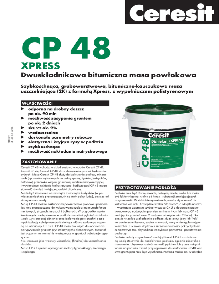 CP 48 XPRESS Dwuskładnikowa bitumiczna masa powłokowa CERESIT CP_48_KT_02.16 Szybkoschnąca, grubowarstwowa, bitumiczno-kauczukowa masa uszczelniająca (2K) z formułą Xpress, z wypełniaczem polistyrenowym WŁAŚCIWOŚCI odporna na drobny deszcz po ok. 90 min możliwość zasypania gruntem po ok. 2 dniach skurcz ok. 9% wodoszczelna doskonałe parametry robocze elastyczna i kryjąca rysy w podłożu szybkoschnąca możliwość nakładania natryskowego ZASTOSOWANIE Ceresit CP 48 wchodzi w skład zestawu wyrobów Ceresit CP 41, Ceresit CP 44, Ceresit CP 48 do wykonywania powłok hydroizolacyjnych. Masa Ceresit CP 48 służy do izolowania podłoży mineralnych (np. murów wykonanych na pełną spoinę, tynków, jastrychów, betonów) przeciwko wilgoci gruntowej, wodzie niewywierającej i wywierającej ciśnienie hydrostatyczne. Podłoże pod CP 48 mogą stanowić również istniejące powłoki bitumiczne. Może być stosowana na zewnątrz i wewnątrz budynków (w pomieszczeniach nie przeznaczonych na stały pobyt ludzi), zawsze od strony naporu wody. Masę CP 48 można nakładać na powierzchnie pionowe i poziome. Jest ona przeznaczona do wykonywania izolacji na murach fundamentowych, stropach, tarasach i balkonach. W przypadku murów kamiennych, występowania w podłożu szczelin i pęknięć, działania wody wywierającej ciśnienie oraz izolowania powierzchni poziomych izolację należy wzmocnić siatką z włókna szklanego odporną na alkalia np. CT 325. CP 48 może być użyta do mocowania obsypywanych gruntem płyt izolacyjnych i drenażowych. Materiał jest odporny na normalnie występujące w gruntach substancje agresywne. Nie stosować jako warstwy wierzchniej (finalnej) do uszczelniania dachów. Masa CP 48 spełnia wymagania izolacji typu lekkiego, średniego i ciężkiego. PRZYGOTOWANIE PODŁOŻA Podłoże musi być równe, zwarte, nośnych, czyste, suche lub może być lekko wilgotne, wolne od kurzu i substancji zmniejszających przyczepność. W niskich temperaturach, należy się upewnić, że jest wolne od lodu. Krawędzie trzeba "sfazować", a wklęsłe naroża – wyokrąglić zaprawą szybko wiążącą CX 5 z dodatkiem piasku kwarcowego nadając im promień minimum 4 cm lub masą CP 48 nadając im promień max. 2 cm (czas schnięcia min. 90 min). Naprawić wszelkie uszkodzenia podłoża, duże pory, jamy lub "raki" na powierzchni betonu, spoiny w murach, mury o nieregularnej powierzchni, z licznymi ubytkami i szczelinami należy pokryć tynkiem cementowym tak, aby uniknąć zamykania powietrza i powstawania pęcherzy. Podłoże należy zagruntować emulsją Ceresit CP 41 rozcieńczoną wodą stosownie do nasiąkliwości podłoża, zgodnie z instrukcją stosowania. Uzyskany roztwór nanosić pędzlem lub przez natryskiwanie na podłoże. Przed przystąpieniem do nakładania CP 48 warstwa gruntująca musi być wyschnięta. Podłoża mokre, np. w obrębie WYKONANIE CP 48 należy nakładać metalową pacą lub poprzez natryskiwanie. Do wymieszania składników należy użyć wolnoobrotowej wiertarki z mieszadłem kotwicowym. Najpierw trzeba wymieszać składnik A (płynny), następnie wsypywać do niego składnik B (w postaci proszku) i mieszać ok. 2 minuty, aż do uzyskania jednorodnej masy bez grudek. Gotową masę równomiernie nakładać na podłoże za pomocą pacy lub agregatu natryskowego tak, aby uzyskać warstwą o odpowiedniej grubości (patrz tabela). Podczas aplikacji należy cały czas kontrolować grubość nakładanej warstwy izolacji. W przypadku izolowania podłoża przeciwko wilgoci gruntowej oraz wodzie nie akumulującej się CP 48 należy nakładać w dwóch warstwach mokre na mokre. Grubość świeżej warstwy powinna wynosić co najmniej 2,5 mm. W przypadku izolowania podłoża przeciwko wodzie nie wywołującej ciśnienia CP 48 należy nakładać w dwóch warstwach. Drugą warstwę można aplikować, gdy pierwsza jest już dostatecznie przeschnięta tak, aby jej nie uszkodzić. Grubość świeżej warstwy powinna wynosić co najmniej 3,0 mm. W przypadku izolowania podłoża przeciwko wodzie wywierającej ciśnienie zaleca się nakładanie materiału w co najmniej dwóch warstwach tak, aby grubość świeżej warstwy wynosiła łącznie co najmniej 4,0 mm. W świeżą pierwszą warstwę należy wkleić siatką z włókna szklanego. Drugą warstwę można aplikować gdy pierwsza jest już dostatecznie przeschnięta tak, aby jej nie uszkodzić. Przy przerwaniu prac grubość warstwy zredukować do zera, ponawiając prace zastosować zakład na poprzednią warstwę. Prac nie wolno przerywać na narożnikach i brzegach budynków. Szczeliny dylatacyjne zaleca się izolować dodatkowo stosując pasy membrany samoprzylepnej Ceresit BT 21. W przypadku murów kamiennych, występowania licznych rys lub możliwości pojawienia się pęknięć oraz przy izolowaniu przeciwko wodzie wywołującej ciśnienie i izolowaniu powierzchni poziomych – CP 48 nakładać dwiema warstwami, umieszczając w pierwszej warstwie siatkę z włókna szklanego (z zachowaniem zakładów ok. 10 cm). CP 48 należy zużyć w ciągu ok. 60 min. Izolacja jest odporna na deszcz po ok. 90 min. Całkowite wyschnięcie materiału następuje po ok. 2 dniach, w zależności od temperatury i wilgotności względnej powietrza. Na wyschniętej warstwie izolacji można punktowo naklejać płyty drenażowe używając gotowej masy CP 48. Narzędzia i świeże zabrudzenia myć wodą. Stwardniały materiał można usunąć za pomocą rozpuszczalnika np. benzyny ekstrakcyjnej. UWAGA Prace należy wykonywać w suchych warunkach, przy temperaturze powietrza i podłoża od +5°C do +25°C (jednak nie na silnie nasłonecznionych powierzchniach) oraz przy względnej wilgotności powietrza poniżej 80%. Aby ochronić zaizolowane powierzchnie przed uszkodzeniami, np. w czasie zasypywania wykopu i osiadania gruntu, trzeba zastosować odpowiednie płyty drenujące lub podobne osłony. Osłony te należy tak za