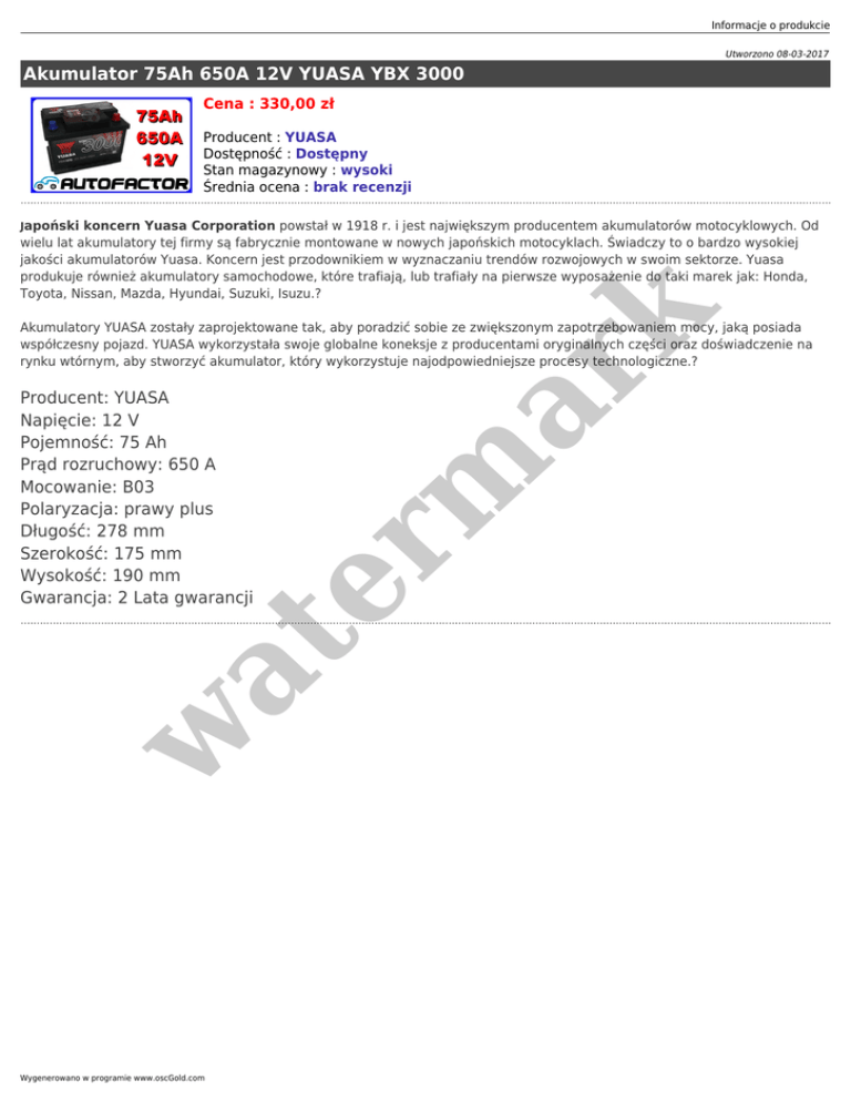 Informacje o produkcie Utworzono 08-03-2017 Akumulator 75Ah 650A 12V YUASA YBX 3000 Cena : 330,00 zł Producent : YUASA Dostępność : Dostępny Stan magazynowy : wysoki Średnia ocena : brak recenzji Japoński koncern Yuasa Corporation powstał w 1918 r. i jest największym producentem akumulatorów motocyklowych. Od er m ar k wielu lat akumulatory tej firmy są fabrycznie montowane w nowych japońskich motocyklach. Świadczy to o bardzo wysokiej jakości akumulatorów Yuasa. Koncern jest przodownikiem w wyznaczaniu trendów rozwojowych w swoim sektorze. Yuasa produkuje również akumulatory samochodowe, które trafiają, lub trafiały na pierwsze wyposażenie do taki marek jak: Honda, Toyota, Nissan, Mazda, Hyundai, Suzuki, Isuzu.? Akumulatory YUASA zostały zaprojektowane tak, aby poradzić sobie ze zwiększonym zapotrzebowaniem mocy, jaką posiada współczesny pojazd. YUASA wykorzystała swoje globalne koneksje z producentami oryginalnych części oraz doświadczenie na rynku wtórnym, aby stworzyć akumulator, który wykorzystuje najodpowiedniejsze procesy technologiczne.? w at Producent: YUASA Napięcie: 12 V Pojemność: 75 Ah Prąd rozruchowy: 650 A Mocowanie: B03 Polaryzacja: prawy plus Długość: 278 mm Szerokość: 175 mm Wysokość: 190 mm Gwarancja: 2 Lata gwarancji Wygenerowano w programie www.oscGold.com