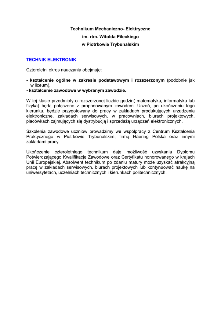 Technikum Mechaniczno- Elektryczne im. rtm. Witolda Pileckiego w Piotrkowie Trybunalskim TECHNIK ELEKTRONIK Czteroletni okres nauczania obejmuje: - kształcenie ogólne w zakresie podstawowym i rozszerzonym (podobnie jak w liceum), - kształcenie zawodowe w wybranym zawodzie. W tej klasie przedmioty o rozszerzonej liczbie godzin( matematyka, informatyka lub fizyka) będą połączone z proponowanym zawodem. Uczeń, po ukończeniu tego kierunku, będzie przygotowany do pracy w zakładach produkujących urządzenia elektroniczne, zakładach serwisowych, w pracowniach, biurach projektowych, placówkach zajmujących się dystrybucją i sprzedażą urządzeń elektronicznych. Szkolenia zawodowe uczniów prowadzimy we współpracy z Centrum Kształcenia Praktycznego w Piotrkowie Trybunalskim, firmą Haering Polska oraz innymi zakładami pracy. Ukończenie czteroletniego technikum daje możliwość uzyskania Dyplomu Potwierdzającego Kwalifikacje Zawodowe oraz Certyfikatu honorowanego w krajach Unii Europejskiej. Absolwent technikum po zdaniu matury może uzyskać atrakcyjną pracę w zakładach serwisowych, biurach projektowych lub kontynuować naukę na uniwersytetach, uczelniach technicznych i kierunkach politechnicznych.