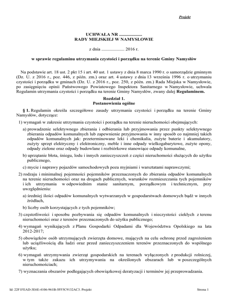 Projekt UCHWAŁA NR .................... RADY MIEJSKIEJ W NAMYSŁOWIE z dnia .................... 2016 r. w sprawie regulaminu utrzymania czystości i porządku na terenie Gminy Namysłów Na podstawie art. 18 ust. 2 pkt 15 i art. 40 ust. 1 ustawy z dnia 8 marca 1990 r. o samorządzie gminnym (Dz. U. z 2016 r., poz. 446, z późn. zm.) oraz art. 4 ustawy z dnia 13 września 1996 r. o utrzymaniu czystości i porządku w gminach (Dz. U. z 2016 r., poz. 250, z późn. zm.) Rada Miejska w Namysłowie, po zasięgnięciu opinii Państwowego Powiatowego Inspektora Sanitarnego w Namysłowie, uchwala Regulamin utrzymania czystości i porządku na terenie Gminy Namysłów, zwany dalej Regulaminem. Rozdział 1. Postanowienia ogólne § 1. Regulamin określa szczegółowe zasady utrzymania czystości i porządku na terenie Gminy Namysłów, dotyczące: 1) wymagań w zakresie utrzymania czystości i porządku na terenie nieruchomości obejmujących: a) prowadzenie selektywnego zbierania i odbierania lub przyjmowania przez punkty selektywnego zbierania odpadów komunalnych lub zapewnienie przyjmowania w inny sposób co najmniej takich odpadów komunalnych jak: przeterminowane leki i chemikalia, zużyte baterie i akumulatory, zużyty sprzęt elektryczny i elektroniczny, meble i inne odpady wielkogabarytowe, zużyte opony, odpady zielone oraz odpady budowlane i rozbiórkowe stanowiące odpady komunalne, b) uprzątanie błota, śniegu, lodu i innych zanieczyszczeń z części nieruchomości służących do użytku publicznego, c) mycie i naprawy pojazdów samochodowych poza myjniami i warsztatami naprawczymi; 2) rodzaju i minimalnej pojemności pojemników przeznaczonych do zbierania odpadów komunalnych na terenie nieruchomości oraz na drogach publicznych, warunków rozmieszczania tych pojemników i ich utrzymania w odpowiednim stanie sanitarnym, porządkowym i technicznym, przy uwzględnieniu: a) średniej ilości odpadów komunalnych wytwarzanych w gospodarstwach domowych bądź w innych źródłach, b) liczby osób korzystających z tych pojemników; 3) częstotliwości i sposobu pozbywania się odpadów komunalnych i nieczystości ciekłych z terenu nieruchomości oraz z terenów przeznaczonych do użytku publicznego; 4) wymagań wynikających z Planu Gospodarki Odpadami dla Województwa Opolskiego na lata 2012-2017; 5) obowiązków osób utrzymujących zwierzęta domowe, mających na celu ochronę przed zagrożeniem lub uciążliwością dla ludzi oraz przed zanieczyszczeniem terenów przeznaczonych do wspólnego użytku; 6) wymagań utrzymywania zwierząt gospodarskich na terenach wyłączonych z produkcji rolniczej, w tym także zakazu ich utrzymywania na określonych obszarach lub w poszczególnych nieruchomościach; 7) wyznaczania obszarów podlegających obowiązkowej deratyzacji i terminów jej przeprowadzania. Id: 22F1FEAD-3E6E-4106-961B-5FF5C9132AC3. Projekt Strona 1 § 2. Ilekroć w regulaminie jest mowa o: 1) budynkach mieszkalnych jednorodzinnych - należy przez to rozumieć budynek wolno stojący albo budynek w zabudowie bliźniaczej, szeregowej lub grupowej, służący zaspokajaniu potrzeb mieszkaniowych, stanowiący konstrukcyjnie samodzielną całość, w którym dopuszcza się wydzielenie nie więcej niż dwóch lokali mieszkalnych albo jednego lokalu mieszkalnego i lokalu użytkowego o powierzchni całkowitej nieprzekraczającej 30% powierzchni całkowitej budynku; 2) budynkach wielorodzinnych - rozumie się przez to budynek mieszkalny, który zawiera więcej niż dwa lokale mieszkalne; 3) harmonogramie - rozumie się przez to harmonogram odbioru odpadów komunalnych, opracowany przez podmiot uprawniony; 4) nieruchomości niezamieszkałej - rozumie się przez to nieruchomości, których nie zasiedlają mieszkańcy, a w których powstają odpady komunalne, czyli nieruchomości służące przede wszystkim innej działalności niż mieszkalna, a więc działalności użytkowej (gospodarczej, społecznej lub publicznej); 5) odpadach budowlanych i rozbiórkowych - rozumie się przez to odpady z remontów w postaci gruzu betonowego i ceglanego oraz materiałów ceramicznych, niezawierające substancji niebezpiecznych; 6) odpadach wielkogabarytowych - rozumie się przez to odpady komunalne, które ze względu na swoje rozmiary lub masę nie mogą być umieszczone w typowych pojemnikach przeznaczonych do zbierania odpadów komunalnych; 7) podmiocie uprawnionym - rozumie się przez to wykonawcę świadczącego usługi w ramach zorganizowanego systemu odbierania odpadów. Rozdział 2. Wymagania w zakresie utrzymania czystości i porządku na terenie nieruchomości § 3. Właściciele nieruchomości zapewniają utrzymanie czystości i porządku na terenie nieruchomości poprzez: 1) selektywne zbieranie wytwarzanych na terenie nieruchomości odpadów komunalnych, w zakresie obejmującym: a) papier, b) metale, c) tworzywa sztuczne, d) szkło, e) opakowania wielomateriałowe, f) odpady ulegające biodegradacji, w tym odpady opakowaniowe ulegające biodegradacji i odpady zielone, g) przeterminowane leki i chemikalia, h) zużyte baterie i akumulatory, i) zużyty sprzęt elektryczny i elektroniczny, j) meble i inne odpady wielkogabarytowe, k) odpady budowlane i rozbiórkowe, l) zużyte opony; 2) przekazywanie podmiotowi uprawnionemu selektywnie zebranych odpadów, wymienionych w pkt. 1 lit. a-f i lit. j, oraz dostarczanie selektywnie zebranych odpadów Id: 22F1FEAD-3E6E-4106-961B-5FF5C9132AC3. Projekt Strona 2 komunalnych, wymienionych w pkt. 1 lit. g, h, i, koraz l, do gminnego punktu selektywnego zbierania odpadów komunalnych; 3) zbieranie niesegregowanych (zmieszanych) odpadów komunalnych i przekazywanie ich podmiotowi uprawnionemu; 4) usuwanie śniegu z dachów, lodu (sopli) z okapów, rynien i innych części nieruchomości służących do użytku publicznego; 5) utrzymywanie pojemników służących do zbierania odpadów komunalnych w odpowiednim stanie sanitarnym, porządkowym i techniczn