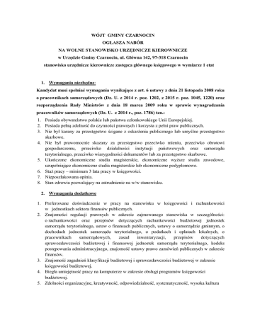 WÓJT GMINY CZARNOCIN OGŁASZA NABÓR NA WOLNE STANOWISKO URZĘDNICZE KIEROWNICZE w Urzędzie Gminy Czarnocin, ul. Główna 142, 97-318 Czarnocin stanowisko urzędnicze kierownicze zastępca głównego księgowego w wymiarze 1 etat 1. Wymagania niezbędne: Kandydat musi spełniać wymagania wynikające z art. 6 ustawy z dnia 21 listopada 2008 roku o pracownikach samorządowych (Dz. U. z 2014 r. poz. 1202, z 2015 r. poz. 1045, 1220) oraz rozporządzenia Rady Ministrów z dnia 18 marca 2009 roku w sprawie wynagradzania pracowników samorządowych (Dz. U. z 2014 r., poz. 1786) tzn.: 1. Posiada obywatelstwo polskie lub państwa członkowskiego Unii Europejskiej. 2. Posiada pełną zdolność do czynności prawnych i korzysta z pełni praw publicznych. 3. Nie był karany za przestępstwo ścigane z oskarżenia publicznego lub umyślne przestępstwo skarbowe. 4. Nie był prawomocnie skazany za przestępstwo przeciwko mieniu, przeciwko obrotowi gospodarczemu, przeciwko działalności instytucji państwowych oraz samorządu terytorialnego, przeciwko wiarygodności dokumentów lub za przestępstwo skarbowe. 5. Ukończone ekonomiczne studia magisterskie, ekonomiczne wyższe studia zawodowe, uzupełniające ekonomiczne studia magisterskie lub ekonomiczne podyplomowe. 6. Staż pracy – minimum 3 lata pracy w księgowości. 7. Nieposzlakowana opinia. 8. Stan zdrowia pozwalający na zatrudnienie na w/w stanowisku. 2. Wymagania dodatkowe 1. Preferowane doświadczenie w pracy na stanowisku w księgowości i rachunkowości w jednostkach sektora finansów publicznych. 2. Znajomości regulacji prawnych w zakresie zajmowanego stanowiska w szczególności: o rachunkowości oraz przepisów dotyczących rachunkowości budżetowej jednostek samorządu terytorialnego, ustaw o finansach publicznych, ustawy o samorządzie gminnym, o dochodach jednostek samorządu terytorialnego, o podatkach i opłatach lokalnych, o pracownikach samorządowych, zasad inwentaryzacji, przepisów dotyczących sprawozdawczości budżetowej i finansowej jednostek samorządu terytorialnego, kodeks postępowania administracyjnego, znajomość ustawy prawo zamówień publicznych w zakresie finansów. 3. Znajomość zagadnień klasyfikacji budżetowej i sprawozdawczości budżetowej w zakresie księgowości budżetowej. 4. Biegła umiejętność pracy na komputerze w zakresie obsługi programów księgowości budżetowej. 5. Zdolności organizacyjne, kreatywność, odpowiedzialność, systematyczność, wysoka kultura osobista, dyspozycyjność, samodzielność w działaniu, umiejętność pracy w zespole, odporność na stres, umiejętność samodzielnego podejmowania decyzji, umiejętność prowadzenie negocjacji, umiejętność analitycznego myślenia, rzetelność, zdyscyplinowanie, sumienność, umiejętność precyzyjnego przekazywania informacji. 6. Pracownik samorządowy zatrudniony na powyższym stanowisku nie może wykonywać dodatkowych zajęć pozostających w sprzeczności lub związanych z zajęciami, które wykonuje w ramach obowiązków służbowych, wywołujących uzasadnione podejrzenie o stronniczość lub interesowność. 3. Zakres wykonywanych zadań na stanowisku: Zadania głównego księgowego jednostki sektora finansów publicznych określa art. 54 ust 1 ustawy z dnia 27 sierpnia 2009 roku o finansach publicznych (tj. Dz. U. z 2013r. poz. 885 ze zm.) Zastępca Głównego Księgowego, wykonuje zadania określone przez Wójta Gminy, według właściwości – z uwzględnieniem przepisów szczególnych, dotyczących praw i obowiązków głównych księgowych budżetu, a w szczególności: 1. Księgowością (księgowanie wydatków i dochodów) Gminy i Urzędu rzetelnie, na bieżąco i terminowo oraz zgodnie z wymogami przepisów o rachunkowości, 2. Dokonywanie wstępnej kontroli kompletności i rzetelności dokumentów dotyczących operacji gospodarczych i finansowych oraz ich zgodności z planem finansowym, 3. Nadzór i rozliczenie podatku VAT naliczonego i należnego, 4. Udział w sporządzeniu sprawozdawczości budżetowo-fianansowej, 5. Udział w kontroli finansowej w Urzędzie oraz kontroli finansowej w jednostkach organizacyjnych Gminy, 6. Prowadzenie wyodrębnionej ewidencji wydatków bieżących ze środków pochodzących z budżetu UE oraz innych dotacji podlegających rozliczeniu, 7. Sprawdzanie pod względem formalno – rachunkowym oraz dekretacja dokumentów księgowych w zakresie zadań budżetowych realizowanych przez Urząd, 8. Przestrzeganie dyscypliny finansów publicznych z zakresu wykonywanych czynności, 9. Nanoszenie planów wydatków oraz ich zmian zgodnie z Uchwałami Rady Gminy oraz Zarządzeniami Wójta, 10. Przygotowanie danych do opracowania okresowych sprawozdań opisowych i analiz z wykonania wydatków budżetu gminy, 11. Kontrola formalno – rachunkowa sprawozdań jednostek organizacyjnych Gminy, 12. Zastępstwo Skarbnika Gminy podczas jego nieobecności, 13. Załatwianie innych spraw służbowych doraźnie zleconych przez bezpośredniego przełożonego. 4. Wymagane dokumenty: List motywacyjny z własnoręcznym podpisem; Curriculum vitae (CV) z własnoręcznym podpisem; Kserokopia dokumentów potwierdzających wykształcenie; Kserokopia dokumentów potwierdzających doświadczenie zawodowe i staż pracy; Kserokopia dokumentów potwierdzających posiadanie innych umiejętności (zaświadczeń o ukończonych kursach, szkoleniach); 6. Oświadczenie kandydata o korzystaniu z pełni praw publicznych; 7. Oświadczenie kandydata o niekaralności za przestępstwo popełnione umyślnie; 8. Kwestionariusz osobowy dla osoby ubiegającej się o zatrudnienie. Wymagane dokumenty aplikacyjne należy składać do dnia 23 maja 2016 r. do godziny 10:00, w przypadku wysyłki elektronicznej lub za pośrednictwem poczty decyduje data faktycznego wpływu do urzędu. 1. 2. 3. 4. 5. 5. W miesiącu poprzedzającym datę upublicznienia ogłoszenia wskaźnik zatrudnienia osób niepełnosprawnych w Urzędzie Gminy
