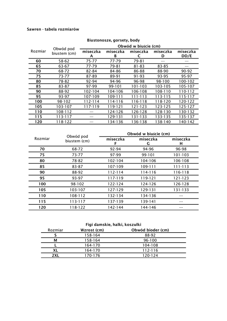 Sawren - tabela rozmiarów Biustonosze, gorsety, body Rozmiar