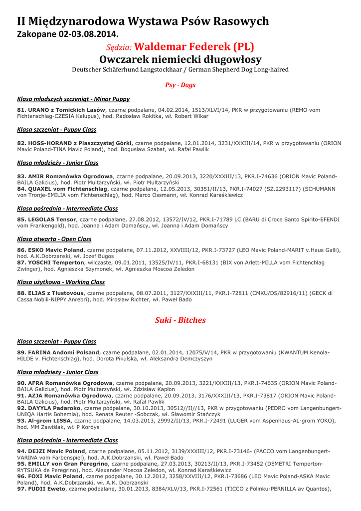 II Międzynarodowa Wystawa Psów Rasowych Zakopane 02-03.08.2014. Sędzia: Waldemar Federek (PL) Owczarek niemiecki długowłosy Deutscher Schäferhund Langstockhaar / German Shepherd Dog Long-haired Psy - Dogs Klasa młodszych szczeniąt - Minor Puppy 81. URANO z Tomickich Lasów, czarne podpalane, 04.02.2014, 1513/XLVI/14, PKR w przygotowaniu (REMO vom Fichtenschlag-CZESIA Kalupus), hod. Radosław Rokitka, wł. Robert Wikar Klasa szczeniąt - Puppy Class 82. HOSS-HORAND z Piaszczystej Górki, czarne podpalane, 12.01.2014, 3231/XXXIII/14, PKR w przygotowaniu (ORION Mavic Poland-TINA Mavic Poland), hod. Bogusław Szabat, wł. Rafał Pawlik Klasa młodzieży - Junior Class 83. AMIR Romanówka Ogrodowa, czarne podpalane, 20.09.2013, 3220/XXXIII/13, PKR.I-74636 (ORION Mavic PolandBAILA Galicius), hod. Piotr Multarzyński, wł. Piotr Multarzyński 84. QUAXEL vom Fichtenschlag, czarne podpalane, 12.05.2013, 30351/II/13, PKR.I-74027 (SZ.2293117) (SCHUMANN von Tronje-EMILIA vom Fichtenschlag), hod. Marco Ossmann, wł. Konrad Karaśkiewicz Klasa pośrednia - Intermediate Class 85. LEGOLAS Tensor, czarne podpalane, 27.08.2012, 13572/IV/12, PKR.I-71789 LC (BARU di Croce Santo Spirito-EFENDI vom Frankengold), hod. Joanna i Adam Domańscy, wł. Joanna i Adam Domańscy Klasa otwarta - Open Class 86. ESKO Mavic Poland, czarne podpalane, 07.11.2012, XXVIIII/12, PKR.I-73727 (LEO Mavic Poland-MARIT v.Haus Galli), hod. A.K.Dobrzanski, wł. Jozef Bugos 87. YOSCHI Temperton, wilczaste, 09.01.2011, 13525/IV/11, PKR.I-68131 (BIX von Arlett-MILLA vom Fichtenchlag Zwinger), hod. Agnieszka Szymonek, wł. Agnieszka Moscoa Zeledon Klasa użytkowa - Working Class 88. ELIAS z Tlustovous, czarne podpalane, 08.07.2011, 3127/XXXIII/11, PKR.I-72811 (CMKU/DS/82916/11) (GECK di Cassa Nobili-NIPPY Anrebri), hod. Mirosław Richter, wł. Paweł Bado Suki - Bitches Klasa szczeniąt - Puppy Class 89. FARINA Andomi Polsand, czarne podpalane, 02.01.2014, 12075/V/14, PKR w przygotowaniu (KWANTUM KenolaHILDE v. Fichtenschlag), hod. Dorota Pikulska, wł. Aleksandra Demczyszyn Klasa młodzieży - Junior Class 90. AFRA Romanówka Ogrodowa, czarne podpalane, 20.09.2013, 3221/XXXIII/13, PKR.I-74635 (ORION Mavic PolandBAILA Galicius), hod. Piotr Multarzyński, wł. Zdzisław Kapłon 91. AZJA Romanówka Ogrodowa, czarne podpalane, 20.09.2013, 3176/XXXIII/13, PKR.I-73817 (ORION Mavic PolandBAILA Galicius), hod. Piotr Multarzyński, wł. Rafał Pawlik 92. DAYYLA Padaroko, czarne podpalane, 30.10.2013, 30512//II//13, PKR w przygotowaniu (PEDRO vom LangenbungertUNIQA Hartis Bohemia), hod. Renata Reuter -Sobczak, wł. Sławomir Stańczyk 93. Al-grom LISSA, czarne podpalane, 14.03.2013, 29992/II/13, PKR.I-72491 (LUGER vom Aspenhaus-AL-grom YOKO), hod. MM Zawiślak, wł. P Kordys Klasa pośrednia - Intermediate Class 94. DEJZI Mavic Poland, czarne podpalane, 05.11.2012, 3139/XXXIII/12, PKR.I-73146- (PACCO vom LangenbungertVARINA vom Farbenspiel), hod. A.K.Dobrzanski, wł. Paweł Bado 95. EMILLY von Gran Peregrino, czarne podpalane, 27.03.2013, 30213/II/13, PKR.I-73452 (DEMETRI TempertonRYTSUKA de Peregrino), hod. Alexander Moscoa Zeledon, wł. Konrad Karaśkiewicz 96. FOXI Mavic Poland, czarne podpalane, 30.12.2012, 3258/XXVIII/12, PKR.I-73686 (LEO Mavic Poland-ASKA Mavic Poland), hod. A.K.Dobrzanski, wł. A.K. Dobrzanski 97. FUDII Eweto, czarne podpalane, 30.01.2013, 8384/XLV/13, PKR.I-72561 (TICCO z Folinku-PERNILLA av Quantos), hod. x, wł. Janusz Długosz 98. GARRI Wilki Goszcza, czarne podpalane, 24.03.2013, 30169/II/13, PKR.I-73309 (ORION Mavic Poland-PIA vom Hexenmeister), hod. Marcin Zębala, wł. Maciej Róg Klasa otwarta - Open Class 99. KALIBRA Padaroko, czarne podpalane, 25.05.2012, 29656//II/12, PKR.I-71075 (CAK Hartis Bohemia-ELSE vom Fichtenschlag), hod. Renata Reuter -Sobczak, wł. Sławomir Stańczyk 100. TINA Irwit, czarne podpalane, 20.10.2012, 11889/V/12, PKR.I-73428 (WISUM Mavic Poland-EMI Adi), hod. Witold Serafin, wł. Grzegorz Góra 101. WINA Thunder-Poland, czarne podpalane, 01.03.2012, 11538/V/12, PKR.I-70580 (FURBA vd Kleinen Ranch-l, JOVI Thunder Poland), hod. Tomasz Pazdan, wł. Tomasz Pazdan 102. XARA Mavic Poland, czarne podpalane, 10.07.2012, 3040/XXXIII/12, PKR.I-71069 (ORION Mavic Poland-SZAKIMA Mavic Poland), hod. Adrian Dobrzański, wł. Małgorzata Łaczek-Wójtowicz Sędzia: Waldemar Federek (PL) Owczarek niemiecki krótkowłosy Deutscher Schäferhund Stockhaar / German Shepherd Dog Short-haired Psy – Dogs Klasa szczeniąt - Puppy Class 1421. ONDO vom Huhnegrab, czarne podpalane, 06.11.2013, ZB-Nr.: VDH/SZ 22990 (YANKEE vom Feuermelder-IRINA vom Huhnegrab), hod. Heinz Scheerer, wł. Bernard Famuła Klasa młodzieży - Junior Class 103. HUNTER von Gran Peregrino, czarne podpalane, 26.09.2013, 30490/II/13, PKR.I-74741 (LUGER vom AspenhausMILLA vom Fichtenschlag-Zwinger), hod. Alexander Moscoa Zeledon, wł. Anetta Szczerbic 104. Al-grom LABBO, czarne podpalane, 14.03.2013, 89115/I/13, PKR.I-72977 (LUGER vom Aspenhaus-Al-grom YOKO), hod. M&M Zawiślak, wł. M&M Zawiślak, Izabela Beszlag 105. TYSON z Tomickich Lasów, czarne podpalane, 17.04.2013, 11881/V/13, PKR.I-73350 (SCHUMANN von TronjeTOOTSIE Tensor), hod. Radosław Rokitka, wł. Radosław Rokitka 1422. FINO von der Piste Trophe, czarne podpalane, 09.10.2013, SZ-Nr. 2298034 (YANKEE vom Feuermelder-HILARY von der Piste Trophe), hod. Bosl Erich, wł. Erich Bosl Klasa pośrednia - Intermediate Class 106. EMIR Mavic Poland, czarne podpalane, 07.11.2012, 3212/XXXIII/12, PKR.I-74456 (LEO Mavic Poland-MARIT v.Haus Galli), hod. A.K.Dobrzanski, wł. K. Dobrzański Klasa otwarta - Open Class 107. AZIR Jarkowski dwór, czarne podpalane, 12.09.2011, 29418/II/11, PKR.I-69833 (URBO vom Laithawald-ZENA von der Sandsteinkuste), hod. Jarosław Opozda, wł. Dorota Niemiec 108. BECKHAM von Gran Peregrino, wilczaste, 18.05.2012, 29834/II/12, PKR.I-71933 (NINO von Tronje-MILLA vom Fichtenschlag-Zwinger), hod. Alexander Moscoa Zeledon, wł. Anetta Szczerbic Suki - Bitches Kl