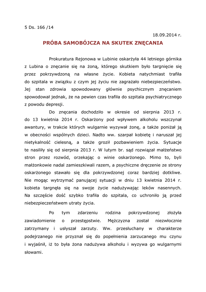5 Ds. 166 /14 18.09.2014 r. PRÓBA SAMOBÓJCZA NA SKUTEK ZNĘCANIA Prokuratura Rejonowa w Lubinie oskarżyła 44 letniego górnika z Lubina o znęcanie się na żoną, którego skutkiem było targnięcie się przez pokrzywdzoną na własne życie. Kobieta natychmiast trafiła do szpitala w związku z czym jej życiu nie zagrażało niebezpieczeństwo. Jej stan zdrowia spowodowany głównie psychicznym znęcaniem spowodował jednak, że na pewien czas trafiła do szpitala psychiatrycznego z powodu depresji. Do znęcania dochodziło w okresie od sierpnia 2013 r. do 13 kwietnia 2014 r. Oskarżony pod wpływem alkoholu wszczynał awantury, w trakcie których wulgarnie wyzywał żonę, a także poniżał ją w obecności wspólnych dzieci. Nadto ww. szarpał kobietę i naruszał jej nietykalność cielesną, a także groził pozbawieniem życia. Sytuacje te nasiliły się od sierpnia 2013 r. W lutym br. sąd rozwiązał małżeństwo stron przez rozwód, orzekając o winie oskarżonego. Mimo to, byli małżonkowie nadal zamieszkiwali razem, a psychiczne dręczenie ze strony oskarżonego stawało się dla pokrzywdzonej coraz bardziej dotkliwe. Nie mogąc wytrzymać panującej sytuacji w dniu 13 kwietnia 2014 r. kobieta targnęła się na swoje życie nadużywając leków nasennych. Na szczęście dość szybko trafiła do szpitala, co uchroniło ją przed niebezpieczeństwem utraty życia. Po zawiadomienie zatrzymany i tym o zdarzeniu przestępstwie. usłyszał zarzuty. rodzina pokrzywdzonej Mężczyzna Ww. został przesłuchany złożyła niezwłocznie w charakterze podejrzanego nie przyznał się do popełnienia zarzucanego mu czynu i wyjaśnił, iż to była żona nadużywa alkoholu i wyzywa go wulgarnymi słowami. 2 Prokurator zastosował wobec mężczyzny wolnościowe środki zapobiegawcze w postaci dozoru policji oraz przede wszystkim nakazu opuszczenia lokalu zajmowanego wspólnie z pokrzywdzoną, a także zakazu zbliżania się do niej i kontaktowania. Z uzyskanej w śledztwie opinii biegłego psychologa wynika, że reakcje i zachowanie pokrzywdzonej w czasie przesłuchania świadczą o tym, że przyczyną podjętej próby samobójczej było psychiczne i fizyczne znęcanie ze strony męża. U kobiety dominowały skłonności do reakcji depresyjnych uwarunkowane urazowymi doświadczeniami w małżeństwie. Oskarżonemu mężczyźnie za znęcanie nad byłą żoną skutkujące targnięciem się kobiety na własne życie grozi surowa kara pozbawienia wolności w wymiarze od 2 do 12 lat. W przypadku znęcania bez tak poważnego skutku zagrożenie karą jest o wiele łagodniejsze, bo jest to kara w granicach od 3 miesięcy do 5 lat pozbawienia wolności. Sprawę rozpozna Sąd Rejonowy w Lubinie.