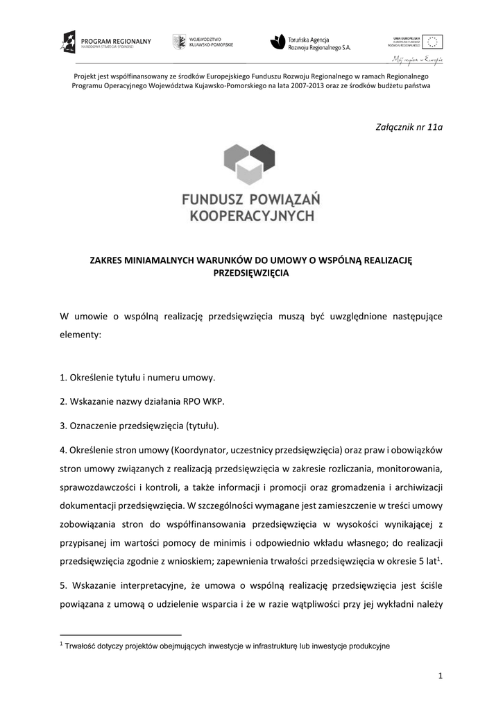 Projekt jest współfinansowany ze środków Europejskiego Funduszu Rozwoju Regionalnego w ramach Regionalnego Programu Operacyjnego Województwa Kujawsko-Pomorskiego na lata 2007-2013 oraz ze środków budżetu państwa Załącznik nr 11a ZAKRES MINIAMALNYCH WARUNKÓW DO UMOWY O WSPÓLNĄ REALIZACJĘ PRZEDSIĘWZIĘCIA W umowie o wspólną realizację przedsięwzięcia muszą być uwzględnione następujące elementy: 1. Określenie tytułu i numeru umowy. 2. Wskazanie nazwy działania RPO WKP. 3. Oznaczenie przedsięwzięcia (tytułu). 4. Określenie stron umowy (Koordynator, uczestnicy przedsięwzięcia) oraz praw i obowiązków stron umowy związanych z realizacją przedsięwzięcia w zakresie rozliczania, monitorowania, sprawozdawczości i kontroli, a także informacji i promocji oraz gromadzenia i archiwizacji dokumentacji przedsięwzięcia. W szczególności wymagane jest zamieszczenie w treści umowy zobowiązania stron do współfinansowania przedsięwzięcia w wysokości wynikającej z przypisanej im wartości pomocy de minimis i odpowiednio wkładu własnego; do realizacji przedsięwzięcia zgodnie z wnioskiem; zapewnienia trwałości przedsięwzięcia w okresie 5 lat1. 5. Wskazanie interpretacyjne, że umowa o wspólną realizację przedsięwzięcia jest ściśle powiązana z umową o udzielenie wsparcia i że w razie wątpliwości przy jej wykładni należy 1 Trwałość dotyczy projektów obejmujących inwestycje w infrastrukturę lub inwestycje produkcyjne 1 mieć na względzie postanowienia umowy o udzielenie wsparcia oraz cel, jakim jest realizacja przesięwzięcia zgodnie z prawem i umową o udzielenie wsparcia. 6. Określenie wysokości i formy wsparcia, w tym w szczególności wskazanie podziału finansowego przedsięwzięcia na uczestników przedsięwzięcia. 7. Wskazanie warunków przekazywania środków finansowych przez Koordynatora Uczestnikom przedsięwzięcia, w tym terminu, w jakim Koordynator przekaże płatności Uczestnikom przedsięwzięcia. 8. Określenie wydatków objętych wsparciem. 9. Oznaczenie daty początkowej i końcowej okresu kwalifikowalności wydatków w ramach przedsięwzięcia. 10. Zasady realizacji przedsięwzięcia i współpracy pomiędzy Koordynatorem i Uczestnikami przy realizacji przedsięwzięcia. 11. Zobowiązania Koordynatora i Uczestników wynikające z realizacji przedsięwzięcia objętego umową. 12. Zakres odpowiedzialności Koordynatora i Uczestników przedsięwzięcia wynikający z realizacji przedsięwzięcia objętego umową. 13. Prawa i obowiązki Uczestnika przedsięwzięcia względem Koordynatora w sytuacji wystąpienia Uczestnika przedsięwzięcia po otrzymaniu wsparcia. 14. Zapis, że Uczestnicy przedsięwzięcia upoważniają Koordynatora do reprezentowania i podpisania w ich imieniu umowy oraz, że uprawnionym do kontaktu z Operatorem jest wyłącznie Koordynator. Postanowienie, że wynikające z umowy o udzielenie wsparcia prawa i obowiązki Koordynatora stosuje się odpowiednio do wszystkich Uczestników przedsięwzięcia, którzy w stosunku Operatora wykonują je za pośrednictwem Koordynatora. 15. Zobowiązanie Uczestnika przedsięwzięcia do: 1) realizacji przedsięwzięcia w zakresie określonym w umowie o wspólną realizację przedsięwzięcia, zgodnym z Harmonogramem rzeczowo-finansowym stanowiącym załącznik do Umowy o udzielenie wsparcia, zgodnie z obowiązującymi przepisami prawa krajowego i wspólnotowego, w szczególności zasadami polityk wspólnotowych, w tym przepisami 2 dotyczącymi konkurencji, udzielania zamówień publicznych, pomocy publicznej, ochrony środowiska oraz równouprawnienia kobiet i mężczyzn; 2) przestrzegania przepisów dotyczących poziomów intensywności pomocy publicznej, w tym pomocy de minimis przy korzystaniu ze wsparcia w realizacji przedsięwzięcia; 3) zapewnienia finansowania przedsięwzięcia, w szczególności pokrycia wydatków niekwalifikujących się do objęcia wsparciem koniecznych dla realizacji przedsięwzięcia; 4) zakończenia realizacji przedsięwzięcia we wskazanym okresie kwalifikowalności wydatków; 5) nieprzenoszenia na inny podmiot, w okresie kwalifikowalności wydatków oraz w okresie trwałości przedsięwzięcia, praw lub obowiązków wynikających z umowy o wspólną realizację przedsięwzięcia. 6) zachowania wartości niematerialnych i prawnych w swoich aktywach i do pozostania ich właścicielem w okresie kwalifikowalności wydatków oraz w okresie trwałości przedsięwzięcia określonym w Umowie o udzielenie wsparcia, do amortyzacji tych aktywów zgodnie z odrębnymi przepisami, a także do wykorzystywania tych aktywów wyłącznie na cele przedsięwzięcia; 7) przekazywania Koordynatorowi, na każde wezwanie, informacji i wyjaśnień na temat realizacji przedsięwzięcia; 8) poddania się kontroli i dochowania obowiązków wynikających z § 10 Umowy o udzielenie wsparcia, w tym wglądu w dokumenty związane z realizacją przedsięwzięcia; 9) przedstawiania Koordynatorowi informacji finansowych/sprawozdawczych i wyjaśnień, w zakresie zadań realizowanych w ramach przedsięwzięcia, terminach i formie umożliwiającej Koordynatorowi wywiązywanie się z jego obowiązków informacyjnych względem Operatora, w tym przygotowywanie wniosków o płatność wymaganych w umowie o udzielenie wsparcia; 11) stosowania w zakresie nieuregulowanym odpowiednio Umowy o udzielenie wsparcia; 12) udostępniania każdorazowo na wniosek Koordynatora lub uprawnionych podmiotów dokumentów lub informacji umożliwiających dokonanie oceny wpływu realizowanych etapów/prac w odniesieniu do celów przedsięwzięcia. 16. W przypadku występowania pomiędzy Koordynatorem i Uczestnikami przedsięwzięcia jakichkolwiek związków (osobowych bądź kapitałowych), porozumienie powinno zawierać ponadto oświadczenie stron w tym zakresie, określające charakter takich związków pomiędzy poszczególnymi podmiotami. 3