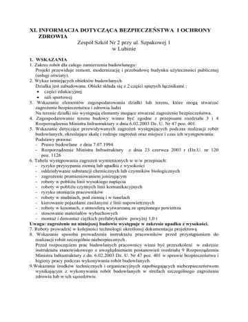 XI. INFORMACJA DOTYCZĄCA BEZPIECZEŃSTWA I OCHRONY ZDROWIA Zespół Szkół Nr 2 przy ul. Szpakowej 1 w Lubinie 1. WSKAZANIA 1. Zakres robót dla całego zamierzenia budowlanego: Projekt przewiduje remont, modernizację i przebudowę budynku użyteczności publicznej (usługi oświaty). 2. Wykaz istniejących obiektów budowlanych Działka jest zabudowana. Obiekt składa się z 2 części spiętych łącznikami : • części edukacyjnej • sali sportowej 3. Wskazanie elementów zagospodarowania działki lub terenu, które mogą stwarzać zagrożenie bezpieczeństwa i zdrowia ludzi Na terenie działki nie występują elementy mogące stwarzać zagrożenie bezpieczeństwa. 4. Zagospodarowanie terenu budowy winno być zgodne z przepisami rozdziału 3 i 4 Rozporządzenia Ministra Infrastruktury z dnia 6.02.2003 Dz. U. Nr 47 poz. 401. 5. Wskazanie dotyczące przewidywanych zagrożeń występujących podczas realizacji robót budowlanych, określające skalę i rodzaje zagrożeń oraz miejsce i czas ich występowania: Podstawy prawne: - Prawo budowlane z dnia 7.07.1994 - Rozporządzenie Ministra Infrastruktury z dnia 23 czerwca 2003 r (Dz.U. nr 120 poz. 1126 6. Tabela występowania zagrożeń wymienionych w w/w przepisach: - ryzyko przysypania ziemią lub upadku z wysokości - oddziaływanie substancji chemicznych lub czynników biologicznych - zagrożenie promieniowaniem jonizującym - roboty w pobliżu linii wysokiego napięcia - roboty w pobliżu czynnych linii komunikacyjnych - ryzyko utonięcia pracowników - roboty w studniach, pod ziemią i w tunelach - kierowanie pojazdami zasilanymi z linii napowietrznych - roboty w kesonach, z atmosferą wytwarzaną ze sprężonego powietrza - stosowanie materiałów wybuchowych - montaż i demontaż ciężkich prefabrykatów powyżej 1,0 t Uwaga: zagrożenie na niniejszej budowie występuje w zakresie upadku z wysokości. 7. Roboty prowadzić w kolejności technologii określonej dokumentacja projektową 8. Wskazanie sposobu prowadzenia instruktażu pracowników przed przystąpieniem do realizacji robót szczególnie niebezpiecznych . Przed rozpoczęciem prac budowlanych pracownicy winni być przeszkoleni w zakresie instruktażu stanowiskowego z uwzględnieniem postanowień rozdziału 9 Rozporządzenia Ministra Infrastruktury z dn. 6.02.2003 Dz. U. Nr 47 poz. 401 w sprawie bezpieczeństwa i higieny pracy podczas wykonywania robót budowlanych. 9.Wskazanie środków technicznych i organizacyjnych zapobiegających niebezpieczeństwom wynikającym z wykonywania robót budowlanych w strefach szczególnego zagrożenia zdrowia lub w ich sąsiedztwie. Podczas prowadzonych prac występują roboty stwarzające szczególne zagrożenie bezpieczeństwa i w związku z tym wykonanie planu BIOZ przez Kierownika Budowy jest obowiązkowe. 10. Zagrożenie powstanie podczas robót murarskich, elewacyjnych i dekarskich na wysokości ponad 5,0 metrów. Zagrożenie podczas prac na wysokości należy eliminować stosując rusztowania z barierami ochronnymi, pasy i linki montażysty i kaski ochronne. 11 Należy przestrzegać przepisów BHP i zwracać uwagę na organizację pracy i porządek na budowie. 2. PODSTAWOWE ZASADY BEZPIECZEŃSTWA PRACY NA RUSZTOWANIACH I WYSOKOŚCI W trakcie robót na rusztowaniach i wysokościach należy zachować szczególna ostrożność z zachowaniem następujących zasad: - rusztowania ustawić na twardym, równym podłożu, - zapewnić stabilność rusztowań i odpowiednią ich wytrzymałość na przewidywane obciążenia, - przed przystąpieniem do prac na rusztowaniu dokonać odbioru technicznego rusztowań przez osobę mającą odpowiednie uprawnienia (z wpisem tego faktu do dziennika budowy), - Montaż rusztowań, ich eksploatacja i demontaż powinny być wykonane zgodnie z instrukcją obsługi producenta lub projektem indywidualnym, - Pracownicy zatrudnieni na wysokościach oraz pracownicy współpracujący z nimi mają obowiązek używania kasków ochronnych, - Przed montażem i demontażem rusztowań należy wyznaczyć strefę niebezpieczną, - Rusztowania usytuowane bezpośrednio przy drogach, w miejscach przejść dla pieszych powinny posiadać daszki ochronne i osłonę z siatek ochronnych. Zabronione jest: Montaż, eksploatacja i demontaż rusztowań i ruchomych podestów roboczych: • Jeżeli o zmroku nie zapewniono oświetlenia pozwalającego na dobrą widoczność; • Widoczność czasie gęstej mgły, opadów deszczu, śniegu oraz gołoledzi; • W czasie burzy lub wiatru, o prędkości przekraczającej 10 m/s. Pozostawienie materiałów wyrobów na pomostach rusztowań i ruchomych podestów roboczych po zakończeniu pracy. Zrzucanie elementów demontowanych rusztowań i ruchomych podestów roboczych. Przeciążenie pomostów rusztowań materiałami. Wykonywanie gwałtownych ruchów, przechylanie się przez poręcze, gromadzenie wyrobów, materiałów narzędzi po jednej stronie ruchomego podestu roboczego oraz opieranie się o ścianę obiektu budowlanego przez osoby znajdujące się na podeście. UWAGI: - używać wyłącznie materiałów dopuszczonych do stosowania w budownictwie - pracownicy wykonujący wszystkie prace budowlane powinni być przeszkoleni w zakresie BHP, sprawni fizycznie i psychicznie oraz posiadać aktualne badania lekarskie - prace wykonywać zgodnie z obowiązującymi normami, przepisami i zgodnie ze sztuką budowlaną. 3. - WSKAZANIE ŚRODKÓW TECHNICZNYCH I ORGANIZACYJNYCH ZAPOBIEGAJĄCYCH NIEBEZPIECZEŃSTWOM WYNIKAJĄCYM Z WYKONYWANIA ROBÓT BUDOWLANYCH drogi, dojścia powinny być przejezdne, drogi ewakuacyjne powinny być wolne, zabrania się składowania na nich materiałów budowlanych, gromadzenia sprzętu, itp. umieszczenie we wszelkich widocznych miejscach tablic ostrzegawczo – informacyjnych, miejsca niebezpieczne powinny byś ogrodzone taśmą ostrzegawczą bądź ogrodzone. 4. WSZELKIE PRACE BUDOWLANE NALEŻY PROWADZIĆ ZGODNIE Z: 1. Ustawą z dnia 26 czerwca 1974 r. Kodeks pracy (tj