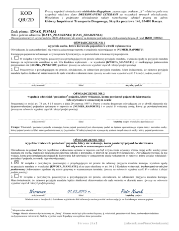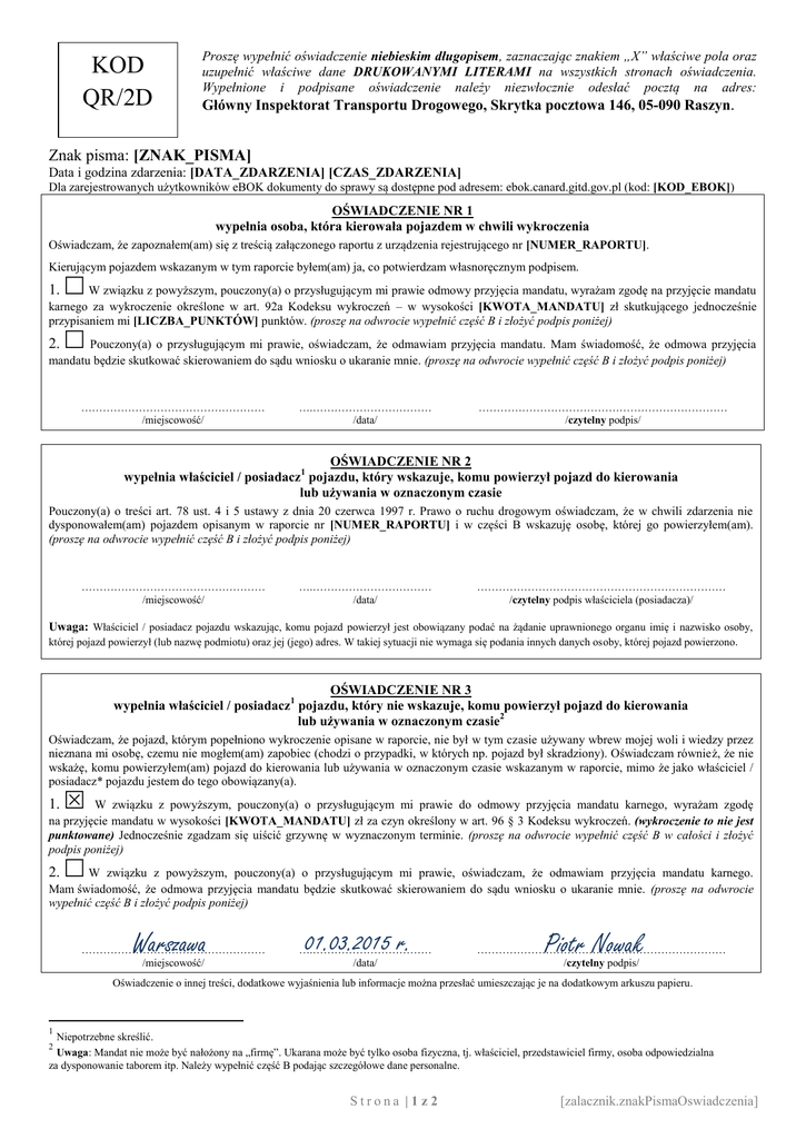 KOD QR/2D Proszę wypełnić oświadczenie niebieskim długopisem, zaznaczając znakiem „X” właściwe pola oraz uzupełnić właściwe dane DRUKOWANYMI LITERAMI na wszystkich stronach oświadczenia. Wypełnione i podpisane oświadczenie należy niezwłocznie odesłać pocztą na adres: Główny Inspektorat Transportu Drogowego, Skrytka pocztowa 146, 05-090 Raszyn. Znak pisma: [ZNAK_PISMA] Data i godzina zdarzenia: [DATA_ZDARZENIA] [CZAS_ZDARZENIA] Dla zarejestrowanych użytkowników eBOK dokumenty do sprawy są dostępne pod adresem: ebok.canard.gitd.gov.pl (kod: [KOD_EBOK]) OŚWIADCZENIE NR 1 wypełnia osoba, która kierowała pojazdem w chwili wykroczenia Oświadczam, że zapoznałem(am) się z treścią załączonego raportu z urządzenia rejestrującego nr [NUMER_RAPORTU]. Kierującym pojazdem wskazanym w tym raporcie byłem(am) ja, co potwierdzam własnoręcznym podpisem. W związku z powyższym, pouczony(a) o przysługującym mi prawie odmowy przyjęcia mandatu, wyrażam zgodę na przyjęcie mandatu karnego za wykroczenie określone w art. 92a Kodeksu wykroczeń – w wysokości [KWOTA_MANDATU] zł skutkującego jednocześnie przypisaniem mi [LICZBA_PUNKTÓW] punktów. (proszę na odwrocie wypełnić część B i złożyć podpis poniżej) 1. Pouczony(a) o przysługującym mi prawie, oświadczam, że odmawiam przyjęcia mandatu. Mam świadomość, że odmowa przyjęcia mandatu będzie skutkować skierowaniem do sądu wniosku o ukaranie mnie. (proszę na odwrocie wypełnić część B i złożyć podpis poniżej) 2. …………………………………………… /miejscowość/ ….…………………………… /data/ …………………………………………………………… /czytelny podpis/ OŚWIADCZENIE NR 2 wypełnia właściciel / posiadacz1 pojazdu, który wskazuje, komu powierzył pojazd do kierowania lub używania w oznaczonym czasie Pouczony(a) o treści art. 78 ust. 4 i 5 ustawy z dnia 20 czerwca 1997 r. Prawo o ruchu drogowym oświadczam, że w chwili zdarzenia nie dysponowałem(am) pojazdem opisanym w raporcie nr [NUMER_RAPORTU] i w części B wskazuję osobę, której go powierzyłem(am). (proszę na odwrocie wypełnić część B i złożyć podpis poniżej) …………………………………………… /miejscowość/ ….…………………………… /data/ …………………………………………………………… /czytelny podpis właściciela (posiadacza)/ Uwaga: Właściciel / posiadacz pojazdu wskazując, komu pojazd powierzył jest obowiązany podać na żądanie uprawnionego organu imię i nazwisko osoby, której pojazd powierzył (lub nazwę podmiotu) oraz jej (jego) adres. W takiej sytuacji nie wymaga się podania innych danych osoby, której pojazd powierzono. OŚWIADCZENIE NR 3 wypełnia właściciel / posiadacz1 pojazdu, który nie wskazuje, komu powierzył pojazd do kierowania lub używania w oznaczonym czasie2 Oświadczam, że pojazd, którym popełniono wykroczenie opisane w raporcie, nie był w tym czasie używany wbrew mojej woli i wiedzy przez nieznana mi osobę, czemu nie mogłem(am) zapobiec (chodzi o przypadki, w których np. pojazd był skradziony). Oświadczam również, że nie wskażę, komu powierzyłem(am) pojazd do kierowania lub używania w oznaczonym czasie wskazanym w raporcie, mimo że jako właściciel / posiadacz* pojazdu jestem do tego obowiązany(a). W związku z powyższym, pouczony(a) o przysługującym mi prawie do odmowy przyjęcia mandatu karnego, wyrażam zgodę na przyjęcie mandatu w wysokości [KWOTA_MANDATU] zł za czyn określony w art. 96 § 3 Kodeksu wykroczeń. (wykroczenie to nie jest punktowane) Jednocześnie zgadzam się uiścić grzywnę w wyznaczonym terminie. (proszę na odwrocie wypełnić część B w całości i złożyć podpis poniżej) 1. W związku z powyższym, pouczony(a) o przysługującym mi prawie, oświadczam, że odmawiam przyjęcia mandatu karnego. Mam świadomość, że odmowa przyjęcia mandatu będzie skutkować skierowaniem do sądu wniosku o ukaranie mnie. (proszę na odwrocie wypełnić część B i złożyć podpis poniżej) 2. Warszawa …………………………………………… /miejscowość/ 01.03.2015 r. ….…………………………… /data/ Piotr Nowak …………………………………………………………… /czytelny podpis/ Oświadczenie o innej treści, dodatkowe wyjaśnienia lub informacje można przesłać umieszczając je na dodatkowym arkuszu papieru. 1 Niepotrzebne skreślić. Uwaga: Mandat nie może być nałożony na „firmę”. Ukarana może być tylko osoba fizyczna, tj. właściciel, przedstawiciel firmy, osoba odpowiedzialna za dysponowanie taborem itp. Należy wypełnić część B podając szczegółowe dane personalne. 2 Strona |1 z2 [zalacznik.znakPismaOswiadczenia] Część B (poniższe dane określają sprawcę wykroczenia / osobę, której powierzono pojazd lub dysponowała pojazdem3) Dane osobowe N O W A K Nazwisko rodowe: N O W A K Imię pierwsze: P I O T R Imię drugie: A D A M Imię matki: A N N A Nazwisko rodowe matki: K O W A Imię ojca: J A N 0 0 0 0 1 M W A R S Z A W A Nazwisko (nazwa podmiotu tylko, gdy pojazd powierzono): L S K Płeć (M/K): PESEL: 7 5 A 0 1 0 1 Miejsce urodzenia: Data urodzenia (rok-miesiąc-dzień): 1 9 7 0 1 0 1 5 Dokument tożsamości: 1 Rodzaj dokumentu (1-dowód osobisty, 2-paszport, 3-karta pobytu na osiedlenie, 4-karta pobytu na zamieszkanie): Seria i numer: Obywatelstwo: A A A 1 2 3 4 5 P Adres zamieszkania: Kraj: P O L S K A Województwo: M A Z O W I Powiat: W A R S Z A W A Gmina: W A R S Z A W A Ulica: P O W S Z E Numer budynku: 1 Miejscowość: W A R Kod pocztowy: 0 1 2 3 Poczta: W A E C C H K I N A O L S K I E E 1 Numer lokalu: 0 R S S Z Z 0 1 A W A A W A Adres dla doręczeń (jeżeli jest inny niż adres zamieszkania): Nazwa firmy: Ulica: Numer budynku: Numer lokalu: Miejscowość Kod pocztowy: Kraj: Poczta: Dokument uprawniający do kierowania poj