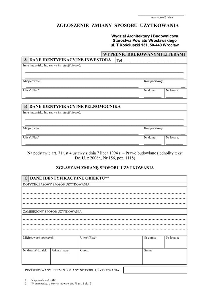 _____________________________ miejscowość i data ZGŁOSZENIE ZMIANY SPOSOBU UŻYTKOWANIA Wydział Architektury i Budownictwa Starostwa Powiatu Wrocławskiego ul. T Kościuszki 131, 50-440 Wrocław WYPEŁNIĆ DRUKOWANYMI LITERAMI A DANE IDENTYFIKACYJNE INWESTORA Tel……………………………………. Imię i nazwisko lub nazwa instytucji/pieczęć: ________________________________________________________________ ________________________________________________________________ Miejscowość: _____________________________________________________ Ulica*/Plac* Kod pocztowy: _________________________ Nr lokalu: Nr domu: ______________________________________________ _______ _______ B DANE IDENTYFIKACYJNE PEŁNOMOCNIKA Imię i nazwisko lub nazwa instytucji/pieczęć: ________________________________________________________________ ________________________________________________________________ Miejscowość: _____________________________________________________ Ulica*/Plac* Kod pocztowy _________________________ Nr domu: Nr lokalu: ______________________________________________ _______ _______ Na podstawie art. 71 ust.4 ustawy z dnia 7 lipca 1994 r. – Prawo budowlane (jednolity tekst Dz. U. z 2006r., Nr 156, poz. 1118) ZGŁASZAM ZMIANĘ SPOSOBU UŻYTKOWANIA C DANE IDENTYFIKACYJNE OBIEKTU** DOTYCHCZASOWY SPOSÓB UŻYTKOWANIA ZAMIERZONY SPOSÓB UŻYTKOWANIA Miejscowość inwestycji: Ulica*/Plac* Nr domu: Nr działki/ działek Obręb: Gmina Arkusz mapy: PRZEWIDYWANY TERMIN ZMIANY SPOSOBU UŻYTKOWANIA 1. 2. Niepotrzebne skreślić W przypadku, o którym mowa w art. 71 ust. 1 pkt 2 Nr lokalu: D OPŁATA SKARBOWA nie podlega (wypełnia wnioskodawca zaznaczając właściwe kwadraty pola oznaczone kolorem szarym wypełnia pracownik) art. 2 ust. 1 pkt 2 art. 7 budownictwo mieszkaniowe (w tym urządzenia i budowle z nim związane) □ pkt 2 jednostki budżetowe □ pkt 3 jednostki samorządu terytorialnego □ ppkt 3 pełnomocnictwo dla małżonka, wstępnego, zstępnego, rodzeństwa zwolnienie □ załącznik cz. IV pkt 9 inne przypadki przewidziane ustawą art................................ kwota pobrana pełnomocnictwo 17 zł zaświadczenie (za każde) suma 17 z ł x należna dopłata □ □ zwrot zweryfikowano wysokość pobranej opłaty podpis i pieczęć potwierdzenie nr pokwitowania data wpłaty podpis i pieczęć osoby przyjmującej przyjęcia opłaty Urząd Miejski Wrocławia 03 1090 2398 0000 0006 0800 3288 dopłaty Urząd Miejski Wrocławia 03 1090 2398 0000 0006 0800 3288 wysokość opłaty zostanie zweryfikowana po opracowaniu dokumentu wg przepisów ustawy o opłacie skarbowej z dnia 16 listopada 2006 roku (Dz. U. nr 225 poz. 1635) Ilość E DO ZGŁOSZENIA DOŁĄCZAM:* OPRACOWANIE ZAWIERAJĄCE: opis i rysunek określający usytuowanie obiektu budowlanego w stosunku do granic nieruchomości (działki budowlanej) i innych obiektów budowlanych na działce wnioskodawcy i działkach sąsiednich, z oznaczeniem części obiektu, w której zamierza się dokonać zmiany sposobu użytkowania 1. 2. zwięzły opis techniczny, określający rodzaj i charakterystykę obiektu budowlanego, jego konstrukcję, dotychczasowe i zamierzone przeznaczenie, wraz z danymi techniczno-użytkowymi, w tym wielkościami i rozkładem obciążeń, a w razie potrzeby również danymi technologicznymi 3. oświadczenie o posiadaniu prawa do dysponowania nieruchomością na cele budowlane 4. zaświadczenie wójta, burmistrza albo prezydenta miasta o zgodności zamierzonego sposobu użytkowania obiektu budowlanego z ustaleniami obowiązującego miejscowego planu zagospodarowania przestrzennego albo ostateczną decyzję o warunkach zabudowy i zagospodarowania terenu w przypadku braku obowiązującego miejscowego planu zagospodarowania przestrzennego ekspertyzę techniczną wykonaną przez osobę posiadającą uprawnienia budowlane bez ograniczeń w odpowiedniej specjalności lub przez rzeczoznawcę budowlanego w zakresie obejmującym odpowiednią specjalność,2) 5. 6. pełnomocnictwo udzielone osobie działającej w imieniu inwestora.1) 7. w zależności od potrzeb dowody uzyskania wymaganych przepisami szczególnymi uzgodnień, pozwoleń, opinii lub innych dokumentów,1) ( Dz. U.113 poz. 954 z 27.06.2005r.) decyzja o środowiskowych uwarunkowaniach zgody na realizację przedsięwzięcia zgodnie ze zmianą do ustawy – Prawo ochrony środowiska z dnia 18.05.2005r.- ( Dz. U.113 poz. 954 z 27.06.2005r.) 8. dowód wpłaty opłaty skarbowej Pouczenie: 1) Do wykonania robót budowlanych można przystąpić, jeżeli w terminie 30 dni od dnia doręczenia zgłoszenia właściwy organ nie wniesie, w drodze decyzji, sprzeciwu nie później niż po upływie dwóch lat od określonego w zgłoszeniu terminu ich rozpoczęcia. 2) Dokonanie zgłoszenia, o którym mowa w ust. 2, po zmianie sposobu użytkowania obiektu budowlanego lub jego części nie wywołuje skutków prawnych Oświadczam, że zapoznałam/łem się z pouczeniem zawartym w druku zgłoszenia ................................................................................ (podpis inwestora lub osoby przez niego upoważnionej) 1. 2. Niepotrzebne skreślić W przypadku, o którym mowa w art. 71 ust. 1 pkt 2