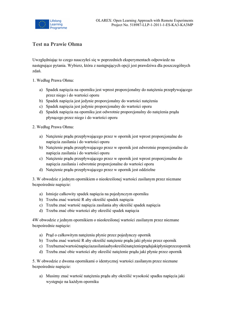 OLAREX: Open Learning Approach with Remote Experiments Project No. 518987-LLP-1-2011-1-ES-KA3-KA3MP Test na Prawie Ohma Uwzględniając to czego nauczyłeś się w poprzednich eksperymentach odpowiedz na następujące pytania. Wybierz, która z następujących opcji jest prawdziwa dla poszczególnych zdań. 1. Według Prawa Ohma: a) Spadek napięcia na oporniku jest wprost proporcjonalny do natęŜenia przepływającego przez niego i do wartości oporu b) Spadek napięcia jest jedynie proporcjonalny do wartości natęŜenia c) Spadek napięcia jest jedynie proporcjonalny do wartości oporu d) Spadek napięcia na oporniku jest odwrotnie proporcjonalny do natęŜenia prądu płynącego przez niego i do wartości oporu 2. Według Prawa Ohma: a) NatęŜenie prądu przepływającego przez w opornik jest wprost proporcjonalne do napięcia zasilania i do wartości oporu b) NatęŜenie prądu przepływającego przez w opornik jest odwrotnie proporcjonalne do napięcia zasilania i do wartości oporu c) NatęŜenie prądu przepływającego przez w opornik jest wprost proporcjonalne do napięcia zasilania i odwrotnie proporcjonalne do wartości oporu d) NatęŜenie prądu przepływającego przez w opornik jest oddzielne 3. W obwodzie z jednym opornikiem o nieokreślonej wartości zasilanym przez nieznane bezpośrednie napięcie: a) b) c) d) Istnieje całkowity spadek napięcia na pojedynczym oporniku Trzeba znać wartość R aby określić spadek napięcia Trzeba znać wartość napięcia zasilania aby określić spadek napięcia Trzeba znać obie wartości aby określić spadek napięcia 4W obwodzie z jednym opornikiem o nieokreślonej wartości zasilanym przez nieznane bezpośrednie napięcie: a) b) c) d) Prąd o całkowitym natęŜeniu płynie przez pojedynczy opornik Trzeba znać wartość R aby określić natęŜenie prądu jaki płynie przez opornik TrzebaznaćwartośćnapięciazasilaniaabyokreślićnatęŜenieprądujakipłynieprzezopornik Trzeba znać obie wartości aby określić natęŜenie prądu jaki płynie przez opornik 5. W obwodzie z dwoma opornikami o identycznej wartości zasilanym przez nieznane bezpośrednie napięcie: a) Musimy znać wartość natęŜenia prądu aby określić wysokość spadku napięcia jaki występuje na kaŜdym oporniku OLAREX: Open Learning Approach with Remote Experiments Project No. 518987-LLP-1-2011-1-ES-KA3-KA3MP b) Występuje spadek napięcia na kaŜdym oporniku, który jest równy połowie wartości napięcia zasilania c) Trzeba znać wartość napięcia zasilania aby określić spadek napięcia na kaŜdym oporniku d) Trzeba znać obie wartości aby określić spadek napięcia na kaŜdym oporniku 6. W obwodzie z dwoma opornikami o identycznej wartości zasilanym przez nieznane bezpośrednie napięcie: a) NatęŜenie prądu który płynie przez kaŜdy opornik stanowi połowę całkowitego b) NatęŜenie prądu który płynie przez kaŜdy opornik jest identyczne c) Trzeba znać wartość napięcia zasilania aby ustalić natęŜenie prądu jaki płynie przez oporniki d) NatęŜenie prądu jest róŜne na kaŜdym oporniku 7. W obwodzie z dwoma opornikami – jeden o wartości dwa razy większej od drugiego zasilanym przez nieznane bezpośrednie napięcie: a) Musimy znać wartość natęŜenia prądu aby określić wysokość spadku napięcia jaki występuje na kaŜdym oporniku b) Występuje połowa spadku napięcia na małym oporniku c) Występuje spadek napięcia odpowiadający jednej trzeciej napięcia zasilania na małym oporniku d) Nie da się określić 8. W obwodzie z dwoma opornikami – jeden o wartości dwa razy większej od drugiego zasilanym przez nieznane bezpośrednie napięcie: a) Występuje spadek napięcia odpowiadający dwukrotności wytwarzanego na małym oporniku na duŜy opornik b) Występuje podwójny spadek napięcia na małym oporniku c) Występuje spadek napięcia odpowiadający jednej trzeciej napięcia zasilania na małym oporniku d) Nie da się określić 9. W obwodzie z dwoma szeregowymi opornikami, muszą wystąpić następujące opcje w ich przypadku, aby spadek napięcia był 10 razy większy niŜ winnych na oporniku a) b) c) d) Suma obu oporników musi wynosić 10 Większy opornik musi być 9 razy większy od mniejszego Mały opornik musi być 9 razy większy od duŜego Większy opornik musi być 10 razy większy od mniejszego 10. Jeśli napięcie zasilania jest zwiększane, tak by mogło być10razy większa niŜ oryginalne, a chcemy utrzymać natęŜenie prądu płynącego przez pojedynczy opornik, wtedy: a) Pojedynczy opornik w obwodzie musi być 10 razy mniejszy b) Pojedynczy opornik w obwodzie musi być 10 razy większy OLAREX: Open Learning Approach with Remote Experiments Project No. 518987-LLP-1-2011-1-ES-KA3-KA3MP c) Pojedynczy opornik w obwodzie moŜe utrzymać jego wartość d) Nie da się tego określić