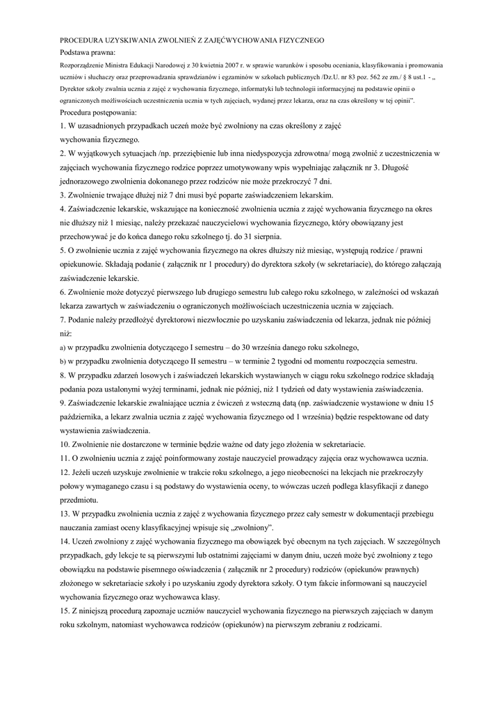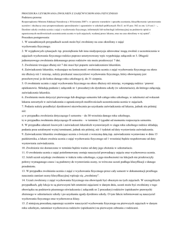 PROCEDURA UZYSKIWANIA ZWOLNIEŃ Z ZAJĘĆWYCHOWANIA FIZYCZNEGO Podstawa prawna: Rozporządzenie Ministra Edukacji Narodowej z 30 kwietnia 2007 r. w sprawie warunków i sposobu oceniania, klasyfikowania i pro mowania uczniów i słuchaczy oraz przeprowadzania sprawdzianów i egzaminów w szkołach publicznych /Dz.U. nr 83 poz. 562 ze zm./ § 8 ust.1 - „ Dyrektor szkoły zwalnia ucznia z zajęć z wychowania fizycznego, informatyki lub technologii informacyjnej na podstawie opinii o ograniczonych możliwościach uczestniczenia ucznia w tych zajęciach, wydanej przez lekarza, oraz na czas określony w tej opinii”. Procedura postępowania: 1. W uzasadnionych przypadkach uczeń może być zwolniony na czas określony z zajęć wychowania fizycznego. 2. W wyjątkowych sytuacjach /np. przeziębienie lub inna niedyspozycja zdrowotna/ mogą zwolnić z uczestniczenia w zajęciach wychowania fizycznego rodzice poprzez umotywowany wpis wypełniając załącznik nr 3. Długość jednorazowego zwolnienia dokonanego przez rodziców nie może przekroczyć 7 dni. 3. Zwolnienie trwające dłużej niż 7 dni musi być poparte zaświadczeniem lekarskim. 4. Zaświadczenie lekarskie, wskazujące na konieczność zwolnienia ucznia z zajęć wychowania fizycznego na okres nie dłuższy niż 1 miesiąc, należy przekazać nauczycielowi wychowania fizycznego, który obowiązany jest przechowywać je do końca danego roku szkolnego tj. do 31 sierpnia. 5. O zwolnienie ucznia z zajęć wychowania fizycznego na okres dłuższy niż miesiąc, występują rodzice / prawni opiekunowie. Składają podanie ( załącznik nr 1 procedury) do dyrektora szkoły (w sekretariacie), do którego załączają zaświadczenie lekarskie. 6. Zwolnienie może dotyczyć pierwszego lub drugiego semestru lub całego roku szkolnego, w zależności od wskazań lekarza zawartych w zaświadczeniu o ograniczonych możliwościach uczestniczenia ucznia w zajęciach. 7. Podanie należy przedłożyć dyrektorowi niezwłocznie po uzyskaniu zaświadczenia od lekarza, jednak nie później niż: a) w przypadku zwolnienia dotyczącego I semestru – do 30 września danego roku szkolnego, b) w przypadku zwolnienia dotyczącego II semestru – w terminie 2 tygodni od momentu rozpoczęcia semestru. 8. W przypadku zdarzeń losowych i zaświadczeń lekarskich wystawianych w ciągu roku szkolnego rodzice składają podania poza ustalonymi wyżej terminami, jednak nie później, niż 1 tydzień od daty wystawienia zaświadczenia. 9. Zaświadczenie lekarskie zwalniające ucznia z ćwiczeń z wsteczną datą (np. zaświadczenie wystawione w dniu 15 października, a lekarz zwalnia ucznia z zajęć wychowania fizycznego od 1 września) będzie respektowane od daty wystawienia zaświadczenia. 10. Zwolnienie nie dostarczone w terminie będzie ważne od daty jego złożenia w sekretariacie. 11. O zwolnieniu ucznia z zajęć poinformowany zostaje nauczyciel prowadzący zajęcia oraz wychowawca ucznia. 12. Jeżeli uczeń uzyskuje zwolnienie w trakcie roku szkolnego, a jego nieobecności na lekcjach nie przekroczyły połowy wymaganego czasu i są podstawy do wystawienia oceny, to wówczas uczeń podlega klasyfikacji z danego przedmiotu. 13. W przypadku zwolnienia ucznia z zajęć z wychowania fizycznego przez cały semestr w dokumentacji przebiegu nauczania zamiast oceny klasyfikacyjnej wpisuje się „zwolniony”. 14. Uczeń zwolniony z zajęć wychowania fizycznego ma obowiązek być obecnym na tych zajęciach. W szczególnych przypadkach, gdy lekcje te są pierwszymi lub ostatnimi zajęciami w danym dniu, uczeń może być zwolniony z tego obowiązku na podstawie pisemnego oświadczenia ( załącznik nr 2 procedury) rodziców (opiekunów prawnych) złożonego w sekretariacie szkoły i po uzyskaniu zgody dyrektora szkoły. O tym fakcie informowani są nauczyciel wychowania fizycznego oraz wychowawca klasy. 15. Z niniejszą procedurą zapoznaje uczniów nauczyciel wychowania fizycznego na pierwszych zajęciach w danym roku szkolnym, natomiast wychowawca rodziców (opiekunów) na pierwszym zebraniu z rodzicami .