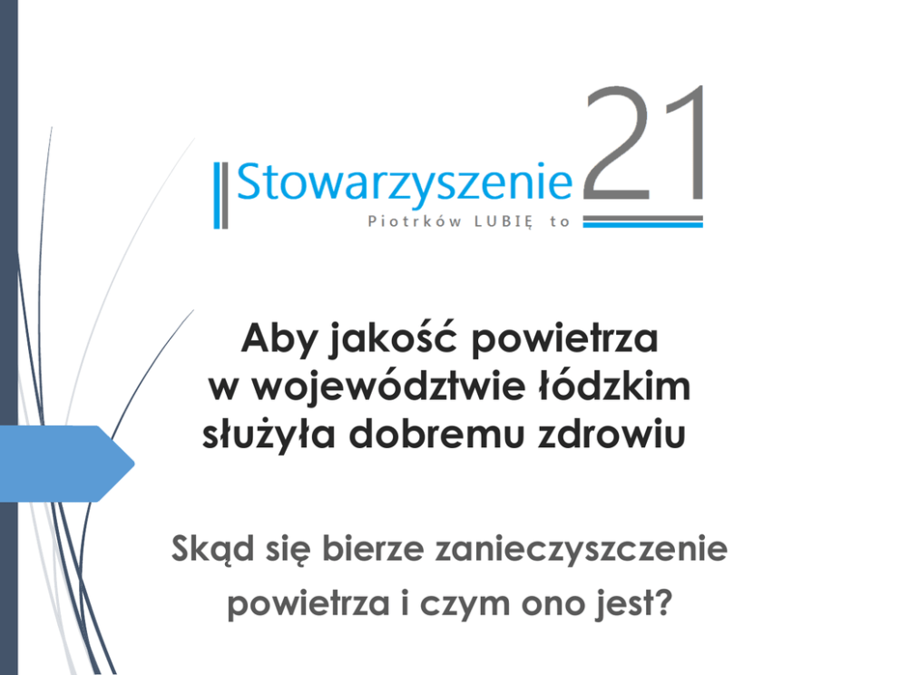 Aby jakość powietrza w województwie łódzkim służyła dobremu zdrowiu Skąd się bierze zanieczyszczenie powietrza i czym ono jest? „Zanieczyszczenie powietrza” to termin ogólny, warto więc sprecyzować z jakimi zanieczyszczeniami mamy w Polsce największy problem Pył zawieszony (ziarna większe – PM10 oraz ziarna mniejsze PM2,5), benzo[a]piren – substancja rakotwórcza i mutagenna oraz dwutlenek azotu. O ile stężenia pyłu zawieszonego i benzo[a]pirenu przekraczają normy na terenie całego kraju, w dużych miastach ale też i mniejszych miasteczkach, z dwutlenkiem azotu problem występuje jedynie w największych miejscowościach, przy ruchliwych arteriach komunikacyjnych (w 2014 r. były to: Kraków, Wrocław, Katowice oraz Warszawa). Wynika to z faktu, że dominującym źródłem pyłów i benzo[a]pirenu są domowe piece i kotły na węgiel i drewno, a dwutlenku azotu – samochody Aż sześć polskich miejscowości jest wymienianych w pierwszej dziesiątce miast Unii Europejskiej najbardziej zanieczyszczonych pyłem PM10. Jest to: Kraków, Nowy Sącz i miasta Górnego Śląska: Zabrze, Gliwice, Sosnowiec, Katowice Benzo[a]piren Stężenia wielopierścieniowych węglowodorów aromatycznych (WWA), w tym wyjątkowo niebezpiecznego, rakotwórczego i mutagennego benzo[a]pirenu przekraczają dopuszczalny poziom praktycznie na terenie całego kraju i są wielokrotnie wyższe niż stężenia tej substancji, z jakimi mają do czynienia mieszkańcy większości pozostałych państw UE (norma to średnie stężenie roczne równe 1 mg/m3) Głównym źródłem benzo[a]pirenu są domowe piece i kotły i na węgiel i drewno – związek ten powstaje przy spalaniu paliw stałych w niskich temperaturach. W zachodnich miastach nie spotkamy się z widokiem dymiących na czarno, szaro, żółto czy brązowo kominów domów i kamienic, podczas gdy w Polsce jest to powszechny element jesienno-zimowego krajobrazu Dominującą przyczyną zanieczyszczenia polskiego powietrza rakotwórczym benzo[a]pirenem, a także pyłem (PM10 oraz PM2,5) jest tzw. „niska emisja” Za tzw. „niską emisję” uznaje się umownie „emisję zanieczyszczeń wprowadzanych do powietrza emitorami (kominami) o wysokości do 40 metrów. Tym samym odpowiedzialnymi za powstawanie niskiej emisji są lokalne kotłownie opalane paliwami stałymi i ciężkim olejem opałowym, oraz indywidualne paleniska domowe opalane paliwami stałymi, zwłaszcza węglem i biomasą Niska emisja ma istotny wpływ na jakość powietrza, gdyż nisko usytuowane źródło emisji często prowadzi do powstania wysokich stężeń zanieczyszczeń w strefie przebywania ludzi Społeczeństwo polskie ma bardzo niską świadomość problemu zanieczyszczenia powietrza którym oddycha – aż osiemdziesiąt procent Polaków nie jest w stanie wymienić ani jednej substancji, która w znaczący sposób zanieczyszcza powietrze Aż 65% Polaków nie czuje się wystarczająco poinformowana o aktualnej jakości powietrza w ich miejscowości 70% osób mieszkających w Polsce chciałoby mieć łatwy dostęp do takich informacji. Mieszkańcy oczekują, że gminy zaangażują się w rozpowszechnianie informacji o aktualnej jakości powietrza. Informacje te powinny być dostępne nie tylko w Internecie ale również w mediach: telewizji, radiu i prasie. Wojewódzkie i powiatowe centra zarządzania kryzysowego, które zobligowane są do powiadamiania o ryzyku przekroczenia lub przekroczeniu dopuszczalnych stężeń zanieczyszczeń, w większości przypadków nie traktują zanieczyszczenia powietrza jako poważnego zagrożenia. Informacje o wysokim zanieczyszczeniu powietrza często nie docierają tam gdzie powinny, a więc do przedszkoli, szkół, mediów czy szpitali. Status informacji o zanieczyszczeniu powietrza w systemie zarządzania kryzysowego wciąż pozostaje niski Dziękujemy za uwagę „Aby jakość powietrza w województwie łódzkim służyła dobremu zdrowiu” Projekt „Aby jakość powietrza w województwie łódzkim służyła dobremu zdrowiu” jest realizowany przez Stowarzyszenie „21” w ramach konkursu pn. „EDUKACJA EKOLOGICZNA MIESZKAŃCÓW WOJEWÓDZTWA ŁÓDZKIEGO – EDYCJA 2016” (obszar priorytetowy: edukacja ekologiczna obejmująca problematykę zanieczyszczeń powietrza oraz ich szkodliwego oddziaływania na zdrowie ludzi). Projekt ma na celu pokazanie zalet pozyskiwania energii ze źródeł odnawialnych oraz zaprezentowanie tego w jaki sposób wytwarzanie energii elektrycznej, w różny sposób, ma wpływ na zanieczyszczenie powietrza. Więcej o projekcie pod adresem: www.stowarzyszenie21.pl <<Projekty realizowane>> Wartość ogólna zadania: 14 650,00 PLN www.stowarzyszenie21.pl Dofinansowanie z WFOŚiGW w Łodzi: Dotacja w kwocie 10 100,00 PLN www.zainwestujwekologie.pl Projekt dofinansowany jest przez Wojewódzki Fundusz Ochrony Środowiska i Gospodarki Wodnej w Łodzi z siedzibą przy ul. Dubois 118, w Łodzi (93-465).