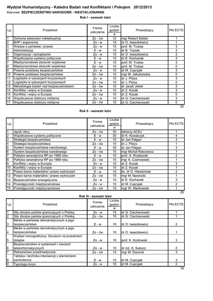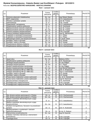 Wydział Humanistyczny - Katedra Badań nad Konfliktami i Pokojem 2012/2013 Kierunek: BEZPIECZEŃSTWO NARODOWE - NIESTACJONARNE Rok I - semestr letni Lp. 1 2 3 4 5 6 7 8 9 10 11 12 13 14 15 16 17 Forma zaliczenia Przedmiot Ochrona własności intelektualnej BHP i ergonomia Wiedza o państwie i prawie Administracja Organizacja i zarządzanie Współczesne systemy polityczne Międzynarodowe stosunki wojskowe Międzynarodowe stosunki wojskowe Prawne podstawy bezpieczeństwa Prawne podstawy bezpieczeństwa Logistyka w sytuacjach kryzysowych Logistyka w sytuacjach kryzysowych Metodologia badań nad bezpieczeństwem Konflikty i wojny w Europie Konflikty i wojny w Europie Współczesne doktryny militarne Współczesne doktryny militarne Zo - ćw Zo - w Zo - w E-w Zo - w E-w E-w Zo - ćw Zo - w Zo - ćw Zo - w Zo - ćw Zo - ćw Zo - w Zo - ćw Zo - w Zo - ćw Liczba godzin w 10 15 15 15 15 15 10 10 10 10 10 10 10 10 10 10 10 Prowadzący mgr Robert Sielski dr O. Iwaszkiewicz prof. M. Trubas dr B. Toszek dr O. Iwaszkiewicz dr E. Kochanek prof. M. Trubas prof. M. Trubas dr M. Cupryjak mgr M. Jakubowska dr J. Pilżys dr J. Pilżys dr Jacek Jekiel dr Z. Kozak dr Z. Kozak dr G. Ciechanowski dr G. Ciechanowski Pkt ECTS 1 1 3 3 2 3 3 0 3 0 3 0 2 3 0 3 0 30 Rok II - semestr letni Lp. 1 2 3 4 5 6 7 8 9 10 11 12 13 14 15 Forma zaliczenia Przedmiot Język obcy Współczesne systemy polityczne Strategia bezpieczeństwa Strategia bezpieczeństwa System bezpieczeństwa narodowego System bezpieczeństwa narodowego Polityka wewnętrzna RP po 1989 roku Polityka wewnętrzna RP po 1989 roku Konflikty i wojny w Europie Konflikty i wojny w Europie Prawo karne materialne i prawo wykroczeń Prawo karne materialne i prawo wykroczeń Bezpieczeństwo energetyczne Przestępczość międzynarodowa Przestępczość międzynarodowa Zo - ćw E-w E-w Zo - ćw E-w Zo - ćw E-w Zo - ćw Zo - w Zo - ćw E-w Zo - ćw Zo - w Zo - w Zo - ćw Liczba godzin w 30 30 15 15 30 15 10 10 10 10 15 15 10 15 15 Prowadzący lektorzy ACKJ dr K. Kowalczyk dr Jan Pałgan dr J. Pilżys dr Jan Pałgan mgr Michał Rabcewicz prof. A. Wojtaszak mgr A. Czarniawski dr Z. Kozak dr Z. Kozak ks. dr G. Harasimiak mgr M. Nawrocki dr E. Kochanek dr M. Cupryjak mgr W. Maćkowiak Pkt ECTS 1 4 3 1 3 1 2 1 3 1 2 1 3 2 1 29 Lp. 1 2 3 4 5 6 7 8 9 Przedmiot Rok III - semestr letni Liczba Forma Prowadzący godzin zaliczenia w Zo - w 15 dr G. Ciechanowski Zo - ćw 10 dr G. Ciechanowski Siły zbrojne państw graniczących z Polską Siły zbrojne państw graniczących z Polską Media w państwie demokratycznym a jego bezpieczeństwo Media w państwie demokratycznym a jego bezpieczeństwo Wykład monograficzny: Szczecin na przestrzeni dziejów Bezpieczeństwo w systemach i sieciach teleionformatycznych Ratownictwo przedmedyczne Taktyka i technika interwencji z elementami samoobrony Typologia broni Pkt ECTS 1 1 E-w 10 dr O. Iwaszkiewicz 2 Zo - ćw 10 dr O. Iwaszkiewicz 1 Zo - w 10 prof. K. Kozłowski 3 Zo - w Zo - ćw 10 15 dr inż. S. Subocz mgr M. Dwornik 2 3 E-w Zo - w 15 10 dr M. Cupryjak dr M. Cupryjak 3 2 18