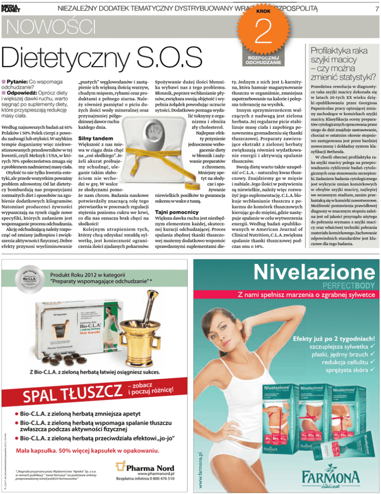 NIEZALEŻNY DODATEK TEMATYCZNY DYSTRYBUOWANY WRAZ ZKROK RZECZPOSPOLITĄ NOWOŚCI Dietetyczny S.O.S ■ Pytanie: Co wspomaga odchudzanie? ■ Odpowiedź: Oprócz diety i większej dawki ruchu, warto sięgnąć po suplementy diety, które przyspieszają redukcję masy ciała. Według najnowszych badań aż 61% Polaków i 50% Polek cierpi z powodu nadwagi lub otyłości.W szybkim tempie doganiamy więc niekwestionowanych przodowników w tej kwestii, czyli Meksyk i USA, w których 70% społeczeństwa zmaga się z problemem nadmiernej masy ciała. Otyłość to nie tylko kwestia estetyki,ale przede wszystkim poważny problem zdrowotny. Od lat dietetycy bombardują nas propozycjami rozmaitych diet i sposobów na zgubienie dodatkowych kilogramów. Natomiast producenci żywności wypuszczają na rynek ciągle nowe specyfiki, których zadaniem jest wspomaganie procesu odchudzania. Akcję odchudzającą należy rozpocząć od zmiany jadłospisu i zwiększenia aktywności fizycznej. Dobre efekty przynosi wyeliminowanie „pustych” węglowodanów i zastąpienie ich większą ilością warzyw, chudym mięsem, rybami oraz produktami z pełnego ziarna. Należy również pamiętać o piciu dużych ilości wody mineralnej oraz przynajmniej półgodzinnej dawce ruchu każdego dnia. Silny tandem Większość z nas miewa w ciągu dnia chęć na „coś słodkiego”. Jeżeli akurat próbujemy schudnąć, uleganie takim słabościom nie wchodzi w grę. W walce ze słodyczami pomoże nam chrom. Badania naukowe potwierdziły znaczącą rolę tego pierwiastka w procesach regulacji stężenia poziomu cukru we krwi, co dla nas oznacza brak chęci na słodkości! Kolejnym utrapieniem tych, którzy chcą odzyskać smukłą sylwetkę, jest konieczność ograniczenia ilości zjadanych pokarmów. Spożywanie dużej ilości błonnika wybawi nas z tego problemu. Błonnik, poprzez wchłanianie płynów, zwiększa swoją objętość i wypełnia żołądek powodując uczucie sytości. Dodatkowo pomaga wydalić toksyny z organizmu i obniża zły cholesterol. Najlepsze efekty przyniesie jednoczesne wzbogacenie diety w błonnik i zażywanie preparatów z chromem. Mniejszy apetyt na słodycze i spożywanie niewielkich posiłków to gwarancja sukcesu w walce z tuszą. Tajni pomocnicy Większa dawka ruchu jest niezbędnym elementem każdej, skutecznej kuracji odchudzającej. Proces spalania zbędnej tkanki tłuszczowej możemy dodatkowo wspomóc sprawdzonymi suplementami die- Produkt Roku 2012 w kategorii ”Preparaty wspomagające odchudzanie” * Z Bio-C.L.A. z zieloną herbatą łatwiej osiągniesz sukces. PL_CLA+T_Ad_ZdrowieKobietyRzeczpospolita_0512_123x160 SpAL tłuSZCZ – zobacz i poczuj różnicę! • Bio-C.L.A. z zieloną herbatą zmniejsza apetyt • Bio-C.L.A. z zieloną herbatą wspomaga spalanie tłuszczu zwłaszcza podczas aktywności fizycznej • Bio-C.L.A. z zieloną herbatą przeciwdziała efektowi „jo-jo” Mała kapsułka. 50% więcej kapsułek w opakowaniu. *„Nagroda przyznana przez Wydawnictwo “Apteka” Sp. z o.o. w ramach publikacji “ świat farmacji” na podstawie ankiety przeprowadzonej wśród polskich farmaceutów.” www.pharmanord.pl Bezpłatna infolinia 0 800 476 510 2 ROZPOCZNIJ ODCHUDZANIE ty. Jednym z nich jest L-karnityna, która hamuje magazynowanie tłuszczu w organiźmie, zmniejsza zapotrzebowanie na kalorie i polepsza tolerancję na wysiłek. Innym sprzymierzeńcem walczących z nadwagą jest zielona herbata. Jej regularne picie stabilizuje masę ciała i zapobiega ponownemu gromadzeniu się tkanki tłuszczowej. Preparaty zawierające ekstrakt z zielonej herbaty zwiększają również wydatkowanie energii i aktywują spalanie tłuszczów. Swoją dietę warto także uzupełnić o C.L.A. – naturalny kwas tłuszczowy. Znajdziemy go w mięsie i nabiale. Jego ilości w pożywieniu są niewielkie, należy więc rozważyć jego suplementację. C.L.A. blokuje wchłanianie tłuszczu z pokarmu do komórek tłuszczowych kierując go do mięśni, gdzie następuje spalanie w celu wytworzenia energii. Według badań opublikowanych w American Journal of Clinical Nutrition, C.L.A. zwiększa spalanie tkanki tłuszczowej podczas snu o 14%. 7 Profilaktyka raka szyjki macicy – czy można zmienić statystyki? Prawdziwa rewolucja w diagnostyce raka szyjki macicy dokonała się w latach 20-tych XX wieku dzięki opublikowaniu przez Georgiosa Papanicolau pracy opisującej zmiany zachodzące w komórkach szyjki macicy. Klasyfikacja oceny preparatów cytologicznych opracowana przez niego do dziś znajduje zastosowanie, chociaż w ostatnim okresie stopniowo zastępowana jest przez bardziej nowoczesny i dokładny system klasyfikacji Bethesda. W chwili obecnej profilaktyka raka szyjki macicy polega na przeprowadzaniu cyklicznie badań cytologicznych oraz stosowaniu szczepionki. Zadaniem badania cytologicznego jest wykrycie zmian komórkowych w obrębie szyjki macicy, najlepiej we wczesnym stadium, zanim przekształcą się w komórki nowotworowe. Możliwość postawienia prawidłowej diagnozy w znacznym stopniu zależna jest od jakości przyrządu użytego do pobrania wymazu z szyjki macicy oraz właściwej techniki pobrania materiału komórkowego.Zachowanie odpowiednich standardów jest kluczowe dla tego badania.
