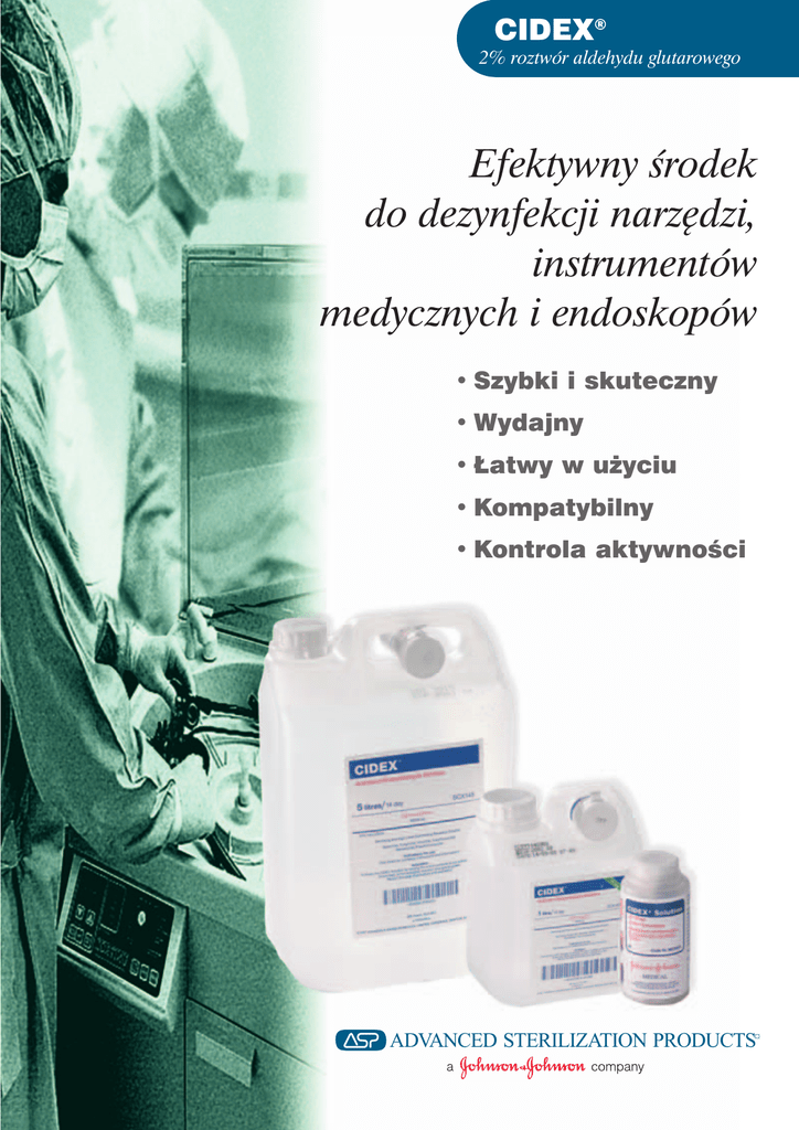 CIDEX® 2% roztwór aldehydu glutarowego Efektywny Êrodek do dezynfekcji narz´dzi, instrumentów medycznych i endoskopów • Szybki i skuteczny • Wydajny • ¸atwy w u˝yciu • Kompatybilny • Kontrola aktywnoÊci ADVANCED STERILIZATION PRODUCTS¤ CIDEX® Solutions 2% Liquid roztwówDisinfectant aldehydu glutarowego Szybki i skuteczny Êrodek do dezynfekcji narz´dzi, instrumentów medycznych i endoskopów CIDEX jest 2% roztworem aldehydu glutarowego przeznaczonym do dezynfekcji wysokiego stopnia. Mo˝e byç stosowany wsz´dzie tam, gdzie sterylizacja termiczna jest niemo˝liwa. CIDEX jest niezwykle skutecznym i szybkim preparatem. Ju˝ w ciàgu 20 min. likwiduje bakterie, grzyby, wirusy (HBV, HIV) i pràtki gruêlicy. Dzia∏anie sporobójcze w roztworze CIDEX wymaga moczenia sprz´tu medycznego przez 10 godzin. Wydajny Roztwór CIDEX-u zachowuje skutecznoÊç dzia∏ania w ciàgu 14 dni od momentu aktywacji. W tym czasie mo˝liwa jest wielokrotna dezynfekcja endoskopów i innych instrumentów medycznych. ¸atwy w u˝yciu CIDEX jest preparatem wyjàtkowo prostym w przygotowaniu. Nale˝y wsypaç zawartoÊç za∏àczonego aktywatora do pojemnika z CIDEX-em i potrzàsnàç. Roztwór zabarwi si´ na zielono i jest gotowy do u˝ycia. Kompatybilny z endoskopami i innymi urzàdzeniami medycznymi Na podstawie przeprowadzonych badaƒ stwierdzono, ˝e CIDEX mo˝e byç stosowany do dezynfekcji narz´dzi, sprz´tu medycznego i endoskopów produkowanych m.in. przez: •Olympus •Pentax •Acuson •Karl Storz Niezwyk∏a kompatybilnoÊç roztworu CIDEX z materia∏ami stosowanymi w konstrukcji endoskopów zapewnia pe∏ne bezpieczeƒstwo tym delikatnym narz´dziom. Nie wykazano tak˝e negatywnego wp∏ywu Êrodka na: •Metale •Tworzywa sztuczne •Elastomery •Szk∏o •Kleje •Materia∏y stomatologiczne Dane techniczne • Przygotowanie roztworu Wsypaç zawartoÊç aktywatora do pojemnika z Cidexem i potrzàsnàç. Preparat zabarwi si´ na zielono. Jest aktywny i gotowy do u˝ytku. • St´˝enie substancji czynnej 2% roztwór aldehydu glutarowego • Przeznaczenie Dezynfekcja wysokiego stopnia • Okres przydatnoÊci do u˝ycia 14 dni po sprawdzeniu aktywnoÊci testami paskowymi Cidex Test Strip • Okres przechowywania 2 lata • Gospodarka odpadami Usuwaç zgodnie z obowiàzujàcymi przepisami Kontrola aktywnoÊci CIDEX zachowuje w∏aÊciwoÊci dezynfekujàce przez 14 dni. Do kontroli aktywnoÊci roztworu nale˝y u˝ywaç testów paskowych. Zmiana zabarwienia wskaênika na kolor malinowy Êwiadczy o aktywnoÊci preparatu. Produkt Kod Jednostka sprzeda˝y CIDEX MCX006 4 x 1 litr CIDEX MCX007 4 x 5 litrów SMC001 12 x 60 sztuk TEST PASKOWY ® Trademark ADVANCED STERILIZATION PRODUCTS¤ Johnson & Johnson Poland Sp. z o.o. ul. Szyszkowa 20, 02-285 Warszawa tel. (022) 668 00 00 fax (022) 668 00 01 Dzia∏ Obs∏ugi Klienta: tel. (022) 668 00 07, fax (022) 668 00 15; e-mail: [email protected] Dzia∏ Marketingu: tel. (022) 668 00 63, fax (022) 668 00 55
