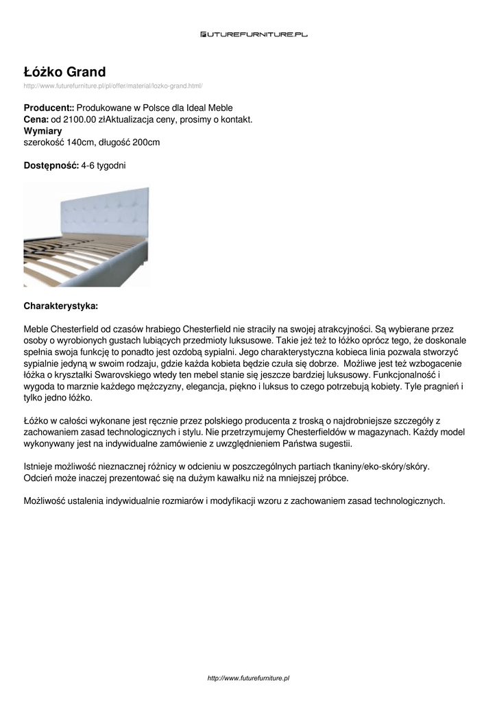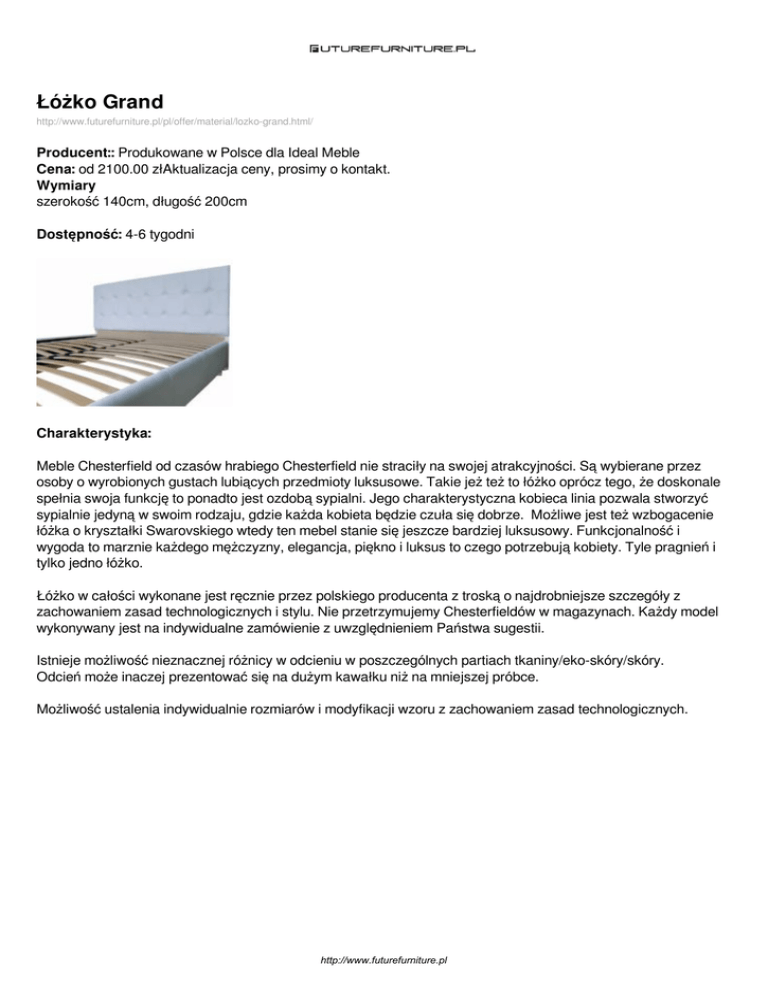 Łóżko Grand http://www.futurefurniture.pl/pl/offer/material/lozko-grand.html/ Producent:: Produkowane w Polsce dla Ideal Meble Cena: od 2100.00 złAktualizacja ceny, prosimy o kontakt. Wymiary szerokość 140cm, długość 200cm Dostępność: 4-6 tygodni Charakterystyka: Meble Chesterfield od czasów hrabiego Chesterfield nie straciły na swojej atrakcyjności. Są wybierane przez osoby o wyrobionych gustach lubiących przedmioty luksusowe. Takie jeż też to łóżko oprócz tego, że doskonale spełnia swoja funkcję to ponadto jest ozdobą sypialni. Jego charakterystyczna kobieca linia pozwala stworzyć sypialnie jedyną w swoim rodzaju, gdzie każda kobieta będzie czuła się dobrze. Możliwe jest też wzbogacenie łóżka o kryształki Swarovskiego wtedy ten mebel stanie się jeszcze bardziej luksusowy. Funkcjonalność i wygoda to marznie każdego mężczyzny, elegancja, piękno i luksus to czego potrzebują kobiety. Tyle pragnień i tylko jedno łóżko. Łóżko w całości wykonane jest ręcznie przez polskiego producenta z troską o najdrobniejsze szczegóły z zachowaniem zasad technologicznych i stylu. Nie przetrzymujemy Chesterfieldów w magazynach. Każdy model wykonywany jest na indywidualne zamówienie z uwzględnieniem Państwa sugestii. Istnieje możliwość nieznacznej różnicy w odcieniu w poszczególnych partiach tkaniny/eko-skóry/skóry. Odcień może inaczej prezentować się na dużym kawałku niż na mniejszej próbce. Możliwość ustalenia indywidualnie rozmiarów i modyfikacji wzoru z zachowaniem zasad technologicznych. http://www.futurefurniture.pl Dostępne wersje produktu: nazwa produktu Łóżko Grand 140cmx200cm warianty skóra Madras cena 2100.00zł dostępne Na zamówienie Łóżko Grand 140cmx200cm podnoszony stelaż 3450.00zł Na zamówienie Łóżko Grand 140cmx200cm podnoszony stelaż i pojemnik na pościel 4240.00zł Na zamówienie Łóżko Grand 140cmx200cm kryształki Swarovskiego 3100.00zł Na zamówienie Łóżko Grand 160cmx200cm skóra Madras 2300.00zł Na zamówienie Łóżko Grand 160cmx200cm podnoszony stelaż 3650.00zł Na zamówienie Łóżko Grand 160cmx200cm podnoszony stelaż i pojemnik na pościel 4440.00zł Na zamówienie Łóżko Grand 160cmx200cm kryształki Swarovskiego 3550.00zł Na zamówienie Łóżko Grand 180cmx200cm skóra Madras 2500.00zł Na zamówienie Łóżko Grand 180cmx200cm podnoszony stelaż 3850.00zł Na zamówienie Łóżko Grand 180cmx200cm podnoszony stelaż i pojemnik na pościel 4640.00zł Na zamówienie Łóżko Grand 180cmx200cm kryształki Swarovskiego 4000.00zł Na zamówienie Łóżko Grand 200cmx200cm skóra Madras 2700.00zł Na zamówienie Łóżko Grand 200cmx200cm podnoszony stelaż 4050.00zł Na zamówienie Łóżko Grand 200cmx200cm podnoszony stelaż i pojemnik na pościel 4840.00zł Na zamówienie Łóżko Grand 200cmx200cm kryształki Swarovskiego 4450.00zł Na zamówienie http://www.futurefurniture.pl Zdjęcia produktu: http://www.futurefurniture.pl Powered by TCPDF (www.tcpdf.org)
