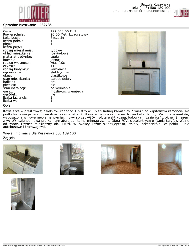Urszula Kuszyńska tel.: (+48) 500 189 100 email: [email protected] Sprzedaż Mieszkanie - 032738 Cena: Powierzchnia: Lokalizacja: liczba pokoi: piętro: liczba pięter: rodzaj mieszkania: układ mieszkania: materiał budynku: kuchnia: rodzaj własności: czynsz: rodzaj budynku: ogrzewanie: okna: stan mieszkania: balkon: piwnica: stan instalacji: garaż: ogródek: liczba łazienek: liczba wc: Opis 127 000,00 PLN 20,00 Metr kwadratowy Szczecin 1 1 3 typowe rozkładowe cegła jasna; własność 110 kamienica elektryczne plastikowe; bardzo dobry brak nie po wymianie możliwość wynajęcia nie 1 1 Kawalerka w prestiżowej dzielnicy- Pogodno.1 pietro w 3 pietr ładnej kamienicy. Świeżo po kapitalnym remoncie. Na podłodze nowe panele, nowe drzwi z ościeżnicami. Nowa armatura sanitarna. Nowe kafle, lampy. Kuchnia w aneksie, wyposażona w nowe meble na wymiar, nowy sprzęt AGD- , płyta elektryczna, lodówka. . Łazienka( z oknem) razem z wc .W łazience nowa pralka i armatura sanitarna minn.prysznic. Okna PCV, c.o.elektryczne (tania taryfa). Wolne od zaraz. Czynsz miesięczny ok. 110zł. W okolicy liczne sklepy,apteka, szkoły, przedszkola. W pobliżu linie autobusowe i tramwajowe. Wiecej informacji Ula Kuszyńska 500 189 100 Zdjęcia Dokument wygenerowany przez eKomako Makler Nieruchomości Data wydruku: 2017-03-08 14:05