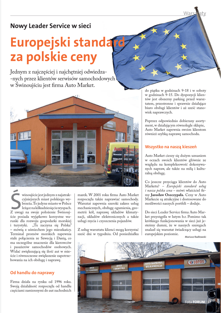 Warsztaty Nowy Leader Service w sieci Europejski standard za polskie ceny Jednym z najczęściej i najchętniej odwiedza-nych przez klientów serwisów samochodowych w Świnoujściu jest firma Auto Market. do piątku w godzinach 9-18 i w soboty w godzinach 9-15. Do dyspozycji klientów jest obszerny parking przed warsztatem, przestronne i sprawnie działające biuro obsługi klientów i aż sześć stanowisk naprawczych. Poprzez odpowiednio dobierany asortyment, w działającym równolegle sklepie, Auto Market zapewnia swoim klientom również szybką naprawę samochodu. Wszystko na naszą kieszeń Auto Market cieszy się dużym uznaniem w oczach swoich klientów głównie ze względu na kompleksowość dokonywanych napraw, ale także na miłą i kulturalną obsługę. Ś winoujście jest jednym z najatrakcyjniejszych miast polskiego wybrzeża. To jedyne miasto w Polsce leżące na kilkudziesięciu wyspach. Z uwagi na swoje położenie Świnoujście posiada wyjątkowo korzystne warunki dla rozwoju gospodarki morskiej i turystyki. „Tu zaczyna się Polska” – mówią z uśmiechem jego mieszkańcy. Terminal promów morskich zapewnia stałe połączenia ze Szwecją i Danią, co ma szczególne znaczenie dla kierowców i pasażerów samochodów osobowych. Widać zwiększającą się ilość aut w mieście i równoczesne zwiększenie zapotrzebowania na ich obsługę i naprawę. marek. W 2001 roku firma Auto Market rozpoczęła także naprawiać samochody. Warsztat zapewnia szeroki zakres usług mechanicznych, obsługę ogumienia, geometrii kół, naprawę układów klimatyzacji, układów elektronicznych a także usługi mycia i czyszczenia pojazdów. Z usług warsztatu klienci mogą korzystać sześć dni w tygodniu. Od poniedziałku Co jeszcze przyciąga klientów do Auto Marketu? – Europejski standard usług i nasza polska cena – mówi właściciel firmy Jarosław Oszczypała. Ceny w Auto Markecie są atrakcyjne i dostosowane do możliwości naszych portfeli – dodaje. Do sieci Leader Service firma Auto Market przystąpiła w lutym b.r. Pomimo tak krótkiego funkcjonowania w sieci już jesteśmy dumni, że w naszych szeregach znalazł się warsztat świadczący usługi na europejskim poziomie. Mariusz Radôowski Od handlu do naprawy Firma działa na rynku od 1996 roku. Swoją działalność rozpoczęła od handlu częściami zamiennymi do aut zachodnich Fota FORUM 17