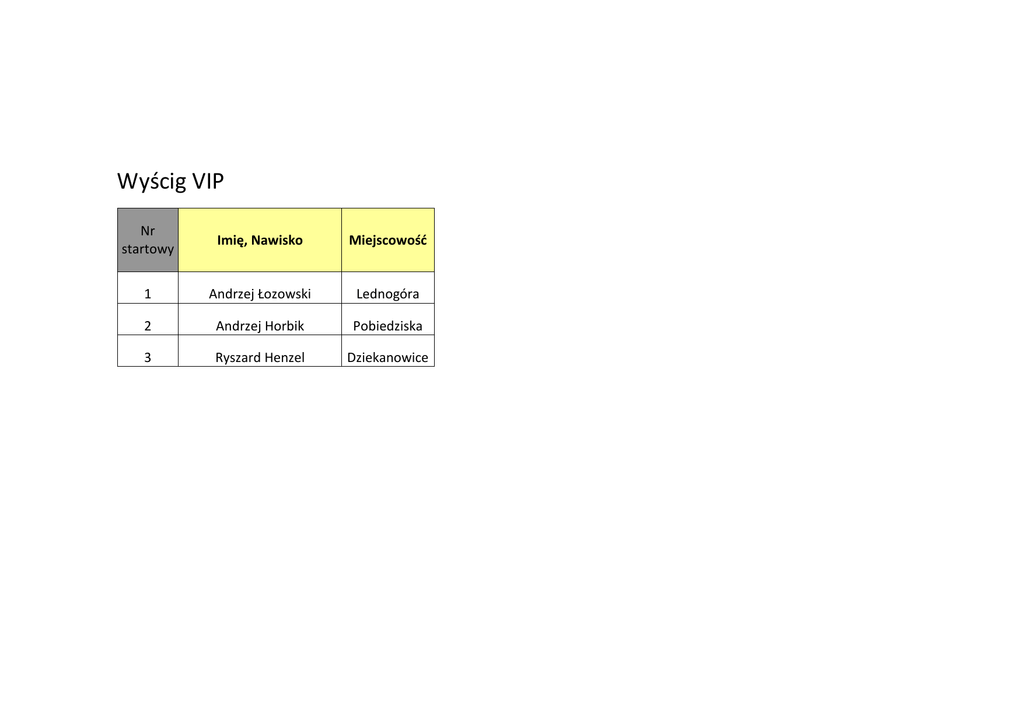 Wyścig VIP Nr startowy Imię, Nawisko Miejscowość 1 Andrzej Łozowski Lednogóra 2 Andrzej Horbik Pobiedziska 3 Ryszard Henzel Dziekanowice Dystans 200 m stylem dowolnym dziewcząt i chłopców Nr startowy Imię, Nawisko Miejscowość Płeć Kategoria wiekowa Czas Miejsce w wyścigu Miejsce w kat 15 Adam Oszutowski Gniezno M 12-14 lat 2:05,95 1 1 8 Jan Kuls Inowrocław M 12-14 lat 2:10,23 2 2 12 Mateusz Rotter Kamionki M 12-14 lat 2:22,67 3 3 2 Marcelina Szymańska Gniezno K 12-14 lat 2:27,43 4 1 5 Wiktor Jakiel Bydgoszcz M 12-14 lat 2:35,63 5 4 14 Jakub Wilkosz Gniezno M 12-14 lat 2:45,14 6 5 3 Agata Szymańska Gniezno K 9-11 lat 2:48,72 7 1 11 Mateusz Majewski Czerwonak M 12-14 lat 3:00,15 8 6 4 Oliwia Janiszewska Czerniejewo K 12-14 lat 3:02,63 9 2 7 Paweł Kozanecki Poznań M 9-11 lat 3:04,78 10 1 10 Michał Majewski Czerwonak M 12-14 lat 3:07,53 11 7 13 Adam Wilkosz Gniezno M 9-11 lat 3:15,20 12 2 16 Bartosz Pieniak Dąbrówka M 9-11 lat 3:38,33 13 3 9 Karolina Świętek Czerwonak K 9-11 lat 4:16,33 14 2 6 Filip Szczyrba Koziegłowy M 9-11 lat 5:28,03 15 4 1 Zofia Żuchowska Gniezno K 9-11 lat 6:35,05 16 3 Sztafeta sołecka Nr startowy Miejscowość Miejsce w wyścigu Sztafeta w składzie 1 Imielno Zofia Pakuza, Zbigniew Reczek, Mateusz Skwarek,Mateusz Pietrucki 1 2 Imielenko Adam Budniak, Adam Kazimierczyk, Hanna Pieśniewska, Marek Kazimierczyk 2 500m żabka Nr startowy 2 10 3 7 12 1 4 6 9 8 5 11 Imię, Nazwisko Katarzyna Kozanecka Jakub Rusztyk Aleksander Sęczkowski Wojciech Dmytrow Paweł Kania Piotr Kowalski Wojciech Niewitecka Marzena Kaczmarska Marzena Strzyżewska Zenon Broński Dominik Latała Barbara Ociepka Miejscowość Poznań Inowrocław Koziegłowy Poznań Poznań Gniezno Poznań Gniezno Poznań Pobiedziska Łubowo Poznań Płeć Czas Miejsce w wyścigu K M M M M M M K K M M K 08:20:38 1 1 08:26:35 2 1 08:35:43 3 2 09:16:78 4 3 10:16:57 5 4 10:45:56 6 5 11:01:56 7 6 11:11:23 8 2 12:56:09 9 3 13:52:47 10 7 14:10:24 11 8 16:15:55 12 4 Miejsce w kat Dystans 1500 m stylem dowolnym 13-24 lat Nr startowy 7 2 5 6 1 3 4 Imię, Nawisko Michał Czech Bartosz Urbański Weronika Nowicka Weronika Strzyżewska Norbert Baranowski Natalia Świętek Stefan Cieślewicz Miejscowość Gniezno Szczytniki Poznań Poznań Pobiedziska Czerwonak Mosina Płeć M M K K M M M Kategoria wiekowa Czas Miejsce w wyścigu Miejsce w kat 19:58:90 1 1 20:26:95 2 2 21:53:35 3 1 22:25:02 4 2 23:14:48 5 3 26:23:61 6 4 33:52:17 7 5 Dystans 1500 m stylem dowolnym od 25 lat Nr startowy 2 17 12 13 14 19 7 5 10 15 3 16 1 9 8 4 18 20 11 6 Imię, Nawisko Tomasz Szczyrba Beata Silska Ewa Szała Stefan Skrzypek Michał Musielak Damian Kolwicz Emilia Kowalska Zygmunt Lewandowski Blanka Zarzeczańska Janasik Michał Ołdakowski Aneta Ludwiczak Rojewska Paulina Kaczmarek Andrzej Urbanik Marcin Wielechowski Sylwia Woźniak Karol Ziókowski Krzysztof Gorynia Lucjan Prządo Teresa Zarzeczańska Marek Zawłocki Miejscowość Płeć Kategoria wiekowa Czas Miejsce w wyścigu Miejsce w kat Koziegłowy Luboń Koziegłowy Wrocław Poznań Gdańsk Poznań Inowrocław M K K M M M K M 45-54 lat roczniki 1962-1971 22:37:55 1 1 25-34 lat roczniki 1982-1991 22:59:21 2 1 55-64 lat roczniki 1952-1961 23:01:99 3 1 55-64 lat roczniki 1952-1961 24:25:94 4 1 35-44 lat roczniki 1972-1981 25:10:38 5 1 25-34 lat roczniki 1982-1991 25:55:97 6 1 25-34 lat roczniki 1982-1991 26:30:43 7 2 75-84 lat roczniki 1932-1941 26:50:84 8 1 Poznań Gruszczyn Drempt (NL) Obora Kraków Złotniki Mieleszyn Poznań Poznań Warszawa Janikowo Poznań K M 25-34 lat roczniki 1982-1991 26:56:43 9 3 35-44 lat roczniki 1972-1981 27:47:91 10 2 K K M M K M M M K M 45-54 lat roczniki 1962-1971 29:37:37 11 1 35-44 lat roczniki 1972-1981 29:42:75 12 1 35-44 lat roczniki 1972-1981 30:37:46 13 3 25-34 lat roczniki 1982-1991 31:55:00 14 2 25-34 lat roczniki 1982-1991 34:34:81 15 4 65-74 lat roczniki 1942-1951 35:32:38 16 1 35-44 lat roczniki 1972-1981 35:43:93 17 4 85-94 lat roczniki 1922-1931 36:01:20 18 1 65-74 lat roczniki 1942-1951 37:23:44 19 1 65-74 lat roczniki 1942-1951 40:34:35 20 2