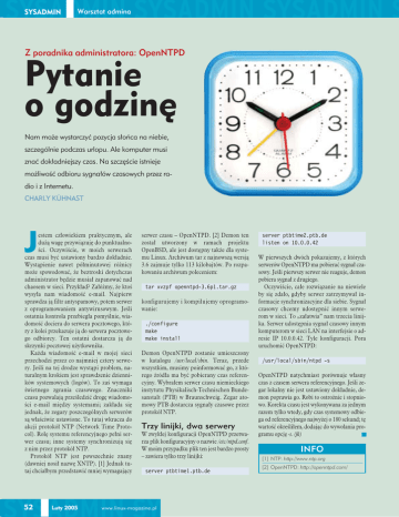 SYSADMIN Warsztat admina Z poradnika administratora: OpenNTPD Pytanie o godzinę Nam może wystarczyć pozycja słońca na niebie, szczególnie podczas urlopu. Ale komputer musi znać dokładniejszy czas. Na szczęście istnieje możliwość odbioru sygnałów czasowych przez radio i z Internetu. CHARLY KÜHNAST J estem człowiekiem praktycznym, ale dużą wagę przywiązuję do punktualności. Oczywiście, w moich serwerach czas musi być ustawiony bardzo dokładnie. Wystąpienie nawet półminutowej różnicy może spowodować, że beztroski dotychczas administrator będzie musiał zapanować nad chaosem w sieci. Przykład? Załóżmy, że ktoś wysyła nam wiadomość e-mail. Najpierw sprawdza ją filtr antyspamowy, potem serwer z oprogramowaniem antywirusowym. Jeśli ostatnia kontrola przebiegła pomyślnie, wiadomość dociera do serwera pocztowego, który z kolei przekazuje ją do serwera pocztowego odbiorcy. Ten ostatni dostarcza ją do skrzynki pocztowej użytkownika. Każda wiadomość e-mail w mojej sieci przechodzi przez co najmniej cztery serwery. Jeśli na tej drodze wystąpi problem, naturalnym krokiem jest sprawdzenie dzienników systemowych (logów). To zaś wymaga świetnego zgrania czasowego. Znaczniki czasu pozwalają prześledzić drogę wiadomości e-mail między systemami; zakłada się jednak, że zegary poszczególnych serwerów są właściwie ustawione. To tutaj wkracza do akcji protokół NTP (Network Time Protocol). Rolę systemu referencyjnego pełni serwer czasu; inne systemy synchronizują się z nim przez protokół NTP. Protokół NTP jest powszechnie znany (dawniej nosił nazwę XNTP). [1] Jednak tutaj chciałbym przedstawić mniej wymagający 52 Luty 2005 serwer czasu – OpenNTPD. [2] Demon ten został utworzony w ramach projektu OpenBSD, ale jest dostępny także dla systemu Linux. Archiwum tar z najnowszą wersją 3.6 zajmuje tylko 113 kilobajtów. Po rozpakowaniu archiwum poleceniem: tar xvzpf openntpd-3.6p1.tar.gz konfigurujemy i kompilujemy oprogramowanie: ./configure make make install Demon OpenNTPD zostanie umieszczony w katalogu /usr/local/sbin. Teraz, przede wszystkim, musimy poinformować go, z którego źródła ma być pobierany czas referencyjny. Wybrałem serwer czasu niemieckiego instytutu Physikalisch-Technischen Bundesanstalt (PTB) w Braunschweig. Zegar atomowy PTB dostarcza sygnały czasowe przez protokół NTP. Trzy linijki, dwa serwery W zwykłej konfiguracji OpenNTPD przetwarza plik konfiguracyjny o nazwie /etc/ntpd.conf. W moim przypadku plik ten jest bardzo prosty – zawiera tylko trzy linijki: server ptbtime1.ptb.de www.linux-magazine.pl server ptbtime2.ptb.de listen on 10.0.0.42 W pierwszych dwóch pokazujemy, z których serwerów OpenNTPD ma pobierać sygnał czasowy. Jeśli pierwszy serwer nie reaguje, demon pobiera sygnał z drugiego. Oczywiście, całe rozwiązanie na niewiele by się zdało, gdyby serwer zatrzymywał informacje synchronizacyjne dla siebie. Sygnał czasowy chcemy udostępnić innym serwerom w sieci. To „załatwia” nam trzecia linijka. Serwer udostępnia sygnał czasowy innym komputerom w sieci LAN na interfejsie o adresie IP 10.0.0.42. Tyle konfiguracji. Pora uruchomić OpenNTPD: /usr/local/sbin/ntpd -s OpenNTPD natychmiast porównuje własny czas z czasem serwera referencyjnego. Jeśli zegar lokalny nie jest ustawiony dokładnie, demon poprawia go. Robi to ostrożnie i stopniowo. Korekta czasu jest wykonywana za jednym razem tylko wtedy, gdy czas systemowy odbiega od referencyjnego najwyżej o 180 sekund; tę wartość określiłem, dodając do wywołania programu opcję -s. (jk) ■ INFO [1] NTP: http://www.ntp.org [2] OpenNTPD: http://openntpd.com/