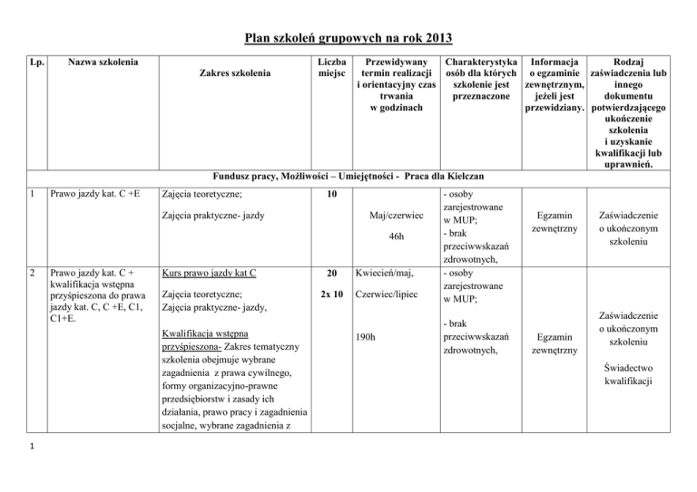 Plan szkoleń grupowych na rok 2013 Lp. 1 Nazwa szkolenia Prawo jazdy kat. C +E Liczba miejsc Przewidywany Charakterystyka Informacja Rodzaj Zakres szkolenia termin realizacji osób dla których o egzaminie zaświadczenia lub i orientacyjny czas szkolenie jest zewnętrznym, innego trwania przeznaczone jeżeli jest dokumentu w godzinach przewidziany. potwierdzającego ukończenie szkolenia i uzyskanie kwalifikacji lub uprawnień. Fundusz pracy, Możliwości – Umiejętności - Praca dla Kielczan Zajęcia teoretyczne; 10 Zajęcia praktyczne- jazdy Maj/czerwiec 46h 2 Prawo jazdy kat. C + kwalifikacja wstępna przyśpieszona do prawa jazdy kat. C, C +E, C1, C1+E. Kurs prawo jazdy kat C Zajęcia teoretyczne; Zajęcia praktyczne- jazdy, Kwalifikacja wstępna przyśpieszona- Zakres tematyczny szkolenia obejmuje wybrane zagadnienia z prawa cywilnego, formy organizacyjno-prawne przedsiębiorstw i zasady ich działania, prawo pracy i zagadnienia socjalne, wybrane zagadnienia z 1 20 Kwiecień/maj, 2x 10 Czerwiec/lipiec 190h - osoby zarejestrowane w MUP; - brak przeciwwskazań zdrowotnych, - osoby zarejestrowane w MUP; - brak przeciwwskazań zdrowotnych, Egzamin zewnętrzny Egzamin zewnętrzny Zaświadczenie o ukończonym szkoleniu Zaświadczenie o ukończonym szkoleniu Świadectwo kwalifikacji 3 4 2 prawa finansowego, organizacja i zarządzanie przedsiębiorstwem transportu samochodowego, warunki dopuszczenia do zawodu i rynku przewoźnika, bezpieczeństwo ruchu drogowego, organizacje społeczne i zawodowe związane z krajowym transportem. Kierowca wózków Typy stosowanych wózków jezdniowych jezdniowych. z napędem silnikowym Budowa wózka. z wymianą butli gazowej. Czynności operatora przy obsłudze wózków przed podjęciem pracy i po pracy z wózkami. Czynności operatora w czasie pracy z wózkami. Wiadomości z zakresu ładunkoznawstwa. Wiadomości z zakresu bhp. Praktyczna nauka jazdy i manewrowania osprzętem wózków. Szkolenie z zakresu bezpiecznej obsługi wymiany butli gazowych. Wiadomości o Dozorze Technicznych Spawanie blach i rur Zagadnienia z zakresu procesów spoinami pachwinowymi spawalniczych, technologia metali, metoda Mag 135-1, sposoby łączenia metali, czytanie Spawanie blach i rur i sporządzanie rysunku spoinami pachwinowymi technicznego, wady połączeń metodą TIG 141 -1. 20 Maj/kwiecień 2x10 lipiec 67h 15 Maj/czerwiec 248h - osoby zarejestrowane w MUP; Egzamin zewnętrzny Zaświadczenie kwalifikacyjneUDT - brak przeciwwskazań zdrowotnych - osoby zarejestrowane w MUP; - brak Zaświadczenie o ukończonym szkoleniu, Egzamin zewnętrzny Zaświadczenie o ukończonym szkoleniu przeciwwskazań zdrowotnych; spawanych i ich kontrola, podstawy spawania łukowego w osłonie gazów, technologia, urządzenia i materiały do spawania, technika i technologia spawania, zagadnienia z elektrotechniki, zajęcia praktyczne w zakresie spawania stali, przepisy BHP; 5 6 3 Operator koparkoładowarek w zakresie III kl. uprawnień Operator koparki kl. III Użytkowanie eksploatacyjne Dokumentacja techniczna Bezpieczeństwo i higiena pracy Podstawy elektrotechniki. Silniki spalinowe. Elementy hydrauliki Budowa koparko-ładowarki Technologia robót Zajęcia praktyczne Zakres kursu regulowany Rozporządzeniem Ministra Gospodarki z dnia 20.09.2001 r. w sprawie bezpieczeństwa i higieny pracy podczas eksploatacji maszyn i innych urządzeń technicznych do robót ziemnych, budowlanych i drogowych (Dz. U. nr 118, poz.1263) 24 Użytkowanie eksploatacyjne Dokumentacja techniczna Bezpieczeństwo i higiena pracy Podstawy elektrotechniki. Silniki spalinowe. 12 Książeczka spawacza Kwiecień/maj Czerwiec/lipiec 202h - osoby zarejestrowane w MUP; Egzamin zewnętrzny - brak przeciwwskazań zdrowotnych; Kwiecień/maj 202h - osoby zarejestrowane w MUP; - brak Zaświadczenie o ukończonym szkoleniu Książka operatora Egzamin zewnętrzny Zaświadczenie o ukończonym szkoleniu Książka operatora 7 8 4 Elementy hydrauliki Budowa koparki. Technologia robót Zajęcia praktyczne Zakres kursu regulowany Rozporządzeniem Ministra Gospodarki z dnia 20.09.2001 r. w sprawie bezpieczeństwa i higieny pracy podczas eksploatacji maszyn i innych urządzeń technicznych do robót ziemnych, budowlanych i drogowych (Dz. U. nr 118, poz.1263) Pracownik ochrony Blok ogólny - wprowadzenie 10 fizycznej II stopnia w specyfikę zawodu, przepisy regulujące wykonywanie zawodu; Blok prawny - wybrane zagadnienia prawa cywilnego, karnego i wykroczeń, procesowego oraz prawa pracy; Blok zawodowy - ochrona osób i ochrona mienia, konwojowanie; Zajęcia praktyczne - samoobrona, techniki interwencyjne, wyszkolenie strzeleckie. Kompleksowa obsługa I. Organizacja pracy biurowej 10 biura z modułem II Przepływ informacji w językowym (język zarządzaniu biurem. angielski st. podstawowy) III. Zasady efektywnej komunikacji IV. Podstawowe zagadnienia prawne V. Obsługa urządzeń biurowych i komputera: 1. Obsługa: telefaksu, kserokopiarki, drukarki, skanera; . Czerwiec/lipiec 360h Kwiecień/maj 160h przeciwwskazań zdrowotnych; -Osoby zarejestrowane w MUP; - posiadanie wykształcenia min. średniego; - uregulowany stosunek do służby wojskowej - nie karane, Egzamin wewnętrzny Osoby zarejestrowane w MUP; - posiadanie wykształcenia min. średniego, Egzamin wewnętrzny Zaświadczenie o ukończonym szkoleniu Zaświadczenie o ukończonym szkoleniu 9 10 5 Kompleksowa obsługa biura z modułem językowym (język angielski st. średniozaawansowany) Opiekun osób starszych, niepełnosprawnych z językiem niemieckim 2. Podstawy obsługi komputera 3. Microsoft Office Word – 4. Microsoft Office Excel 5. Środowisko internetowe, 6. Mój Internet: VI . Moduł językowy I. Organizacja pracy biurowej II Przepływ informacji w zarządzaniu biurem. III. Zasady efektywnej komunikacji IV. Podstawowe zagadnienia prawne V. Obsługa urządzeń biurowych i komputera: 1. Obsługa: telefaksu, kserokopiarki, drukarki, skanera; 2. Podstawy obsługi komputera 3