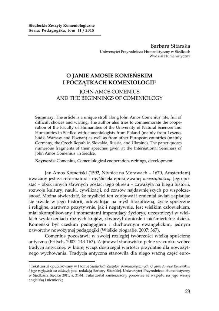 Siedleckie Zeszyty Komeniologiczne Seria: Pedagogika, tom II / 2015 Barbara Sitarska Uniwersytet Przyrodniczo-Humanistyczny w Siedlcach Wydział Humanistyczny O JANIE AMOSIE KOMEŃSKIM I POCZĄTKACH KOMENIOLOGII1 JOHN AMOS COMENIUS AND THE BEGINNINGS OF COMENIOLOGY Summary: The article is a unique stroll along John Amos Comenius' life, full of difficult choices and writing. The author also tries to commemorate the cooperation of the Faculty of Humanities of the University of Natural Sciences and Humanities in Siedlce with comeniologists from Poland (mainly from Leszno, Łódź, Warsaw and Poznań) as well as from other European countries (mainly Germany, the Czech Republic, Slovakia, Russia, and Ukraine). The paper quotes numerous fragments of their speeches given at the International Seminars of John Amos Comenius in Siedlce. Keywords: Comenius, Comeniological cooperation, writings, development Jan Amos Komeński (1592, Nivnice na Morawach – 1670, Amsterdam) uważany jest za reformatora i myśliciela epoki zwanej nowożytnością. Jego postać – obok innych sławnych postaci tego okresu – zaważyła na biegu historii, rozwoju kultury, nauki, cywilizacji, od czasów najdawniejszych po współczesność. Można stwierdzić, że myśliciel ten zdobywał i zmieniał świat, zapisując się trwale w jego historii, oddziałując na myśl filozoficzną, życie społeczne i religijne, zarówno pozytywnie, jak i negatywnie. Jest wielkim człowiekiem, miał skomplikowany i momentami imponujący życiorys; uczestniczył w wielkich wydarzeniach różnych krajów, stworzył doniosłe i nieśmiertelne dzieła. Komeński był czeskim pedagogiem i duchownym ewangelickim, jednym z twórców nowożytnej pedagogiki (Wielkie biografie, 2007: 367). Comenius pozostawił w swojej rozległej twórczości wielką spuściznę antyczną (Fritsch, 2007: 143-162). Zajmował stanowisko pełne szacunku wobec tradycji antycznej, w której wciąż dostrzegał wartości przydatne dla nowożytnego wychowania. Tradycja antyczna stanowiła dla niego ważną część euroTekst został opublikowany w I tomie Siedleckich Zeszytów Komeniologicznych: O Janie Amosie Komeńskim i jego poglądach na edukację pod redakcją Barbary Sitarskiej, Uniwersytet Przyrodniczo-Humanistyczny w Siedlcach, Siedlce 2015, s. 31-61. Tutaj został zamieszczony ponownie ze względu na jego wersję angielską i niemiecką. 1 23 Barbara Sitarska pejskiej tożsamości (Mikołajczak, 2010: 235). Comenius był myślicielem barokowym i ta jego „barokowość” (Beneš, 2007: 235-240) znajduje odzwierciedlenie w jego bogatej twórczości, nacechowanej przeciwieństwami, chaosem, labiryntami, emblematami i symboliką. Uwzględniając wszechstronność jego działań i twórczości, współczesne badania i zainteresowania jego osobą wskazują na wiele obszarów. Pojawiają się rozważania i interpretacje wokół Komeńskiego jako pedagoga, autora i wydawcy, naukowca, polityka i teologa (Kalinowski, 2012: 45-49). Uważany był jednocześnie za realistę, utopistę i idealistę (tamże: 48).Wokół jego osoby, jego działań i twórczości dawniej, jak i współcześnie pojawia się wiele kontrowersji (Dworzaczkowa, 1992: 11-22; Bieńkowski, 2000: 5-7; Bečková, 2010: 29-30). Jana Amosa Komeńskiego uważa się za wielkiego humanistę i prekursora uniwersalizmu (Łomny, 1992: 19). „Pozostał przede wszystkim teologiem, humanistą i pedagogiem. Badaczem natury, czystym racjonalistą i sensualistą po prostu nie był. Pozostał wierny teologicznej wizji świata i człowieka” (Fijałkowski, 2012: 356). Był działaczem społecznym i religijnym związanym z reformacją. Kształcił się w szkole Braci Czeskich w Strażnicach, a dokończył swoją edukację w Przerowie, gdzie później został nauczycielem, a następnie dyrektorem szkoły (Encyklopedia pedagogiczna XXI wieku, 2003: 534). Na poglądy i działalność Jana Amosa Komeńskiego miały wpływ odkrycia ówczesnej nauki i życie na pograniczu dwóch epok: kończącego się feudalizmu i rozpoczynającego się kapitalizmu. Stworzył system pedagogiczny przepojony duchem prawdziwego demokratyzmu, humanizmu, podmiotowości ucznia (Kunikowski, 2010: 181). W Encyklopedii PWN (2007) „Wielkie biografie” nazwisko Komeńskiego zostało umieszczone w I tomie, zatytułowanym: Przywódcy, reformatorzy, myśliciele. Charakteryzuje on życie i dokonania ludzi zdobywających i zmieniających świat, którzy zaważyli na jego historii, rozwoju myśli filozoficznej, życiu społecznym i religijnym. Publikacja ukazuje osiągnięcia ludzkości przez pryzmat życia i dorobku jej najsłynniejszych przedstawicieli. Wśród nich jest Jan Amos Komeński, czeski uczony, który kojarzy nam się z narodzinami nowożytnej pedagogiki (Wielkie biografie, 2007: 366-367). Komeński był wielkim Europejczykiem, człowiekiem światowym. Świadczą o tym jego liczne podróże po całej niemalże Europie, w tym po Polsce. Na owe czasy jego podróże do różnych krajów i miast, słynących z poszukiwań prawdy i kultu wiedzy, wydają nam się – nawet na początku XXI wieku − wciąż zdumiewające i zadziwiające, tak jak zadziwiający jest upór w pracy nad teoretycznym i praktycznym przygotowaniem do wychowania i nauczania człowieka (najprawdopodobniej wiążący się z postawą protestantów, szukających dróg dotarcia do umysłów i serc ludzkich). Wielkim osiągnięciem tego wybitnego czeskiego filozofa, pedagoga i teologa jest jego antropologia, którą należy badać pod kątem różnych dyscyplin, a co za tym idzie należy wziąć pod uwagę: antropologię przyrodniczą, społeczną, filozoficzną, biblijną i teologiczną (Mnich, 2010: 101). Trzeba pod- 24 O Janie Amosie Komeńskim i początkach komeniologii kreślić szeroko pojęty pedagogiczny charakter antropologii Komeńskiego. Nauka o człowieku u Komeńskiego staje się nauką o wychowaniu człowieka, a jego koncepcja człowieka jest koncepcją nieus
