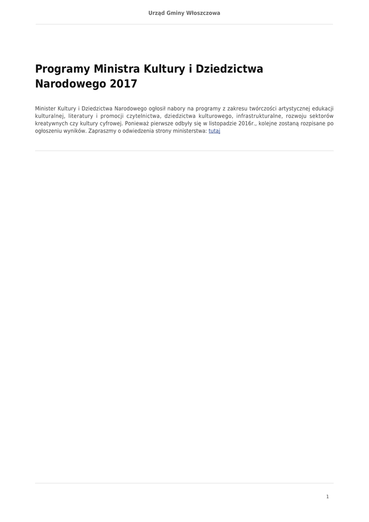Urząd Gminy Włoszczowa Programy Ministra Kultury i Dziedzictwa Narodowego 2017 Minister Kultury i Dziedzictwa Narodowego ogłosił nabory na programy z zakresu twórczości artystycznej edukacji kulturalnej, literatury i promocji czytelnictwa, dziedzictwa kulturowego, infrastrukturalne, rozwoju sektorów kreatywnych czy kultury cyfrowej. Ponieważ pierwsze odbyły się w listopadzie 2016r., kolejne zostaną rozpisane po ogłoszeniu wyników. Zapraszmy o odwiedzenia strony ministerstwa: tutaj 1