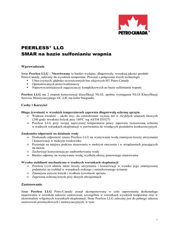 PEERLESS* LLG SMAR na bazie sulfonianiu wapnia Wprowadzenie Smar Peerless LLG – Niezrównany to bardzo wydajny, długotrwały, wysokiej jakości produkt Petro-Canady, zalecany do wysokich temperatur. Powstał z połączenia trzech technologii: Ultra-czystych, głęboko oczyszczonych baz olejowych HT Petro-Canady Opatentowanych przeciwutleniaczy Najnowocześniejszych zagęszczaczy kompleksowych na bazie sulfonianiu wapnia Peerless LLG ma 2 stopień konsystencji klasyfikacji NLGI, spełnia wymagania NLGI Klasyfikacji Serwisu Motoryzacyjnego GC-LB, ma kolor burgundu. Cechy i Korzyści Długa Ŝywotność w wysokich temperaturach zapewnia długotrwałą ochronę sprzętu • Większa trwałość – około trzy- do czterokrotnie wyŜsza niŜ w zwykłych smarach litowych (240 godz. trwałości łoŜysk przy 160ºC wg ASTM D3527) • Peerless LLG przy swojej najwyŜszej temperaturze pracy zapewnia rozszerzoną ochronę w trudnych warunkach eksploatacji w porównaniu do wiodących produktów konkurencyjnych Znakomita odporność na działanie wody • Doskonała odporność smaru Peerless LLG na wymywanie wodą zmniejsza koszty utrzymania i konserwacji w mokrym środowisku • Pozostaje na miejscu podczas stosowania w mokrym otoczeniu i w urządzeniach pracujących na morzu • Zachowuje konsystencję po zaabsorbowaniu wody • Bardzo odporny na wymywanie wodą, wydłuŜa okresy ponownego smarowania Wysoka stabilność mechaniczna w trudnych warunkach eksploatacji • Peerless LLG obniŜa takŜe koszty utrzymania i konserwacji w wyniku jego zmniejszonej podatności na rozkład w warunkach niskiego i umiarkowanego ścinania • Zmniejsza zuŜycie łoŜysk i wydłuŜa Ŝywotność sprzętu • Zapewnia ochronę łoŜysk przy duŜych obciąŜeniach Zastosowanie Smar Peerless LLG Petro-Canady został skomponowany w celu zapewnienia doskonałego smarowania w szerokim zakresie zastosowań, szczególnie w warunkach wysokich temperatur oraz w ekstremalnie wilgotnych warunkach eksploatacji. Smar Peerless LLG zalecany jest do pełnego zakresu zastosowań przemysłowych i motoryzacyjnych, w tym: 1 • • • • • • ogólne zastosowania przemysłowe przemysł celulozowo-papierniczy parki samochodów leśnictwo produkcja energii elektrycznej maszyny przemysłu spoŜywczego bez bezpośredniego kontaktu z Ŝywnością Peerless LLG Ulepszony wielozadaniowy smar kompleksowy na bazie sulfonianu wapnia posiada doskonałą odporność na utlenianie, ma bardzo dobrą odporność na działanie wody, zapewnia niezawodną ochronę przeciwkorozyjną oraz zdolność przenoszenia obciąŜeń w wysokich temperaturach pracy. Jest on szczególnie zalecany dla zastosowań do wysokich temperatur o długiej Ŝywotności, które obejmują: • Sprzęt pracujący w sposób ciągły w temperaturach do 200 oC oraz w ekstremalnie wilgotnych warunkach • ŁoŜyska piast kół oraz podwozia samochodowe • ŁoŜyska zamknięte (bez ponownego smarowania) • Przeguby uniwersalne równobieŜne (o stałej prędkości kątowej) • Piece, piece suszarnicze Typowe własności eksploatacyjne Właściwości Metoda Testu PEERLESS LGG D217 PCM 264 PCM 264 D 2265 D 217 2 GC-LB Burgund Gładki/Mazisty 314 284 D942 2,2 D445 D445 D 2596 95 10,8 500 D 2266 D 2509 D 4048 D 1264 0,45 27 1a 1,5 -20 do 200 Klasa konsystencji NLGI Klasa jakości NLGI Barwa Struktura Temperatura Kroplenia, ºC Wypracowana Penetracja 60 uderzeń Odporność na utlenianie 100 godzin, spadek psi Lepkość oleju bazowego cSt @ 40 ºC cSt @ 100 ºC Test aparatem 4-kulowym, obciąŜenie zespawania, kg Test aparatem 4-kulowym, średnica skazy, mm, Timken obciąŜenie nieniszczące, kg Korozja Miedzi Wymywanie Wodą %@79ºC ZakresTemperatur Pracy, ºC Podane wyŜej wartości są typowe dla normalnej produkcji. Nie stanowią one specyfikacji. Informacje na temat danych technicznych Informacje na temat danych technicznych smarów Peerless LLG lub innych produktów z asortymentu profesjonalnych środków smarowych Petro-Canada: Lubricants Head Office Petro-Canada 2310 Lakeshore Road West Mississauga, Ontario Canada L5J 1K2 Dystrybutor: VARIANT S.A. ul. Czerwieńskiego 3B 31-319 Kraków Tel.: 012 636 99 44 Canada West ……….Tel. 1-800-661-1199 Fax: 012 637 26 78 Internet: www.petro-canada.com www.variant.pl Niniejsze tłumaczenie oryginalnego dokumentu nie zostało wykonane przez firmę Petro-Canada. 2