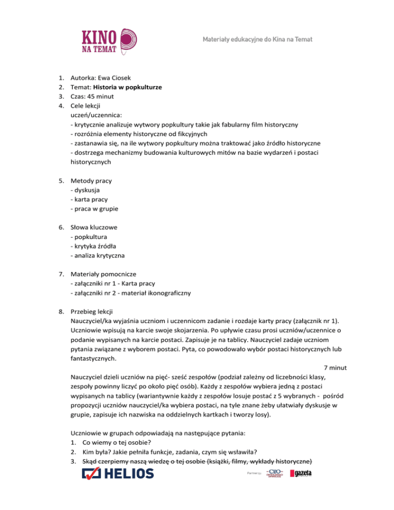 1. 2. 3. 4. Autorka: Ewa Ciosek Temat: Historia w popkulturze Czas: 45 minut Cele lekcji uczeń/uczennica: - krytycznie analizuje wytwory popkultury takie jak fabularny film historyczny - rozróżnia elementy historyczne od fikcyjnych - zastanawia się, na ile wytwory popkultury można traktować jako źródło historyczne - dostrzega mechanizmy budowania kulturowych mitów na bazie wydarzeń i postaci historycznych 5. Metody pracy - dyskusja - karta pracy - praca w grupie 6. Słowa kluczowe - popkultura - krytyka źródła - analiza krytyczna 7. Materiały pomocnicze - załączniki nr 1 - Karta pracy - załączniki nr 2 - materiał ikonograficzny 8. Przebieg lekcji Nauczyciel/ka wyjaśnia uczniom i uczennicom zadanie i rozdaje karty pracy (załącznik nr 1). Uczniowie wpisują na karcie swoje skojarzenia. Po upływie czasu prosi uczniów/uczennice o podanie wypisanych na karcie postaci. Zapisuje je na tablicy. Nauczyciel zadaje uczniom pytania związane z wyborem postaci. Pyta, co powodowało wybór postaci historycznych lub fantastycznych. 7 minut Nauczyciel dzieli uczniów na pięć- sześć zespołów (podział zależny od liczebności klasy, zespoły powinny liczyć po około pięć osób). Każdy z zespołów wybiera jedną z postaci wypisanych na tablicy (wariantywnie każdy z zespołów losuje postać z 5 wybranych - pośród propozycji uczniów nauczyciel/ka wybiera postaci, na tyle znane żeby ułatwiały dyskusje w grupie, zapisuje ich nazwiska na oddzielnych kartkach i tworzy losy). Uczniowie w grupach odpowiadają na następujące pytania: 1. Co wiemy o tej osobie? 2. Kim była? Jakie pełniła funkcje, zadania, czym się wsławiła? 3. Skąd czerpiemy naszą wiedzę o tej osobie (książki, filmy, wykłady historyczne) 4. Jakie cechy charakteru przypisywane są tej osobie? 5. Co wpłynęło i wpływa na dzisiejszy wizerunek wybranej postaci? 12 minut Grupy prezentują swoją pracę. Nauczyciel podsumowuje i uzupełnia prezentację grup. 10 minut Nauczyciel/ka pokazuje trzy fotografie (albo na rzutniku multimedialnym, albo wydrukowane w rozmiarze A4- załącznik 2). Na zdjęciach znajdują się twarze Adolfa Hitlera, Józefa Stalina i Che Guevary. (W razie potrzeby nauczyciel/ka opowiada krótko kim są postaci ze zdjęć). Nauczyciel/k zadaje pytanie. Dlaczego tak wielu ludzi w Polsce nosi koszulki z Che Guevarą, a nie spotyka się raczej pozostałych dwóch postaci? Nauczyciel/ka podsumowuje dyskusję, zwraca uwagę na uwarunkowania historyczne oraz zasięg terytorialny zbrodni poszczególnych przywódców. Przypomina uczniom i uczennicom, że często postaci historyczne mają bardzo mocno wykreowany wizerunek, nie zawsze zgodny z prawdą. (Nauczyciel/ka może zaznaczyć, że ciekawym pomysłem mogłoby być prześledzenie komu i dla czego zależy na danym wizerunku, ale nie jest to tematem tych konkretnie zajęć). 10 minut Nauczyciel/ka w rozmowie nauczającej zwraca uwagę uczniom i uczennicom na znaczenie kultury masowej jako nośnika wiedzy i tradycji historycznej. Zauważa, że popkultura bardzo często spłaszcza postaci, tworzy z nich wzorce, kalki a nie przedstawia ich jako żywych ludzi z ich dylematami i rozterkami. Nauczyciel/ka przypomina uczniom, że praca historyków, mediewistów i starożytników skupia się na badaniu często bardzo niekompletnych materiałów źródłowych. Z poszczególnych regionów w rękach badaczy są jedynie strzępy kronik, wierszy czy malowideł. Na ich podstawie starają się odtworzyć wydarzenia, postawy i poglądy ówczesnych mieszkańców regionu. Nauczyciel/ka poleca uczniom opracowanie własnych pięciu zasad, ułatwiających dotarcie do jak najdokładniejszych i najpewniejszych źródeł historii. Zasady powinny być konkretne, zwracać uwagę na największe zagrożenia. 6 minut 9. Praca domowa Opracuj pięć zasad ułatwiających poruszanie się w gąszczu popkultury i jej mitów. Gdzie szukać informacji? Jak je weryfikować? Jak odczytywać schematy, którymi się posługuje? (Zasady powinny być konkretne, sformułowane jak najbardziej klarownie; np. wiadomości biograficzne zawsze sprawdzam w kilku źródłach). Lekcja 2 1. Temat: Powstańcem się jest, staje się czy się bywa? 2. Czas: 45 minut 3. Cele lekcji Uczeń/uczennica: - uczy się krytycznej analizy dzieła filmowego - poznaje i rozważa motywy, dla których młodzi ludzie wzięli udział w powstaniu - ćwiczy umiejętność prowadzenia dyskusji 4. Metody pracy - dyskusja - karta pracy - praca w grupie 5. Słowa kluczowe -powstanie warszawskie -powstaniec -bohater 6. Materiały pomocnicze - karta pracy 7. Uwagi Lekcja powinna być poprzedzona wspólnym obejrzeniem przez klasę filmu „Miasto 44”. Nauczyciel/ka prosi przed seansem, aby uczniowie przyjrzeli się motywacjom bohaterów i bohaterek. 8. Przebieg lekcji Nauczyciel/ka prosi uczniów i uczennice, żeby w parach stworzyli/ły definicję słowa „powstaniec”. Następnie wyznacza 2-3 osoby do jej odczytania. Podsumowuje i uzupełnia zaproponowaną przez uczniów definicję. 8 minut Na podstawie wybranej postaci z filmu „Miasto 44” uczniowie uzupełniają kartę pracy. 15 minut Nauczyciel/ka prosi uczniów i uczennice o podanie imion postaci z filmu, które wybrali/ły. Prosi o dobranie się w grupy osoby, które wybrały tę samą postać. Stworzone w ten sposób zespoły porównują swoje odpowiedzi, wspierają się w czasie dyskusji. Nauczyciel musi zadbać, aby grupy były w miarę równe. 5 minut Uczniowie i uczennice prezentują wybrane postaci, a następnie nauczyciel/ka rozpoczyna i moderuje dyskusję na temat tego czy powstańcem się jest, bywa się nim czy się nim staje. 12 minut Nauczyciel/ka podsumowuje pracę uczniów. Prosi wybrane osoby o odczytanie pracy domowej. Podkreśla znaczenie krytycznego i mądrego czerpania z popkultury, która może nas rozwijać i inspirować. 4 minuty