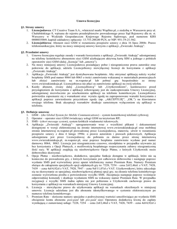 Umowa licencyjna §1. Strony umowy 1. Licencjodawca: CT Creative Team S.A., właściciel marki WapSter.pl, z siedzibą w Warszawie przy ul. Chałubińskiego 8, wpisana do rejestru przedsiębiorców prowadzonego przez Sąd Rejonowy dla m. st. Warszawy w Wydziale Gospodarczym Krajowego Rejestru Sądowego, pod numerem KRS 0000035069, kapitał zakładowy opłacony: 13.753.200,00 PLN, nr NIP: 951-19-21-562. 2. Licencjobiorca: Abonent sieci GSM w rozumieniu przepisów ustawy z dnia 16 lipca 2004r. Prawo telekomunikacyjne, który na mocy niniejszej umowy korzysta z aplikacji „Zwierzaki Atakują”. §2. Przedmiot umowy 1. Umowa licencyjna reguluje zasady i warunki korzystania z aplikacji „Zwierzaki Atakują” udostępnianej na telefony komórkowe abonentom sieci GSM użytkującym aktywną kartę SIM u jednego z polskich operatorów sieci GSM (dalej „licencja” lub „umowa”). 2. Na mocy niniejszej umowy Licencjodawca posiadający pełne i nieograniczone prawa autorskie oraz pokrewne do aplikacji, udziela Licencjobiorcy niewyłącznej licencji do korzystania z aplikacji „Zwierzaki Atakują”. 3. Aplikacja „Zwierzaki Atakują” jest dystrybuowana bezpłatnie. Aby otrzymać aplikację należy wysłać bezpłatny SMS pod numer 8064 lub 8063 o treści zamówienia wskazanej w materiałach promocyjnych lub złożyć zamówienie na m.wapster.pl lub pobrać grę bezpośrednio ze strony www.zwierzakiatakuja.pl. Licencjobiorca nie płaci za zamówienie aplikacji na swój telefon. 4. Każdy abonent, zwany dalej „Licencjobiorcą” lub „Użytkownikiem”, każdorazowo przed przystąpieniem do korzystania z aplikacji zobowiązany jest do zaakceptowania Umowy Licencyjnej, udostępnianej niezwłocznie po uruchomieniu aplikacji na telefonie komórkowym. Licencjobiorca potwierdza zapoznanie się z warunkami oraz wyraża zgodę na zaproponowane warunki korzystania z aplikacji poprzez zatwierdzenie przyciskiem zgody (np. „AKCEPTUJĘ”, „OK.”) na klawiaturze swojego telefonu. Brak akceptacji warunków skutkuje samoistnym wyłączeniem się aplikacji w telefonie. §3. Definicje umowne 1. GSM – (the Global System for Mobile Communications) – system komórkowej telefonii cyfrowej; 2. Operator – operator sieci GSM świadczący usługi GSM na terytorium RP; 3. SMS - (short message system), system krótkich wiadomości tekstowych; 4. Aplikacja „Zwierzaki Atakują”– oprogramowanie wraz z wszelkimi plikami i dokumentami dostępnymi w wersji elektronicznej na stronie internetowej www.zwierzakiatakuja.pl oraz mobilnej stronie internetowej m.wapster.pl prowadzonej przez Licencjodawcę, stanowią utwór w rozumieniu przepisów ustawy z dnia 4 lutego 1994r. o prawie autorskim i prawach pokrewnych. Aplikacja udostępniana jest przez Licencjodawcę do pobrania za darmo przez stronę internetową www.zwierzakiatakuja.pl, m.wapster.pl, oraz poprzez bezpłatne zamówienie wysłane pod numer darmowy 8064, 8063. Licencja jest nieograniczona czasowo, nieodpłatna w przypadku używania jej bez korzystania z Opcji Płatnych, z możliwością bezpłatnego rozpoczynania zabawy nieograniczoną ilość razy. W aplikacji znajdują się nieobowiązkowe Opcje Płatne, z których Użytkownik może dobrowolnie skorzystać. 5. Opcje Płatne - nieobowiązkowe, dodatkowe, specjalne funkcje dostępne w aplikacji, które nie są konieczne do prowadzenia gry, z których korzystanie jest całkowicie dobrowolne i następuje poprzez wysłanie SMS pod wyświetlony przez aparat telefoniczny numer Premium Rate. Numery Premium służące do zakupienia specjalnych opcji odpłatnych gry to: 7228, 7254 – cena 2zł/2,46zł. z VAT; 7428, 7439 – cena 4zł/4,92zł z VAT, 7928, 7947 – cena 9zł/11,07zł z VAT. Użytkownikowi, który zdecyduje się na skorzystanie ze specjalnej, nieobowiązkowej płatnej opcji gry, na ekranie telefonu komórkowego zostanie wyświetlona prośba o potwierdzenie wysyłki SMS. Akceptacja następuje poprzez wciśnięcie odpowiedniej komendy i skutkuje wysłaniem SMS na wskazany numer Premium Rate. W przypadku rezygnacji z wysyłki SMS żadna opłata nie jest pobierana a Użytkownik zachowuje prawo do korzystania z aplikacji na warunkach niniejszej Umowy Licencyjnej. 6. Licencja – niewyłączne prawo do użytkowania aplikacji na warunkach określonych w niniejszej umowie. Licencja udzielana jest dla abonenta identyfikowanego w systemie elektronicznym po numerze telefonu komórkowego. 7. Premium Rate – skrócone numery specjalne o podwyższonej wartości umożliwiające po wysłaniu SMS obciążenie konta abonenta post-paid lub pre-paid sieci Operatora dodatkową kwotą do zapłaty wynikającą z zamawianej usługi: 7228, 7254 – cena 2zł/2,46zł z VAT, 7428, 7439 – cena 4zł/4,92zł z 8. 9. VAT , 7928, 7947 – cena 9zł/11,07zł z VAT. Numery Premium Rate 7254, 7439, 7947 działają tylko w sieci Polkomtel S.A. Numer bezpłatny – numery 8064 i 8063 służące do bezpłatnego zamawiania aplikacji. Numer 8063 działa tylko w sieci Polkomtel S.A. link WAP – link do strony WAP, z którą należy się połączyć w celu pobrania aplikacji. Koszt transferu danych (połączenie z WAP) jest zależny od aktualnych stawek Operatora GSM. §4. Opis i warunki korzystania z aplikacji 1. „Zwierzaki Atakują" to interaktywna gra zręcznościowa dedykowana na telefony komórkowe, udostępniana nieodpłatnie. Użytkownik może prowadzić grę bezpłatnie z tym, że czas na wykonanie zadań jest ograniczony oraz limitowan jest ilość szans. W przypadku utracenia wszystkich szans, na dowolnym etapie zabawy, aby bezpłatnie kontynuować korzystanie z aplikacji, Użytkownik powinien ponownie rozpocząć grę. Licencjobiorca może rozpocząć grę bezpłatnie dowolną ilość razy. 2. Zadaniem gracza jest wyeliminowanie wszystkich znajdujących się na planszy niedźwiedzi oraz zniszczenie jak największej ilości, klocków.. Szczegółowe zasady (etapy) gry oraz dostępne Opcje Płatne, do dobrowolnego
