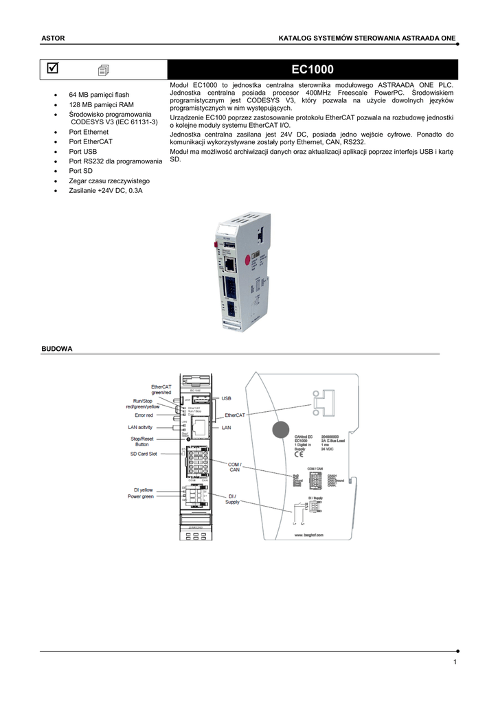 KATALOG SYSTEMÓW STEROWANIA ASTRAADA ONE ASTOR 64 MB pamięci flash 128 MB pamięci RAM Środowisko programowania CODESYS V3 (IEC 61131-3) Port Ethernet Port EtherCAT Port USB Port RS232 dla programowania Port SD Zegar czasu rzeczywistego Zasilanie +24V DC, 0.3A EC1000 Moduł EC1000 to jednostka centralna sterownika modułowego ASTRAADA ONE PLC. Jednostka centralna posiada procesor 400MHz Freescale PowerPC. Środowiskiem programistycznym jest CODESYS V3, który pozwala na użycie dowolnych języków programistycznych w nim występujących. Urządzenie EC100 poprzez zastosowanie protokołu EtherCAT pozwala na rozbudowę jednostki o kolejne moduły systemu EtherCAT I/O. Jednostka centralna zasilana jest 24V DC, posiada jedno wejście cyfrowe. Ponadto do komunikacji wykorzystywane zostały porty Ethernet, CAN, RS232. Moduł ma możliwość archiwizacji danych oraz aktualizacji aplikacji poprzez interfejs USB i kartę SD. BUDOWA 1 KATALOG SYSTEMÓW STEROWANIA ASTRAADA ONE ASTOR PARAMETRY Dane urządzenia Nazwa ECC2250 1131 Numer katalogowy 204900101 Rozszerzenie I/O Tak CPU, pamięć CPU Freescale PowerPC 400 MHz jeden rdzeń Pamięć Flash 64 MB Pamięć RAM 128 MB Pamięć zachowywana 24 kB Wymiary i waga Wymiary 25 x 120 x 90 mm Waga ~150 g Warunki użytkowe Zakres temp 0…+50 °C Wilgotność max 85% Transport i przechowywanie Zakres temp -20 ... +70 °C Wilgotność max 85% Obsługa Montaż Szyna DIN 35 x 7.5mm EN 60715:2001 Certyfikacja EN 61010-2-201, EN 61131-3 Środowisko programistyczne CODESYS V3 (IEC 61131-3) Zabezpieczenia Klasa 3 Stopień IP20 Wpływ i odporność na interferencje EN 61000-6-2, EN 61000-6-4, dla zastosowań przemysłowych Zasilanie Napięcie +24V DC Pobór prądu Max. 0.3A, przy rozszerzeniu o kolejne moduły max. 2.5A Zabezpieczenie przez zmianą polaryzacji Tak Interfejs Ethernet Liczba/typ 1x 10/100 Base T System połączenia RJ45 Interfejs EtherCAT Liczba/typ 1x EtherCAT E-bus System połączenia Połączenie 10 pin z prawej strony modułu Interfejs USB Liczba/typ 1x host USB 2.0/USB plug port A Liczba cykli max 1000 Interfejs CAN bus Liczba/typ 1x CAN bus Prędkość transmisji/ izolacja ISO 11898 maz. 1 Mbit/s / Tak 2 KATALOG SYSTEMÓW STEROWANIA ASTRAADA ONE ASTOR Interfejs szeregowy Liczba/typ 1x RS232 trójprzewodowe połączenie do złącza 2x 5 pin na przedniej części urządzenia Moduł komunikacyjny EC-COM(opcjonalnie) 1x LAN, 1x CAN, 1x RS485 / 1x RS232 Dodatkowe funkcje Zegar czasu rzeczywistego Tak, z baterią podtrzymującą Slot kart microSD 1x SD Wejścia cyfrowe 24 V Bateria Typ Panasonic VL2020 lub podobna Przechowywanie 2 lata bez napięcia 3 KATALOG SYSTEMÓW STEROWANIA ASTRAADA ONE ASTOR DIAGNOSTYKA DZIAŁANIA URZĄDZENIA Zasilanie wtyczka X1 Power LED Znaczenie PWR (zielony) ON = zasilanie dostarczone do urządzenia jest poprawne Przycisk RUN/STOP Akcja Komenda Faza rozruchu Przyciśnięcie Zmiana w tryb obsługi CODESYS PLC/CP1131-P Szybkie przyciśnięcie Zmiana pomiędzy trybem RUN i STOP PLC Przyciśnięcie z przytrzymaniem Zatrzymanie PLC z resetem zmiennych Status systemu LED RUN/STOP LED ERROR PPP tryb konfiguracji aktywny Żółty Off Aktywny pakiet uaktualnień USB Żółty, miga Off Error systemu Off On RUN Zielony Off STOP Czerwony Off Stop error Czerwony On Zarejestrowano przycisk reset Czerwony, miga Off Statusy PLC Reset konfiguracji: 1 wyłączyć zasilanie 2 przytrzymać przycisk STOP/RESET i włączyć zasilanie 3 puścić przycisk STOP/RESET po pojawianiu się sygnału żółto-czerwonego na diodzie 2 4 KATALOG SYSTEMÓW STEROWANIA ASTRAADA ONE ASTOR INSTALACJA URZĄDZENIA Montaż: Umieścić urządzenie na szynie DIN, tak aby zaczepy objęły dolną krawędź szyny (1) Docisnąć urządzenie do powierzchni DIN, tak aby sprężynowe zaczepy objęły szynę (2) Montaż urządzenia Montaż urządzenia Demontaż: Nacisnąć przycisk do odblokowania modułu (Unlock button) Podciągnąć moduł do góry, tak by odsunąć sprężynowe zaczepy (1) Odciągnąć górną część modułu od szyny (2) Zdjąć moduł poprzez popchnięcie go do dołu (3) BLOKOWY DIAGRAM OBWODÓW 5 KATALOG SYSTEMÓW STEROWANIA ASTRAADA ONE ASTOR ZASILANIE Zewnętrzne źródło zasilania (24V DC) Napięcie zasilające +24 V DC SELV (-15% / +20%), poziom napięcia zasilającego nie może spaść poniżej 20.4V Pobór prądu Całkowity max 0.3A Czas przełączenia w tryb błędu zasilania 10 ms, przy zasilaniu < 20.4V DC Zasilanie wtyczka X1 Sposób podłączenia Pin Oznaczenie Opis 1 DI Wejście cyfrowe 24V DC 2 L+ Zewnętrzne zasilanie 24V DC 3 L- Zewnętrzne GND INTERFEJS ETHERNET Oznaczenie złącza interfejsu Ethernet Pin Oznaczenie Pin Oznaczenie 1 TX+ 5 75 Ω 2 TX- 6 RX- 3 RX+ 7 75 Ω 4 75 Ω 8 75 Ω Sygnalizacja LED LED Kolor Znaczenie dla IEEE 802.3 paragraf 25 LNK/RCV Żółty Światło ciągle: odbieranie danych Miganie: połączenie aktywne; trwa transmisja danych Off: brak ustalonego połączenia SPEED Zielony On = 100Mbit/s Off = 10 Mbit/s INTERFEJS EtherCAT Interfejs EtherCAT w kontrolerze EC1000 wykorzystywany jest do podłączenia modułów rozszerzeń z systemu EtherCAT I/O. Max. ilość modułów jaką można podłączyć do jednostki centralnej wynosi 10 (jednak istnieje możliwość rozbudowy o kolejne moduły, wykorzystując moduł Buscoupler i Extender) EtherCAT Status LED, sygnalizacja Znaczenie Init Czerwony, ciągły Stan inicjalizacji, brak wymiany danych Pre-OP Czerwony/zielony, 3:1 Stan przedoperacyjny, brak wymiany danych Safe-Op Czerwony/zielony, 3:1 Bezpieczny stan operacyjny, wejścia mogą być odczytane Op Zielony, ciągły Status operacyjny, całkowita wymiana danych 6 KATALOG SYSTEMÓW STEROWANIA ASTRAADA ONE ASTOR INTERFEJS USB Urządzenia z interfejsem USB mogą być podłączone do portu USB (2.0). Wykorzystanie portu USB: Użytkownik CODESYS: tylko pamięć USB Poziom Linux: pamięć USB lub mysz Oznaczenie złącza interfejsu USB Pin Oznaczenie Pin Oznaczenie B1 VCC B3 D+ B2 D- B4 GND INTERFEJS CAN Bus i SZE
