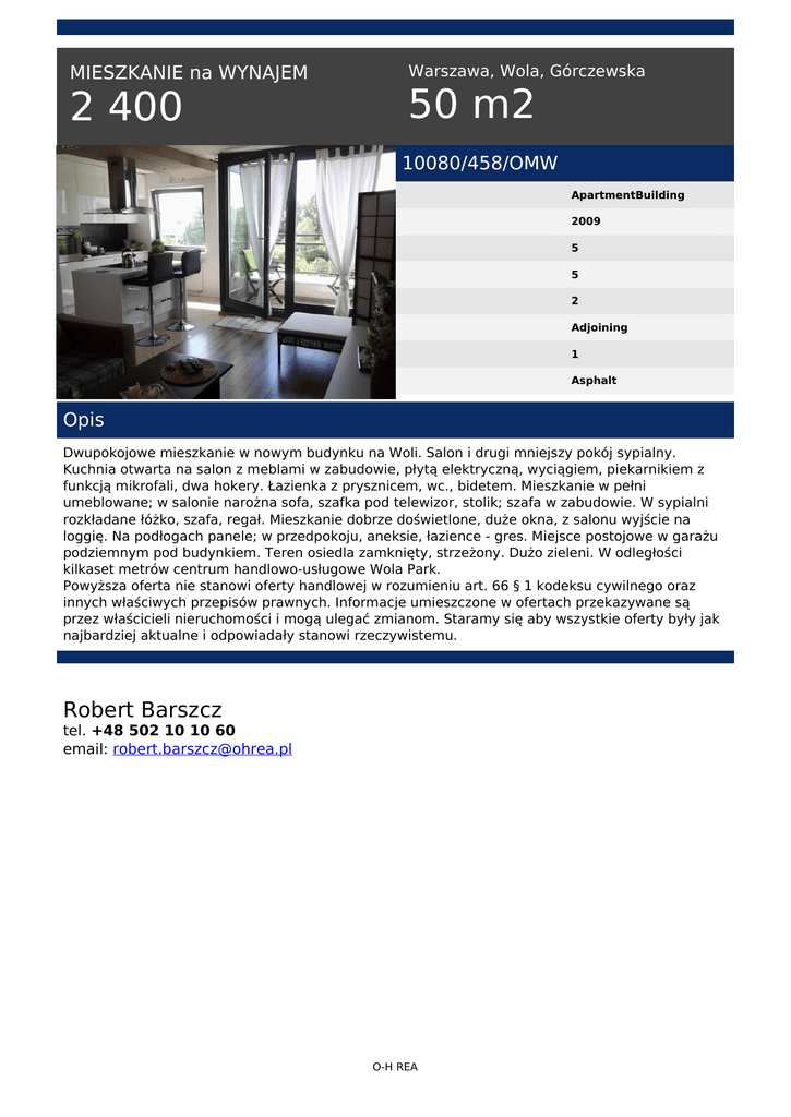 MIESZKANIE na WYNAJEM 2 400 Warszawa, Wola, Górczewska 50 m2 10080/458/OMW ApartmentBuilding 2009 5 5 2 Adjoining 1 Asphalt Opis Dwupokojowe mieszkanie w nowym budynku na Woli. Salon i drugi mniejszy pokój sypialny. Kuchnia otwarta na salon z meblami w zabudowie, płytą elektryczną, wyciągiem, piekarnikiem z funkcją mikrofali, dwa hokery. Łazienka z prysznicem, wc., bidetem. Mieszkanie w pełni umeblowane; w salonie narożna sofa, szafka pod telewizor, stolik; szafa w zabudowie. W sypialni rozkładane łóżko, szafa, regał. Mieszkanie dobrze doświetlone, duże okna, z salonu wyjście na loggię. Na podłogach panele; w przedpokoju, aneksie, łazience - gres. Miejsce postojowe w garażu podziemnym pod budynkiem. Teren osiedla zamknięty, strzeżony. Dużo zieleni. W odległości kilkaset metrów centrum handlowo-usługowe Wola Park. Powyższa oferta nie stanowi oferty handlowej w rozumieniu art. 66 § 1 kodeksu cywilnego oraz innych właściwych przepisów prawnych. Informacje umieszczone w ofertach przekazywane są przez właścicieli nieruchomości i mogą ulegać zmianom. Staramy się aby wszystkie oferty były jak najbardziej aktualne i odpowiadały stanowi rzeczywistemu. Robert Barszcz tel. +48 502 10 10 60 email: [email protected] O-H REA Powered by TCPDF (www.tcpdf.org)