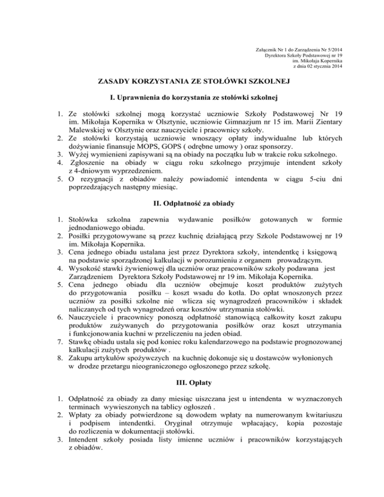 Załącznik Nr 1 do Zarządzenia Nr 5/2014 Dyrektora Szkoły Podstawowej nr 19 im. Mikołaja Kopernika z dnia 02 stycznia 2014 ZASADY KORZYSTANIA ZE STOŁÓWKI SZKOLNEJ I. Uprawnienia do korzystania ze stołówki szkolnej 1. Ze stołówki szkolnej mogą korzystać uczniowie Szkoły Podstawowej Nr 19 im. Mikołaja Kopernika w Olsztynie, uczniowie Gimnazjum nr 15 im. Marii Zientary Malewskiej w Olsztynie oraz nauczyciele i pracownicy szkoły. 2. Ze stołówki korzystają uczniowie wnoszący opłaty indywidualne lub których dożywianie finansuje MOPS, GOPS ( odrębne umowy ) oraz sponsorzy. 3. Wyżej wymienieni zapisywani są na obiady na początku lub w trakcie roku szkolnego. 4. Zgłoszenie na obiady w ciągu roku szkolnego przyjmuje intendent szkoły z 4-dniowym wyprzedzeniem. 5. O rezygnacji z obiadów należy powiadomić intendenta w ciągu 5-ciu dni poprzedzających następny miesiąc. II. Odpłatność za obiady 1. Stołówka szkolna zapewnia wydawanie posiłków gotowanych w formie jednodaniowego obiadu. 2. Posiłki przygotowywane są przez kuchnię działającą przy Szkole Podstawowej nr 19 im. Mikołaja Kopernika. 3. Cena jednego obiadu ustalana jest przez Dyrektora szkoły, intendentkę i księgową na podstawie sporządzonej kalkulacji w porozumieniu z organem prowadzącym. 4. Wysokość stawki żywieniowej dla uczniów oraz pracowników szkoły podawana jest Zarządzeniem Dyrektora Szkoły Podstawowej nr 19 im. Mikołaja Kopernika. 5. Cena jednego obiadu dla uczniów obejmuje koszt produktów zużytych do przygotowania posiłku – koszt wsadu do kotła. Do opłat wnoszonych przez uczniów za posiłki szkolne nie wlicza się wynagrodzeń pracowników i składek naliczanych od tych wynagrodzeń oraz kosztów utrzymania stołówki. 6. Nauczyciele i pracownicy ponoszą odpłatność stanowiącą całkowity koszt zakupu produktów zużywanych do przygotowania posiłków oraz koszt utrzymania i funkcjonowania kuchni w przeliczeniu na jeden obiad. 7. Stawkę obiadu ustala się pod koniec roku kalendarzowego na podstawie prognozowanej kalkulacji zużytych produktów . 8. Zakupu artykułów spożywczych na kuchnię dokonuje się u dostawców wyłonionych w drodze przetargu nieograniczonego ogłoszonego przez szkołę. III. Opłaty 1. Odpłatność za obiady za dany miesiąc uiszczana jest u intendenta w wyznaczonych terminach wywieszonych na tablicy ogłoszeń . 2. Wpłaty za obiady potwierdzone są dowodem wpłaty na numerowanym kwitariuszu i podpisem intendentki. Oryginał otrzymuje wpłacający, kopia pozostaje do rozliczenia w dokumentacji stołówki. 3. Intendent szkoły posiada listy imienne uczniów i pracowników korzystających z obiadów. 4. Uczniowie Gimnazjum nr 15 im. Marii Zientary Malewskiej wpłaty za obiady uiszczają w sekretariacie gimnazjum. 5. Listy uczniów gimnazjum dostarczane są do intendenta szkoły do 5-tego każdego miesiąca ( odrębna umowa ) 6. Organ prowadzący szkołę może zwolnić rodziców albo ucznia z całości lub części opłat, o których mowa w ust.2: a) w przypadku szczególnie trudnej sytuacji materialnej rodziny; b) w szczególnie uzasadnionych przypadkach losowych. IV. ZWROTY ZA OBIADY 1. Odpis poniesionych kosztów może nastąpić z powodu choroby, wycieczki lub innych przyczyn losowych, jeżeli nieobecność ucznia zgłoszona jest w danym dniu do godz. 8.00. 2. Nieobecność może być zgłoszona w sekretariacie lub u intendenta osobiście, telefonicznie lub pisemnie. Tylko na tej podstawie powstała nadpłata może być zaliczona na poczet opłaty na następny miesiąc. 3. Odliczenie kwoty następuje z odpłatności w następnym miesiącu. Nieuzasadniona lub nie zgłoszona nieobecność na posiłku nie podlega zwrotowi kosztów. Uwaga ! w miesiącu czerwcu i grudniu odpisów za obiady dokonujemy do 15- tego dnia danego miesiąca w związku z zamknięciem roku szkolnego i budżetowego. V. WYDAWANIE POSIŁKÓW 1. Posiłki wydawane są w godzinach 11.00-14.00. 2. Przed wejściem na stołówkę wywieszony jest jadłospis dekadowy opracowany przez intendentkę, kucharkę i pomoc kuchenną na podstawie średnioważonej normy dla wszystkich grup wiekowych. 3. Posiłki przygotowywane są zgodnie z zasadami racjonalnego żywienia i kalkulacją kosztów. 4. Posiłki wydawane są zgodnie z wywieszonym na tablicach ogłoszeń Szkoły Podstawowej nr 19 im. Mikołaja Kopernika i Gimnazjum Nr 15 im. Marii Zientary Malewskiej harmonogramem godzin wydawania obiadów dla poszczególnych klas i świetlicy szkolnej. 5. Wydany obiad odnotowany jest przez intendentkę na liście imiennej uczniów. 6. Dzieci korzystające z obiadów, przebywające na świetlicy szkolnej, schodzą na obiad z opiekunem świetlicy. 7. Z obiadów mogą korzystać uczniowie przebywający na zwolnieniu lekarskim. Obiad wydawany jest w naczyniu jednorazowym, rodzinie ucznia która, ma dostarczyć obiad do domu. 8. Za spożyty obiad poza stołówką szkolną, szkoła nie odpowiada. 9. Obiady nie spożyte przez uczniów traktowane są jako odpady poprodukcyjne. VI. ZASADY ZACHOWANIA NA STOŁÓWCE SZKOLNEJ 1. Podczas spożywania obiadów na stołówce szkolnej obowiązują zasady kulturalnego zachowania. 2. Po spożyciu obiadu brudne naczynia należy odnieść w wyznaczone miejsce. 3. Nad bezpieczeństwem uczniów przebywających w czasie obiadu w jadalni czuwają wychowawcy świetlicy, pedagodzy i nauczyciele dyżurujący przy stołówce. 4. Podczas wydawania obiadów zabrania się pobytu w pomieszczeniu stołówki osobom nie spożywającym posiłku, w tym również rodzicom uczniów. 5. Uczniowie mogą zgłaszać propozycje dań do intendenta. 6. Zabrania się wnoszenia do stołówki szkolnej okryć wierzchnich i plecaków. Dyrektor Szkoły mgr Mariola Urszula Ogonowska