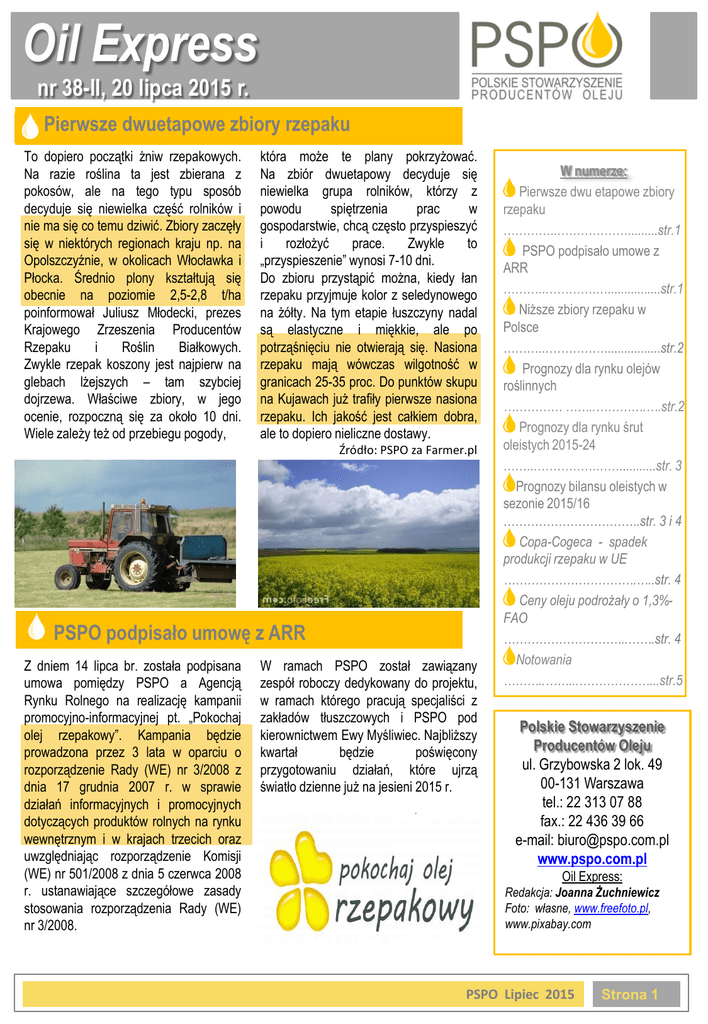 Oil Express nr 38-II, 20 lipca 2015 r. Pierwsze dwuetapowe zbiory rzepaku To dopiero początki żniw rzepakowych. Na razie roślina ta jest zbierana z pokosów, ale na tego typu sposób decyduje się niewielka część rolników i nie ma się co temu dziwić. Zbiory zaczęły się w niektórych regionach kraju np. na Opolszczyźnie, w okolicach Włocławka i Płocka. Średnio plony kształtują się obecnie na poziomie 2,5-2,8 t/ha poinformował Juliusz Młodecki, prezes Krajowego Zrzeszenia Producentów Rzepaku i Roślin Białkowych. Zwykle rzepak koszony jest najpierw na glebach lżejszych – tam szybciej dojrzewa. Właściwe zbiory, w jego ocenie, rozpoczną się za około 10 dni. Wiele zależy też od przebiegu pogody, która może te plany pokrzyżować. Na zbiór dwuetapowy decyduje się niewielka grupa rolników, którzy z powodu spiętrzenia prac w gospodarstwie, chcą często przyspieszyć i rozłożyć prace. Zwykle to „przyspieszenie” wynosi 7-10 dni. Do zbioru przystąpić można, kiedy łan rzepaku przyjmuje kolor z seledynowego na żółty. Na tym etapie łuszczyny nadal są elastyczne i miękkie, ale po potrząśnięciu nie otwierają się. Nasiona rzepaku mają wówczas wilgotność w granicach 25-35 proc. Do punktów skupu na Kujawach już trafiły pierwsze nasiona rzepaku. Ich jakość jest całkiem dobra, ale to dopiero nieliczne dostawy. Źródło: PSPO za Farmer.pl PSPO podpisało umowę z ARR Z dniem 14 lipca br. została podpisana umowa pomiędzy PSPO a Agencją Rynku Rolnego na realizację kampanii promocyjno-informacyjnej pt. „Pokochaj olej rzepakowy”. Kampania będzie prowadzona przez 3 lata w oparciu o rozporządzenie Rady (WE) nr 3/2008 z dnia 17 grudnia 2007 r. w sprawie działań informacyjnych i promocyjnych dotyczących produktów rolnych na rynku wewnętrznym i w krajach trzecich oraz uwzględniając rozporządzenie Komisji (WE) nr 501/2008 z dnia 5 czerwca 2008 r. ustanawiające szczegółowe zasady stosowania rozporządzenia Rady (WE) nr 3/2008. W ramach PSPO został zawiązany zespół roboczy dedykowany do projektu, w ramach którego pracują specjaliści z zakładów tłuszczowych i PSPO pod kierownictwem Ewy Myśliwiec. Najbliższy kwartał będzie poświęcony przygotowaniu działań, które ujrzą światło dzienne już na jesieni 2015 r. Źródło: PSPO W numerze: Pierwsze dwu etapowe zbiory rzepaku …………..……………….........str.1 PSPO podpisało umowe z ARR ………..………….…................str.1 Niższe zbiory rzepaku w Polsce ………..…………….................str.2 Prognozy dla rynku olejów roślinnych …………… ……..………….….str.2 Prognozy dla rynku śrut oleistych 2015-24 ……..…………….……...........str. 3 Prognozy bilansu oleistych w sezonie 2015/16 ……………………………..str. 3 i 4 Copa-Cogeca - spadek produkcji rzepaku w UE …………………………….…..str. 4 Ceny oleju podrożały o 1,3%FAO …………………………..…….str. 4 Notowania ………..……...………………...str.5 Polskie Stowarzyszenie Producentów Oleju ul. Grzybowska 2 lok. 49 00-131 Warszawa tel.: 22 313 07 88 fax.: 22 436 39 66 e-mail: [email protected] www.pspo.com.pl Oil Express: Redakcja: Joanna Żuchniewicz Foto: własne, www.freefoto.pl, www.pixabay.com PSPO Lipiec 2015 Strona 1 Oil Express nr 38-II, 20 lipca 2015 P Niższe zbory rzepaku w Polsce Tegoroczne zbiory rzepaku w Polsce zmaleją do 2,9 mln ton o 12,1 proc., w wyniku zmniejszenia areału uprawy do 0,9 mln ha (o 5,4 proc.) i plonów do 3,2 t/ha (o 7 proc.) wynika z oceny Instytutu Ekonomiki Rolnictwa i Gospodarki Żywnościowej. Z najnowszego Raportu rolnego przygotowanego przez naukowców z IERiGŻ wynika, że podaż rzepaku na rynku krajowym w sezonie 2015/2016 może być relatywnie wysoka, z uwagi na spodziewany spadek jego eksportu i niewielkie zmiany w imporcie. Przy utrzymującym się wysokim zapotrzebowaniu na olej rzepakowy ze strony sektora biopaliw, przerób rzepaku obniży się nieznacznie (o 4,4 proc. do 2,4 mln t). Zapasy rzepaku na koniec sezonu będą nadal niskie – informują dr Magdalena Bodył i dr Ewa Rosiak z Instytutu. Eksperci z IERiGŻ przewidują, że w III kwartale 2015 r. przeciętna cena skupu rzepaku wyniesie ok. 1400 zł/t i będzie o 10 proc. wyższa niż przed rokiem. Z kolei relacja cen rzepak/pszenica pozostanie korzystna dla producentów rzepaku. Jak sytuacja wygląda w krajach Unii Europejskiej? - Oil World szacuje, że zbiory rzepaku w UE-28 obniżą się w 2015 r. do 21,8 mln ton (o 10,5 proc.), w wyniku spadku plonów do 3,33 t/ha (o 8 proc.) oraz areału uprawy do 6,55 mln ha (o 3 proc.) – czytamy w najnowszym Raporcie rolnym. W grupie czterech kluczowych producentów najgłębszy spadek zbiorów rzepaku prognozowany jest w Niemczech do 5,1 mln ton (o 1 mln ton), następnie we Francji do 5,2 mln ton (o 0,3 mln ton), w Polsce do 2,9 mln ton (o 0,3 mln ton) i w Wielkiej Brytanii do 2,3 mln ton (o 0,2 mon ton). Z kolei mniejsze mogą być też zbiory w Czechach, Rumunii, Danii, Bułgarii, na Węgrzech i Słowacji. Źródło: PSPO za Farmer.pl Prognozy dla rynku olejów roślinnych Na początku lipca br. Organizacja Narodów Zjednoczonych ds. Wyżywienia i Rolnictwa (FAO) oraz Organizacja Współpracy Gospodarczej i Rozwoju (OECD) opublikowały wspólny raport prezentujący długoterminowe prognozy dla światowych rynków rolnych pt. ''Agricultural Outlook 20152024''. Wg autorów raportu, światowa produkcja olejów roślinnych w 2024 r. będzie o 24 proc. większa (tj. o 41 mln t) niż przeciętnie w latach 20122014 i osiągnie poziom ok. 210,5 mln t. Mimo przewidywanego wyhamowania wzrostu powierzchni upraw palmy olejowej, oczekuje się dość znaczącego zwiększenia produkcji oleju palmowego w Malezji i Indonezji. Tym samym udział oleju palmowego w strukturze produkcji olejów na świecie zwiększy się z 34 proc. do 36 proc. Prawdopodobnie w analizowanym