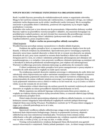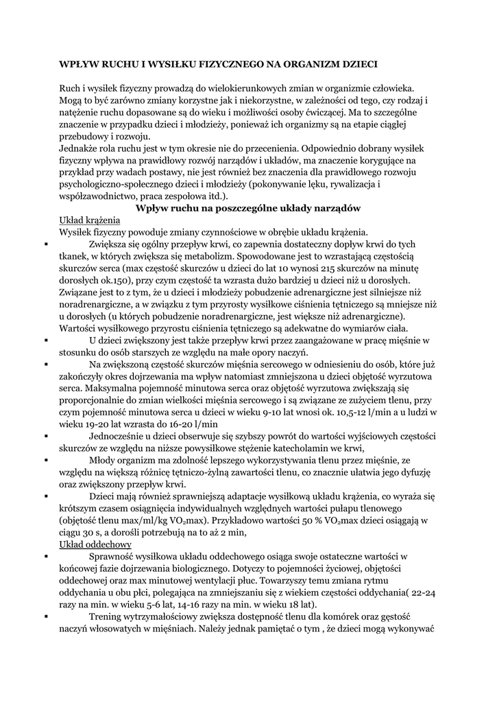 WPŁYW RUCHU I WYSIŁKU FIZYCZNEGO NA ORGANIZM DZIECI Ruch i wysiłek fizyczny prowadzą do wielokierunkowych zmian w organizmie człowieka. Mogą to być zarówno zmiany korzystne jak i niekorzystne, w zależności od tego, czy rodzaj i natężenie ruchu dopasowane są do wieku i możliwości osoby ćwiczącej. Ma to szczególne znaczenie w przypadku dzieci i młodzieży, ponieważ ich organizmy są na etapie ciągłej przebudowy i rozwoju. Jednakże rola ruchu jest w tym okresie nie do przecenienia. Odpowiednio dobrany wysiłek fizyczny wpływa na prawidłowy rozwój narządów i układów, ma znaczenie korygujące na przykład przy wadach postawy, nie jest również bez znaczenia dla prawidłowego rozwoju psychologiczno-społecznego dzieci i młodzieży (pokonywanie lęku, rywalizacja i współzawodnictwo, praca zespołowa itd.). Wpływ ruchu na poszczególne układy narządów Układ krążenia Wysiłek fizyczny powoduje zmiany czynnościowe w obrębie układu krążenia. Zwiększa się ogólny przepływ krwi, co zapewnia dostateczny dopływ krwi do tych tkanek, w których zwiększa się metabolizm. Spowodowane jest to wzrastającą częstością skurczów serca (max częstość skurczów u dzieci do lat 10 wynosi 215 skurczów na minutę dorosłych ok.150), przy czym częstość ta wzrasta dużo bardziej u dzieci niż u dorosłych. Związane jest to z tym, że u dzieci i młodzieży pobudzenie adrenargiczne jest silniejsze niż noradrenargiczne, a w związku z tym przyrosty wysiłkowe ciśnienia tętniczego są mniejsze niż u dorosłych (u których pobudzenie noradrenargiczne, jest większe niż adrenargiczne). Wartości wysiłkowego przyrostu ciśnienia tętniczego są adekwatne do wymiarów ciała. U dzieci zwiększony jest także przepływ krwi przez zaangażowane w pracę mięśnie w stosunku do osób starszych ze względu na małe opory naczyń. Na zwiększoną częstość skurczów mięśnia sercowego w odniesieniu do osób, które już zakończyły okres dojrzewania ma wpływ natomiast zmniejszona u dzieci objętość wyrzutowa serca. Maksymalna pojemność minutowa serca oraz objętość wyrzutowa zwiększają się proporcjonalnie do zmian wielkości mięśnia sercowego i są związane ze zużyciem tlenu, przy czym pojemność minutowa serca u dzieci w wieku 9-10 lat wnosi ok. 10,5-12 l/min a u ludzi w wieku 19-20 lat wzrasta do 16-20 l/min Jednocześnie u dzieci obserwuje się szybszy powrót do wartości wyjściowych częstości skurczów ze względu na niższe powysiłkowe stężenie katecholamin we krwi, Młody organizm ma zdolność lepszego wykorzystywania tlenu przez mięśnie, ze względu na większą różnicę tętniczo-żylną zawartości tlenu, co znacznie ułatwia jego dyfuzję oraz zwiększony przepływ krwi. Dzieci mają również sprawniejszą adaptacje wysiłkową układu krążenia, co wyraża się krótszym czasem osiągnięcia indywidualnych względnych wartości pułapu tlenowego (objętość tlenu max/ml/kg VO2max). Przykładowo wartości 50 % VO2max dzieci osiągają w ciągu 30 s, a dorośli potrzebują na to aż 2 min, Układ oddechowy Sprawność wysiłkowa układu oddechowego osiąga swoje ostateczne wartości w końcowej fazie dojrzewania biologicznego. Dotyczy to pojemności życiowej, objętości oddechowej oraz max minutowej wentylacji płuc. Towarzyszy temu zmiana rytmu oddychania u obu płci, polegająca na zmniejszaniu się z wiekiem częstości oddychania( 22-24 razy na min. w wieku 5-6 lat, 14-16 razy na min. w wieku 18 lat). Trening wytrzymałościowy zwiększa dostępność tlenu dla komórek oraz gęstość naczyń włosowatych w mięśniach. Należy jednak pamiętać o tym , że dzieci mogą wykonywać bez szkody dla zdrowia długotrwałe wysiłki, ale o niezbyt dużej intensywności. Ponadto nie należy obciążać ich zbyt dużą pracą mechaniczną (niewskazane są ćwiczenia siłowe z dużym obciążeniem), z uwagi na mniejszą masę ciała, mniejsze proporcje mięśni i przede wszystkim niższą sprawność glikolizy beztlenowej i sprawności utylizacji glikogenu (dopiero po zakończeniu dojrzewania poprawie ulegają możliwości wykonywania wysiłków beztlenowych), Mechanizmem obronnym przed rozwojem nadmiernej kwasicy metabolicznej u dzieci jest obniżone stężenie katecholamin we krwi a podwyższone stężenie hormonu wzrostu w porównaniu z organizmem osoby dorosłej. Po wysiłku organizm dziecka wykazuje zwiększone zapotrzebowanie na elektrolity, ponieważ zmniejszona jest u nich tolerancja na zmiany równowagi kwasowo-zasadowej, Istotny z punktu widzenia młodych organizmów jest trening kondycyjny, który wpływa na podwyższenie progu zmęczenia mięsni oddechowych i zwiększa zakres i czas trwania wysiłku fizycznego, tolerowany przez organizm, a także zwiększa ruchomość klatki piersiowej. Układ szkieletowy Ruch wpływa na prawidłowe kształtowanie się układu szkieletowego w sposób bezpośredni, ponieważ układ ten jest niejako zaprojektowany do ruchu. Tworzenie struktur kostnych, takich jak beleczki kostne wynika wprost z ruchu, ponieważ ich ułożenie zależy od kierunku sił działających na kość. Jest to wyjątkowo istotne dla osób w wieku rozwojowym, ponieważ jest to okres kształtowania i przebudowy kośćca. Wiele wad czy niedoskonałości w jego budowie można skorygować poprzez odpowiednio dobrany wysiłek fizyczny. Ćwiczenia wpływają też korzystnie na sam proces wzrastania kości u dzieci, poprzez dostarczanie im przez pobudzony układ krwionośny większych ilości minerałów, niezbędnych do budowy kości. Pomaga także w regeneracji kości np. po złamaniach. Utrzymanie odpowiedniego zakresu ruchu w stawach oraz kształtowanie powierzchni stawowych, a także tkanek miękkich okołokostnych takich jak więzadła również uzależnione jest od odpowiednio dobranego wysiłku fizycznego, zwłaszcza w okresie dziecięcym. Umiejętnie prowadzony trening siłowy istotnie poprawia zdolności