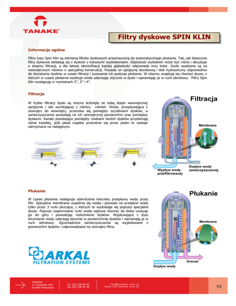 Filtry dyskowe SPIN KLIN Informacje ogólne Filtry typu Spin Klin są odmianą filtrów dyskowych przeznaczoną do automatycznego płukania. Tak, jak klasyczne filtry dyskowe składają się z dysków z łukowymi wyżłobieniami. Głębokość wyżłobień może być różna i decyduje o stopniu filtracji, a dla łatwej identyfikacji każdej głębokości odpowiada inny kolor. Dyski osadzone są na wewnętrznym rdzeniu o specjalnej konstrukcji. Posiada on sprężynę dociskową i tłok hydrauliczny odpowiednio do dociskania dysków w czasie filtracji i luzowania ich podczas płukania. W rdzeniu znajdują się również dysze, z których w czasie płukania wylatuje woda uderzając stycznie w dyski i wprawiając je w ruch obrotowy. Filtry Spin Klin występują w rozmiarach 2”, 3” i 4”. Filtracja W trybie filtracji dyski są mocno ściśnięte ze sobą dzięki wewnętrznej sprężynie i sile wynikającej z różnicy ciśnień. Woda, przepływająca z zewnątrz do wewnątrz, przeciska się pomiędzy szczelinami dysków, a zanieczyszczenia pozostają na ich zewnętrznej powierzchni oraz pomiędzy dyskami. Kanały powstające pomiędzy rowkami dwóch dysków przybierają różne kształty, jeśli jakaś cząstka przeciśnie się przez jeden to zostaje zatrzymana na następnym. Płukanie W czasie płukania następuje odwrócenie kierunku przepływu wody przez filtr. Specjalna membrana wypełnia się wodą i pozwala na przepływ wody tylko przez 3 rurki płuczące, z których to wydostaje się poprzez specjalne dysze. Poprzez wspomniane rurki woda wpływa również do tłoka unosząc go do góry i powodując rozluźnienie dysków. Wypływające z dysz strumienie wody uderzają stycznie w powierzchnię dysków i wprawiają je w ruch obrotowy. Zgromadzone zanieczyszczenia są wypłukiwane z powierzchni dysków i odprowadzane na zewnątrz filtra. TANAKE ul. Puławska 426 02-884 Warszawa tel. (22) 336 90 40 fax (22) 336 90 49 nts @ta nake .com .pl w w w. n t s . t a n a k e . c o m . p l 1/2 Zestawy filtrów Często spotyka się łączenie Spin Klin-ów w zestawy po kilka filtrów. Dzięki temu, możemy dopasować wydajność układu do potrzeb każdej konkretnej instalacji. Połączenie filtrów w zestaw daje nam dodatkowo możliwość wykorzystania czystej wody filtrowanej przez jeden z filtrów do płukania drugiego z filtrów. Rysunek obok przedstawia przykładową konfigurację dwóch filtrów 2”, w tym przypadku z automatycznymi zaworami płuczącymi typu BERMAD 2”x2”x2”. Taki zestaw oznaczany jest symbolem: SK 2 x 2” . Podczas filtracji woda przepływa równolegle przez dwa filtry. W trybie płukania woda jest filtrowana przez jeden z filtrów i podawana w odwrotnym kierunku na drugi. Zanieczyszczenia odprowadzane są rurociągiem do kanalizacji. Po zakończeniu płukania jednego filtra następuje przestawienie zaworów trójdrogowych i płukany jest drugi z nich. Po skończonym procesie płukania zestaw przechodzi w stan normalnej pracy, czyli filtrowania. Dane techniczne Stopnie filtracji Kolor dysków Liczba MESH Niebieski 40 Żółty 80 Czerwony 120 Czarny 140 Zielony 200 Szary 600 400 200 130 100 55 20 4 3 Liczba mikronów Maksymalne przepływy dla zestawów filtrów Typ filtra Liczba filtrów Stopień filtracji 40-140 200 600 Spin Klin 2” 1 2 3 Spin Klin 3“ 4 5 3 do 20 do 13 do 6.5 do 40 do 26 do 15 Maksymalny przepływ [m /h] od 5 do 60 od 55 do 80 do 90 od 85 do 120 od 20 do 40 od 35 do 53 do 60 od 55 do 80 od 10 do 23 od 20 do 32 do 30 od 25 do 40 od 115 do 150 od 75 do 100 od 35 do 50 TANAKE ul. Puławska 426 02-884 Warszawa tel. (22) 336 90 40 fax (22) 336 90 49 nts @ta nake .com .pl w w w. n t s . t a n a k e . c o m . p l 2/2