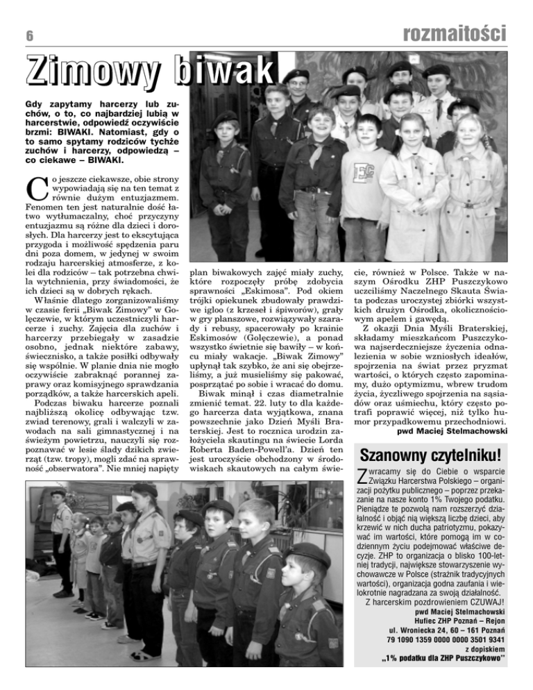 6 Zimowy biwak rozmaitoci Gdy zapytamy harcerzy lub zuchów, o to, co najbardziej lubi¹ w harcerstwie, odpowied oczywicie brzmi: BIWAKI. Natomiast, gdy o to samo spytamy rodziców tych¿e zuchów i harcerzy, odpowiedz¹ co ciekawe BIWAKI. C o jeszcze ciekawsze, obie strony wypowiadaj¹ siê na ten temat z równie du¿ym entuzjazmem. Fenomen ten jest naturalnie doæ ³atwo wyt³umaczalny, choæ przyczyny entuzjazmu s¹ ró¿ne dla dzieci i doros³ych. Dla harcerzy jest to ekscytuj¹ca przygoda i mo¿liwoæ spêdzenia paru dni poza domem, w jedynej w swoim rodzaju harcerskiej atmosferze, z kolei dla rodziców tak potrzebna chwila wytchnienia, przy wiadomoci, ¿e ich dzieci s¹ w dobrych rêkach. W ³anie dlatego zorganizowalimy w czasie ferii Biwak Zimowy w Golêczewie, w którym uczestniczyli harcerze i zuchy. Zajêcia dla zuchów i harcerzy przebiega³y w zasadzie osobno, jednak niektóre zabawy, wiecznisko, a tak¿e posi³ki odbywa³y siê wspólnie. W planie dnia nie mog³o oczywicie zabrakn¹æ porannej zaprawy oraz komisyjnego sprawdzania porz¹dków, a tak¿e harcerskich apeli. Podczas biwaku harcerze poznali najbli¿sz¹ okolicê odbywaj¹c tzw. zwiad terenowy, grali i walczyli w zawodach na sali gimnastycznej i na wie¿ym powietrzu, nauczyli siê rozpoznawaæ w lesie lady dzikich zwierz¹t (tzw. tropy), mogli zdaæ na sprawnoæ obserwatora. Nie mniej napiêty plan biwakowych zajêæ mia³y zuchy, które rozpoczê³y próbê zdobycia sprawnoci Eskimosa. Pod okiem trójki opiekunek zbudowa³y prawdziwe igloo (z krzese³ i piworów), gra³y w gry planszowe, rozwi¹zywa³y szarady i rebusy, spacerowa³y po krainie Eskimosów (Golêczewie), a ponad wszystko wietnie siê bawi³y w koñcu mia³y wakacje. Biwak Zimowy up³yn¹³ tak szybko, ¿e ani siê obejrzelimy, a ju¿ musielimy siê pakowaæ, posprz¹taæ po sobie i wracaæ do domu. Biwak min¹³ i czas diametralnie zmieniæ temat. 22. luty to dla ka¿dego harcerza data wyj¹tkowa, znana powszechnie jako Dzieñ Myli Braterskiej. Jest to rocznica urodzin za³o¿yciela skautingu na wiecie Lorda Roberta Baden-Powella. Dzieñ ten jest uroczycie obchodzony w rodowiskach skautowych na ca³ym wie- cie, równie¿ w Polsce. Tak¿e w naszym Orodku ZHP Puszczykowo uczcilimy Naczelnego Skauta wiata podczas uroczystej zbiórki wszystkich dru¿yn Orodka, okolicznociowym apelem i gawêd¹. Z okazji Dnia Myli Braterskiej, sk³adamy mieszkañcom Puszczykowa najserdeczniejsze ¿yczenia odnalezienia w sobie wznios³ych idea³ów, spojrzenia na wiat przez pryzmat wartoci, o których czêsto zapominamy, du¿o optymizmu, wbrew trudom ¿ycia, ¿yczliwego spojrzenia na s¹siadów oraz umiechu, który czêsto potrafi poprawiæ wiêcej, ni¿ tylko humor przypadkowemu przechodniowi. pwd Maciej Stelmachowski Szanowny czytelniku! siê do Ciebie o wsparcie Zzacjiwracamy Zwi¹zku Harcerstwa Polskiego organipo¿ytku publicznego poprzez przeka- zanie na nasze konto 1% Twojego podatku. Pieni¹dze te pozwol¹ nam rozszerzyæ dzia³alnoæ i obj¹æ ni¹ wiêksz¹ liczbê dzieci, aby krzewiæ w nich ducha patriotyzmu, pokazywaæ im wartoci, które pomog¹ im w codziennym ¿yciu podejmowaæ w³aciwe decyzje. ZHP to organizacja o blisko 100-letniej tradycji, najwiêksze stowarzyszenie wychowawcze w Polsce (stra¿nik tradycyjnych wartoci), organizacja godna zaufania i wielokrotnie nagradzana za swoj¹ dzia³alnoæ. Z harcerskim pozdrowieniem CZUWAJ! pwd Maciej Stelmachowski Hufiec ZHP Poznañ Rejon ul. Wroniecka 24, 60 161 Poznañ 79 1090 1359 0000 0000 3501 9341 z dopiskiem ,,1% podatku dla ZHP Puszczykowo