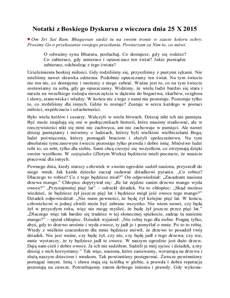Notatki z Boskiego Dyskursu z wieczora dnia 25 X 2015 ♥ Om Sri Sai Ram. Bhagawan siedzi tu na swoim tronie w szacie koloru ochry. Prosimy Go o przekazanie swojego przesłania. Powtarzam za Nim to, co mówi. O odważny synu Bharatu, posłuchaj. Co dostajesz, gdy się rodzisz? Co zabierasz, gdy umierasz i opuszczasz ten świat? Jakie pieniądze zabierasz, odchodząc z tego świata? Ucieleśnienia boskiej miłości. Gdy rodziliśmy się, przyszliśmy z pustymi rękami. Nie mieliśmy nawet skrawka odzienia. Podobnie opuszczamy ten świat. Na tym świecie nie ma nic, co dostajemy i możemy z niego zabrać. Ważne jest to, co na tym świecie zostawiamy za sobą, gdy go opuszczamy. Widzimy, że wielu ludzi bardzo się stara i naraża na wszelkiego rodzaju nieszczęścia w dążeniu do bogactwa, skarbów, rozgłosu i sławy, stanowiska i władzy. W końcu nic z tego z nami nie pozostaje. Pozostaje tylko to, co zrobiliśmy dla innych. Gdzie to zostaje? Zostaje w sercu każdego w postaci miłości, współczucia i szlachetności. Było wielu królów i cesarzy. Walczyli w wielu bitwach. Dzisiaj nikt ich nie pamięta. Być może znajdują się oni w podręcznikach historii, które musimy studiować, ale w rzeczywistości nikt się nimi nie zachwyca, ani nie zachowuje w pamięci. Ale nawet dzisiaj pamiętamy i mówimy o ludziach, którzy byli wielkimi wielbicielami Boga, ludzi poświęcenia, którzy pomagali braciom i służyli społeczeństwu. Na tym absolutnie tymczasowym świecie pozostaje tylko prawda i dobre imię. Mnóstwo ludzi robi to, co robi, tylko dla siebie. Sami chcą cieszyć się wszystkim, co otrzymają dzięki swoim wysiłkom. W satjajudze (Złotym Wieku) będziecie mieli poczucie, że musicie pracować dla innych. Pewnego dnia, kiedy starszy człowiek w swoim ogrodzie sadził nasiona, przyszedł do niego wnuk. Jak każde dziecko zaczął zadawać dziadkowi pytania: „Co robisz? Dlaczego to robisz? Co z tego będziesz miał?” On odpowiedział: „Zasadzam nasiona drzewa mango.” Chłopiec dopytywał się: „Ile lat zejdzie zanim drzewo mango wyda owoce?” „Przynajmniej pięć lat” – odrzekł dziadek. Na to chłopiec: „Skąd możesz wiedzieć, że będziesz żył jeszcze pięć lat i będziesz mógł jeść owoce tego mango?” Dziadek odpowiedział: „Nie mam pewności, że będę żył kolejne pięć lat. W końcu, człowiekowi w jednej chwili może być zabrane wszystko. Nie wiem nawet, czy będę żył w przyszłym roku, więc nie mogę myśleć, że będę żył jeszcze przez pięć lat.” „Dlaczego więc tak bardzo się trudzisz w tej słonecznej spiekocie, sadząc tu nasienie mango?” – spytał chłopiec. Dziadek wyjaśnił: „Nie robię tego dla siebie. Pragnę tylko, abyś, gdy to drzewo urośnie i wyda owoce, ty jadł je i pomyślał o mnie. Po to to robię. Wtedy z wielkim szacunkiem dla mnie będziesz mówił, że drzewo to posadził twój dziadek. Nie jest ważne, czy będę żył, czy nie, czy będę jadł z tego drzewa, czy nie, mnie wystarczy, że ty będziesz jadł te owoce. W naszym ogrodzie jest dużo drzew. Dają nam cień i dobre owoce. Ja ich nie sadziłem. Sadzili je mój ojciec i dziadek, a my dzisiaj z nich korzystamy.” Tak więc, nasiona, które zasiewamy, wyrastają na drzewa i służą naszym dzieciom i wnukom. Tak powinniśmy postępować. Zawsze powinniśmy pomagać innym. Imię i sława stają się ściółką w glebie, a prawda i dobra reputacja pozostają na zawsze. Potrzebujemy zatem dobrego imienia i prawdy. Gdy wykonu- jemy dobrą pracę, nikt o nas nie zapomina. Ludzie nie zapominają o nas nawet gdy dokonujemy złych czynów. Zawsze powinniśmy dążyć do tego, by ludzie pamię tali nas ze względu na dobre czyny. Czym jest dobry czyn? Dobry czyn to działanie, w które angażujemy się w celu pomagania innym. Pomaganie innym jest punją (zasługą), wartością. Gdy pomagamy innym, ludzie, którym pomogliśmy, pomogą też innym. W taki sposób pomaganie ciągle zatacza coraz szersze kręgi. Ishwar Chandra był wielkim człowiekiem. W Kalkucie założył placówkę oświatową i przyjmował do niej dzieci z biednych rodzin, by im pomóc. Zdarzyło się, że pewien chłopiec nie miał pieniędzy na opłatę swojej nauki. Ponieważ nie zapłacił, dyrektor wykreślił jego nazwisko z rejestru. Chłopiec siedział pod szkołą i płakał. Ishwar Chandra przechodził tamtędy i, zobaczywszy go, zapytał dlaczego płacze. Chłopiec odpowiedział: „Nie mogłem zapłacić czesnego, gdyż jesteśmy bardzo biedni. Zostałem skreślony z listy uczniów, dlatego płaczę.” Wtedy Ishwar Chandra powiedział: „Nie martw się. Przyjdź jutro do szkoły – ja zajmę się twoim czesnym.” Sam zapłacił czesne i zadbał, by chłopiec mógł kontynuować naukę. Później uszczęśliwiony chłopiec przyszedł do Ishwara Chandry i oswiadczył: „Proszę pana, bardzo mi pan pomógł. Proszę powiedzieć, jak ja mogę panu pomóc.” Na to Ishwar Chandra stwierdził: „Mój chłopcze, ja straciłem ojca bardzo wcześnie i ciągle musiałem dokładać wielkich starań, aby zapłacić czesne. W końcu, gdy nie zapłaciłem, wykreślono mnie z listy uczniów. Gdy siedząc pod szkołą płakałem, jeden z nauczycieli podszedł do mnie, pocieszył i także zapłacił moje czesne. Podobnie jak ty, poszedłem do niego i spytałem: ‘Uregulował pan moje opłaty. Co mogę zrobić dla pana?’ Nauczyciel odrzekł: ‘Nie musisz nic dla mnie robić. Gdy ktoś inny znajdzie się w sytuacji podobnej do twojej, musisz uregulować jego opłaty. Przysługę, jaką zrobił mi tamten nauczyciel, odwzajemniam opłacając twoją naukę. Dzisiaj masz dług. Gdy sam będziesz mógł zarabiać pieniądze i zapłacić czesne jakiegoś innego dziecka w sytuacji podobnej do twojej obecnie, będziesz spłacał ten dług.’” Ja nie potrzebuję niczego dla siebie. Mam wszystko. Jeśli jutro w taki sposób pomożecie komuś, uszczęśliwicie go. Gdy w sw