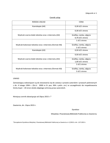 Załącznik nr 1 Cennik usług RODZAJ USŁUGI CENA Kserokopie (A4) 0,30 zł/1 strona 0,30 zł/1 strona Wydruki czarno-białe tekstów oraz z internetu (A4) Grafika, ramka, zdjęcia 0,70 zł/1 strona 1 zł/1 strona Wydruki kolorowe tekstów oraz z internetu (format A4) Grafika, ramka, zdjęcia 2 zł/1 strona 0,50 zł/1 strona Kserokopie (A3) 0,50 zł/1 strona Wydruki czarno-białe tekstów oraz z internetu (A3) Grafika, ramka, zdjęcia 1,00 zł/1 strona 2 zł/1 strona Wydruki kolorowe tekstów oraz z internetu (format A3) Grafika, ramka, zdjęcia 3 zł/1 strona UWAGI Zamawiający zobowiązani są do stosowania się do ustawy o prawie autorskim i prawach pokrewnych z dn. 4 lutego 1994 r. (Dz.U. 2000 nr 8- poz. 904 z późn. zm.) w szczególności do respektowania limitu kopii – 20 stron dzieła objętego ochroną praw autorskich. Niniejszy cennik obowiązuje od 1lipca 2015 r.* Zawiercie, dn. 1lipca 2015 r. Dyrektor Miejskiej i Powiatowej Biblioteki Publicznej w Zawierciu *Zarządzenie Dyrektora Miejskiej i Powiatowej Biblioteki Publicznej w Zawierciu nr 2/2015 z dn. 1.07.2015 r. Załącznik nr 2 Cennik regulaminowych opłat bibliotecznych RODZAJ OPŁATY OPŁATA Kaucja zwrotna 30,00 zł/ 1 wol. lub równowartość książki Wydanie ponowne karty bibliotecznej 5 zł Upomnienie (bez względu na formę: pisemną – 2 zł listową bądź telefoniczną). Opłata za nieterminowy zwrot wypożyczonych 1 zł / 1 wol. / 1 miesiąc materiałów bibliotecznych Zniszczenie, uszkodzenie, utrata materiałów Należność szacunkowa wg wartości szkody nie mniej niż aktualna wartość rynkowa bibliotecznych zagubionego materiału Zniszczenie kodu kreskowego na materiałach 1 zł bibliotecznych Niniejszy cennik obowiązuje od 1lipca 2015 r.* Zawiercie, dn. 1lipca 2015 r. Dyrektor Miejskiej i Powiatowej Biblioteki Publicznej w Zawierciu *Zarządzenie Dyrektora Miejskiej i Powiatowej Biblioteki Publicznej w Zawierciu nr 2/2015 z dn.1.07.2015 r.