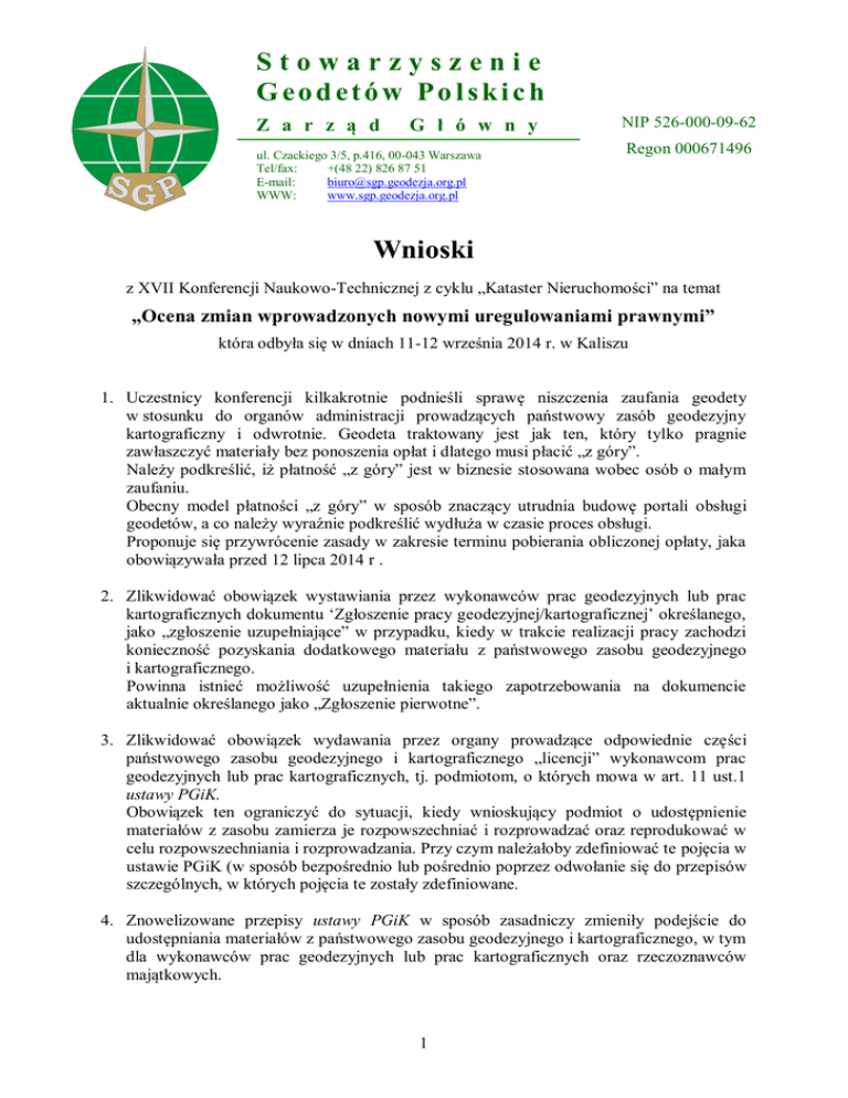 Stowarzyszenie Geodetów Polskich Z a r z ą d G ł ó w n y ul. Czackiego 3/5, p.416, 00-043 Warszawa Tel/fax: +(48 22) 826 87 51 E-mail: [email protected] WWW: www.sgp.geodezja.org.pl NIP 526-000-09-62 Regon 000671496 Wnioski z XVII Konferencji Naukowo-Technicznej z cyklu „Kataster Nieruchomości” na temat „Ocena zmian wprowadzonych nowymi uregulowaniami prawnymi” która odbyła się w dniach 11-12 września 2014 r. w Kaliszu 1. Uczestnicy konferencji kilkakrotnie podnieśli sprawę niszczenia zaufania geodety w stosunku do organów administracji prowadzących państwowy zasób geodezyjny kartograficzny i odwrotnie. Geodeta traktowany jest jak ten, który tylko pragnie zawłaszczyć materiały bez ponoszenia opłat i dlatego musi płacić „z góry”. Należy podkreślić, iż płatność „z góry” jest w biznesie stosowana wobec osób o małym zaufaniu. Obecny model płatności „z góry” w sposób znaczący utrudnia budowę portali obsługi geodetów, a co należy wyraźnie podkreślić wydłuża w czasie proces obsługi. Proponuje się przywrócenie zasady w zakresie terminu pobierania obliczonej opłaty, jaka obowiązywała przed 12 lipca 2014 r . 2. Zlikwidować obowiązek wystawiania przez wykonawców prac geodezyjnych lub prac kartograficznych dokumentu ‘Zgłoszenie pracy geodezyjnej/kartograficznej’ określanego, jako „zgłoszenie uzupełniające” w przypadku, kiedy w trakcie realizacji pracy zachodzi konieczność pozyskania dodatkowego materiału z państwowego zasobu geodezyjnego i kartograficznego. Powinna istnieć możliwość uzupełnienia takiego zapotrzebowania na dokumencie aktualnie określanego jako „Zgłoszenie pierwotne”. 3. Zlikwidować obowiązek wydawania przez organy prowadzące odpowiednie części państwowego zasobu geodezyjnego i kartograficznego „licencji” wykonawcom prac geodezyjnych lub prac kartograficznych, tj. podmiotom, o których mowa w art. 11 ust.1 ustawy PGiK. Obowiązek ten ograniczyć do sytuacji, kiedy wnioskujący podmiot o udostępnienie materiałów z zasobu zamierza je rozpowszechniać i rozprowadzać oraz reprodukować w celu rozpowszechniania i rozprowadzania. Przy czym należałoby zdefiniować te pojęcia w ustawie PGiK (w sposób bezpośrednio lub pośrednio poprzez odwołanie się do przepisów szczególnych, w których pojęcia te zostały zdefiniowane. 4. Znowelizowane przepisy ustawy PGiK w sposób zasadniczy zmieniły podejście do udostępniania materiałów z państwowego zasobu geodezyjnego i kartograficznego, w tym dla wykonawców prac geodezyjnych lub prac kartograficznych oraz rzeczoznawców majątkowych. 1 Obecny model polegający na opłacie za każdy pobrany fragment zasobu będzie prowadził (i już prowadzi) do minimalizacji zakresu pobieranych danych. Dotyczy to zwłaszcza materiałów stanowiących operaty techniczne zaewidencjonowane w państwowym zasobie geodezyjnym i kartograficznym. Taki minimalizm wpłynie w sposób znaczący na jakość prac geodezyjnych. Jedynym racjonalnym rozwiązaniem jest wprowadzenie zasady „obiektowej” za udostępniany materiału zasobu - baz danych, o których mowa w art. 4 ust. 1a ustawy PGiK. Zasada ‘obiektowa’ jest najprostsza, jednoznaczna w każdej sytuacji (nie wymaga interpretacji), łatwa w zastosowaniu i umożliwia maksymalną automatyzację obsługi państwowego zasobu geodezyjnego i kartograficznego. Proponuje się wprowadzić, jako jednostkę rozliczeniową „obiekt”, a mianowicie: a) ‘Obiekt punktowy’ (np. Punkt graniczny, Punkt Osnowy geodezyjnej, Studzienka kanalizacyjna itd), b) ‘Obiekt liniowy’ (np. Krawężnik, Przewód uzbrojenia terenu, Krawężnik itd), c) ‘Obiekt powierzchniowy’ (np. Działka, Zbiornik, Szuwary itd), d) ‘Obiekt informacyjny’ (np. Lokal, Osoba, Adres itd) e) ‘Obiekt dokument’ (np. plik referencyjny) Ewentualne zróżnicowanie stawek jednostkowych dla zaproponowanych rodzajów obiektów powinno nastąpić w wyniku szczegółowej analizy kalkulacyjnej. Zasada ‘obiektowa’ jednoznacznie rozwiązuje między innymi dzisiejszy poważny problem przy obliczeniu opłaty za udostępnienie wykonawcy pracy geodezyjnej zbioru danych GESUT z bazy danych GESUT (bo jak obecnie np. określić ilość jednostek w ha, gdy w ramach jednego zgłoszenia pracy geodezyjnej dotyczącej pomiaru powykonawczego zostają objęte dwa przyłącza odległe od siebie w znaczący sposób). Proponuje się natomiast pozostawić jednostkę rozliczeniowa (obszarową) typu „ha”, „km2” dla materiałów zasobu w postaci analogowej (także rastrowej). 5. Wiele kontrowersji budzi wydawanie osnów geodezyjnych. Sprzedaż praw do wykorzystania punktu osnowy, którego nie ma w terenie budzi duże obawy natury prawnej i moralnej. Tym bardziej, że ustawodawca nie przewidział łatwej ścieżki zwrotu pieniędzy czy choćby zamiany punktu na inny. Takie postępowania podważa zaufanie obywatela do państwa. Należy podkreślić, że sytuacja się pogorszy, gdyż wykonawca może być zmuszony do zakupu opisu topograficznego (Tabela 5 poz. 3 załącznika do ustawy PGiK) jeśli chce tylko współrzędne (Tabela 5 poz. 2 załącznika do ustawy PGiK) Nie mając opisu nie będzie mógł udokumentować stwierdzonych w terenie zmian/stanu znaku 6. Powierzchnie użytkowe są ważną daną ewidencyjną dla budynku i lokalu. Powierzchnie użytkowe budynków są podstawą naliczania podatku od nieruchomości. Są też podstawą prac wykonywanych przez rzeczoznawców majątkowych. Z uwagi na dokładność, z jaką należy wykonać pomiar, postuluje się, aby prace te mogły być wykonywane również przez geodetów posiadających uprawnienia zawodowe w dziedzinie geodezji i kartografii. Należy w tym zakresie wprowadzić odpowiednie zapisy do przepisów prawa, z których by wynikała możliwość wykonywania tych prac przez geodetów uprawnionych. 2 7. Należy wprowadzić do przepisów prawa zapis, z którego wynikałoby, że wiaty nie